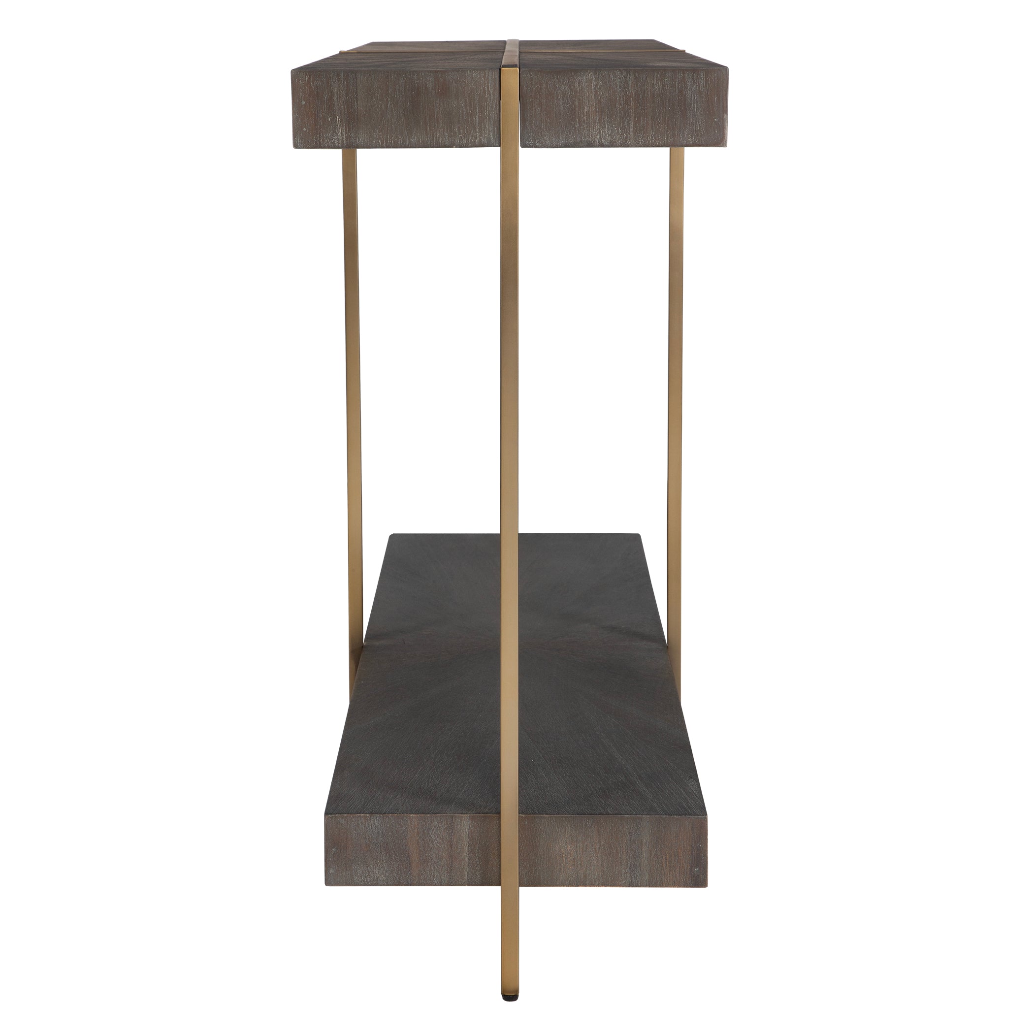 - Finish/Frame Description: Contemporary In Style, This Console Table Features A Stainless Steel Framework Finished In A Brushed Brass With A Starburst Acacia Veneer Top In A Dark Walnut Stain Washed With A Light Gray Glaze.