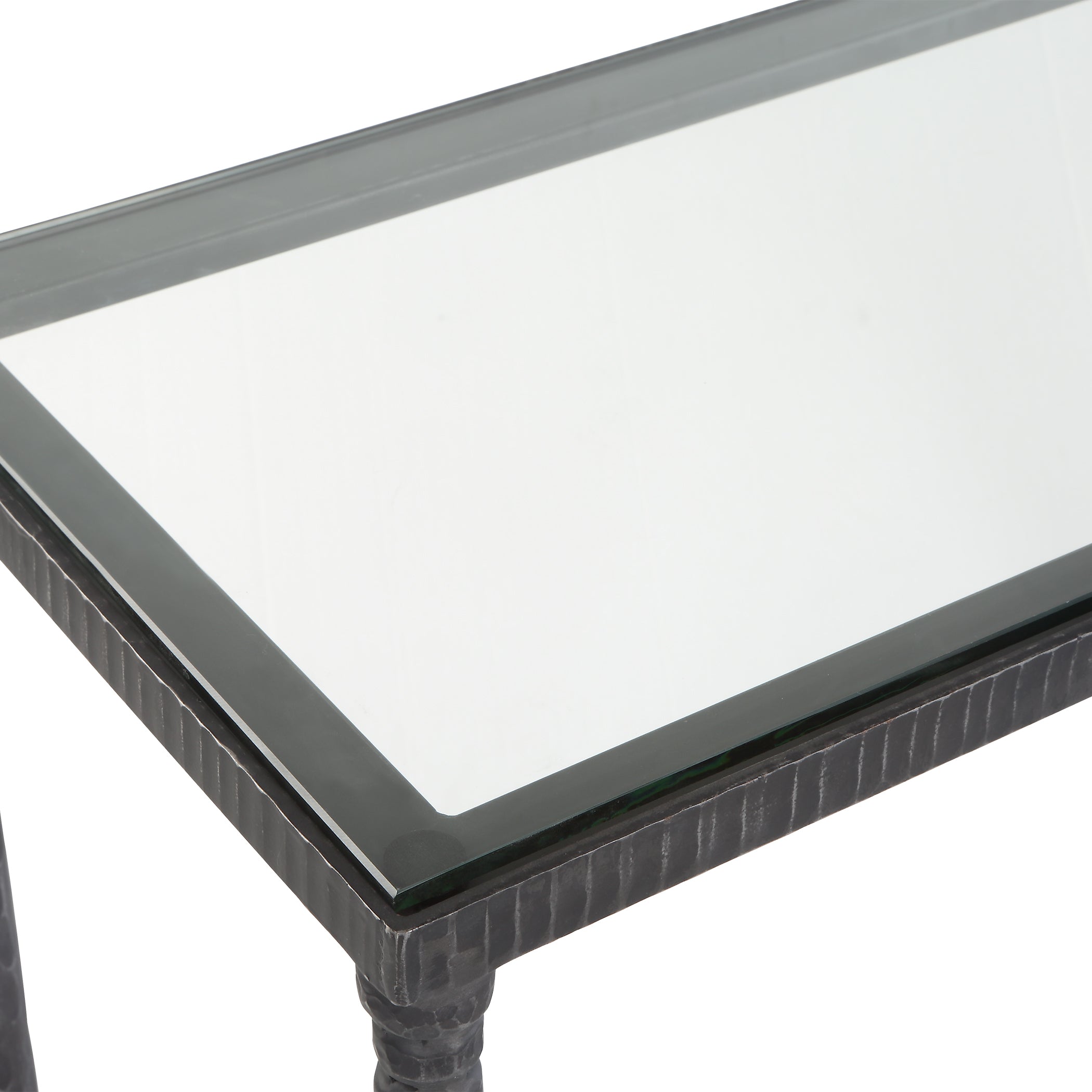 - Finish/Frame Description: Crafted From Solid Iron, The Washington Console Is Finished In A Natural Rustic Black With Chiseled Details And Aged Distressing. Topped With Clear Tempered Glass.