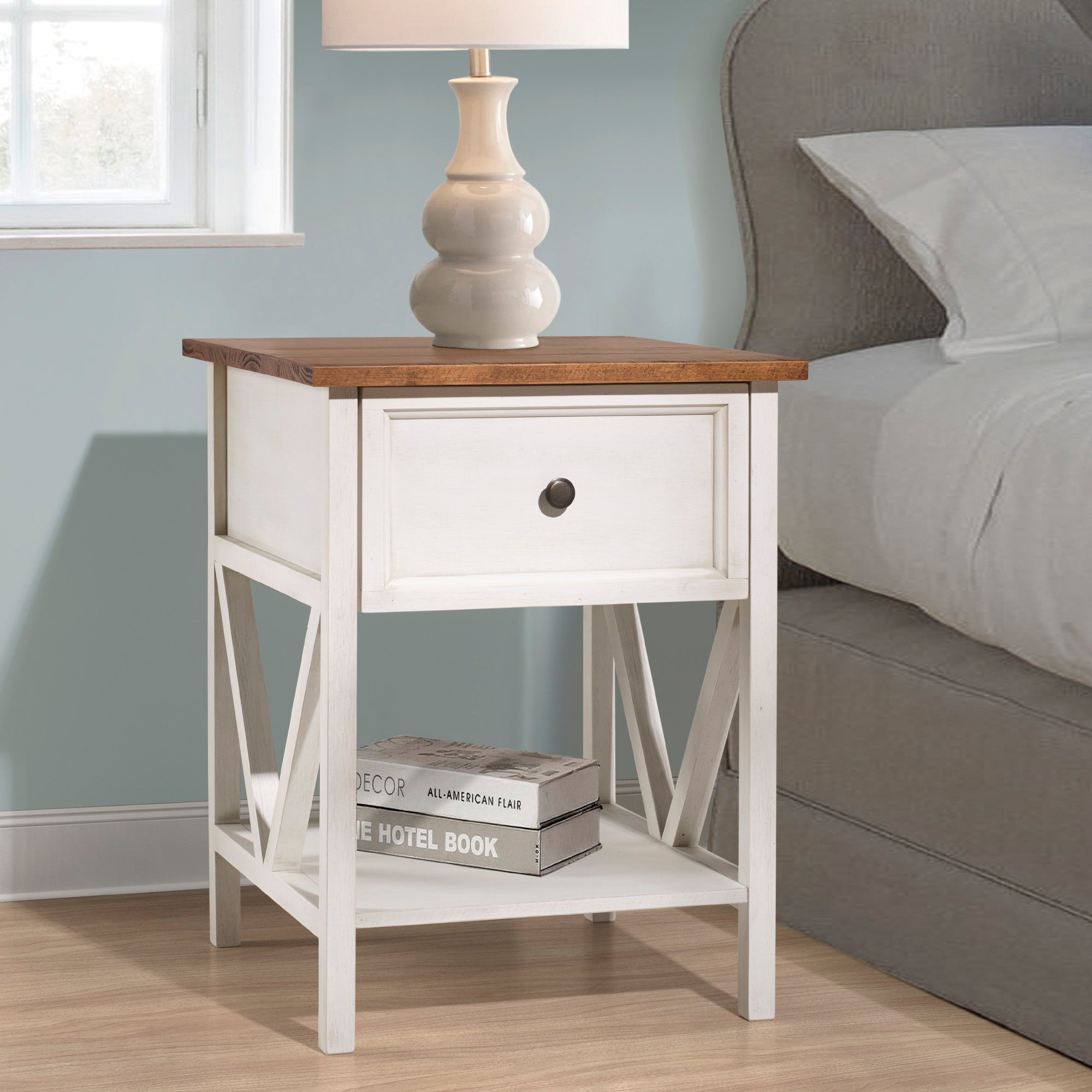 Sounds of the lapping waves will be nearly audible with this coastal side table. Every day you will feel the impulse to pull on your suit and go for a swim because of the distressed wood top and inverted A-frame lower shelf. Use the one drawer to keep sunscreen, towels, and other beach essentials ready for any spontaneous trip inspired by this solid wood nightstand.