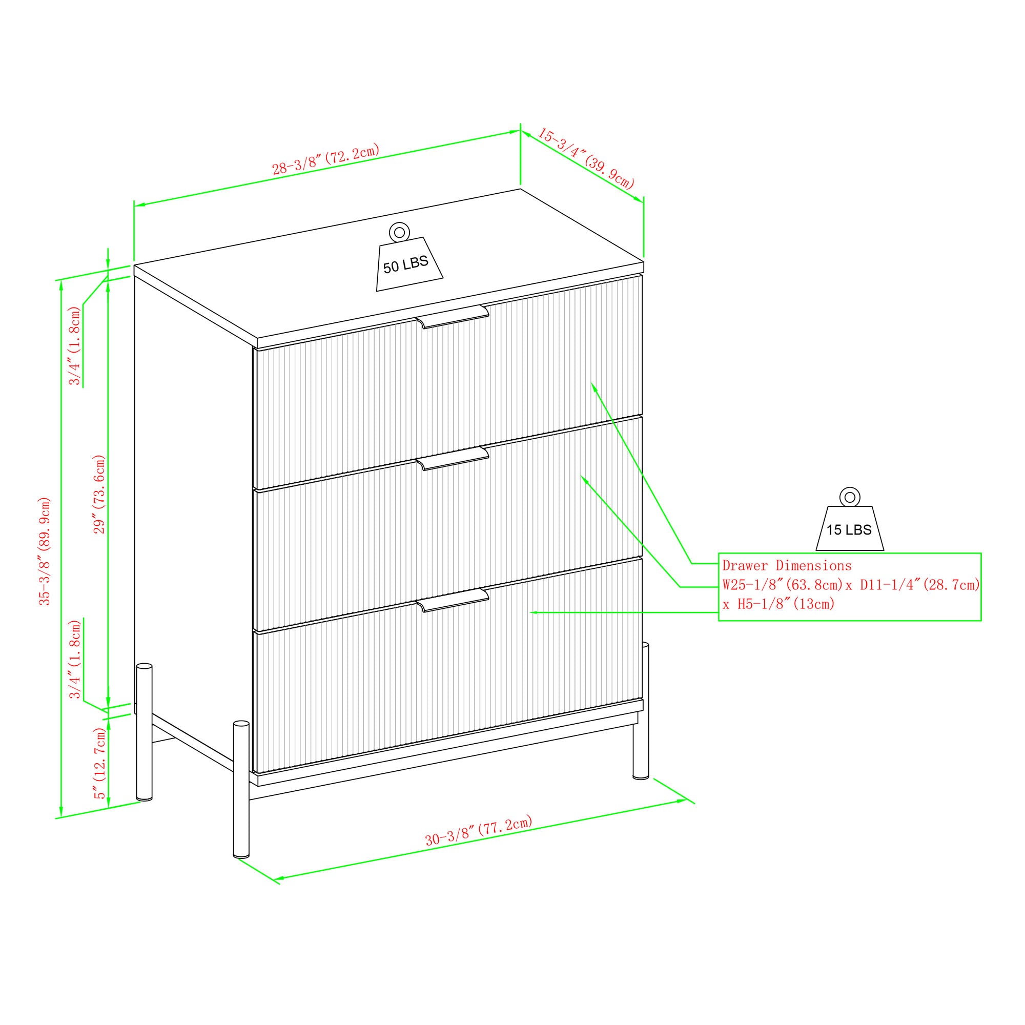 - Dimensions: PRSB3BBL2 3 Drawer Chest with Reeded Drawer Fronts - 35.38" H x 30.38" L x 15.75" W