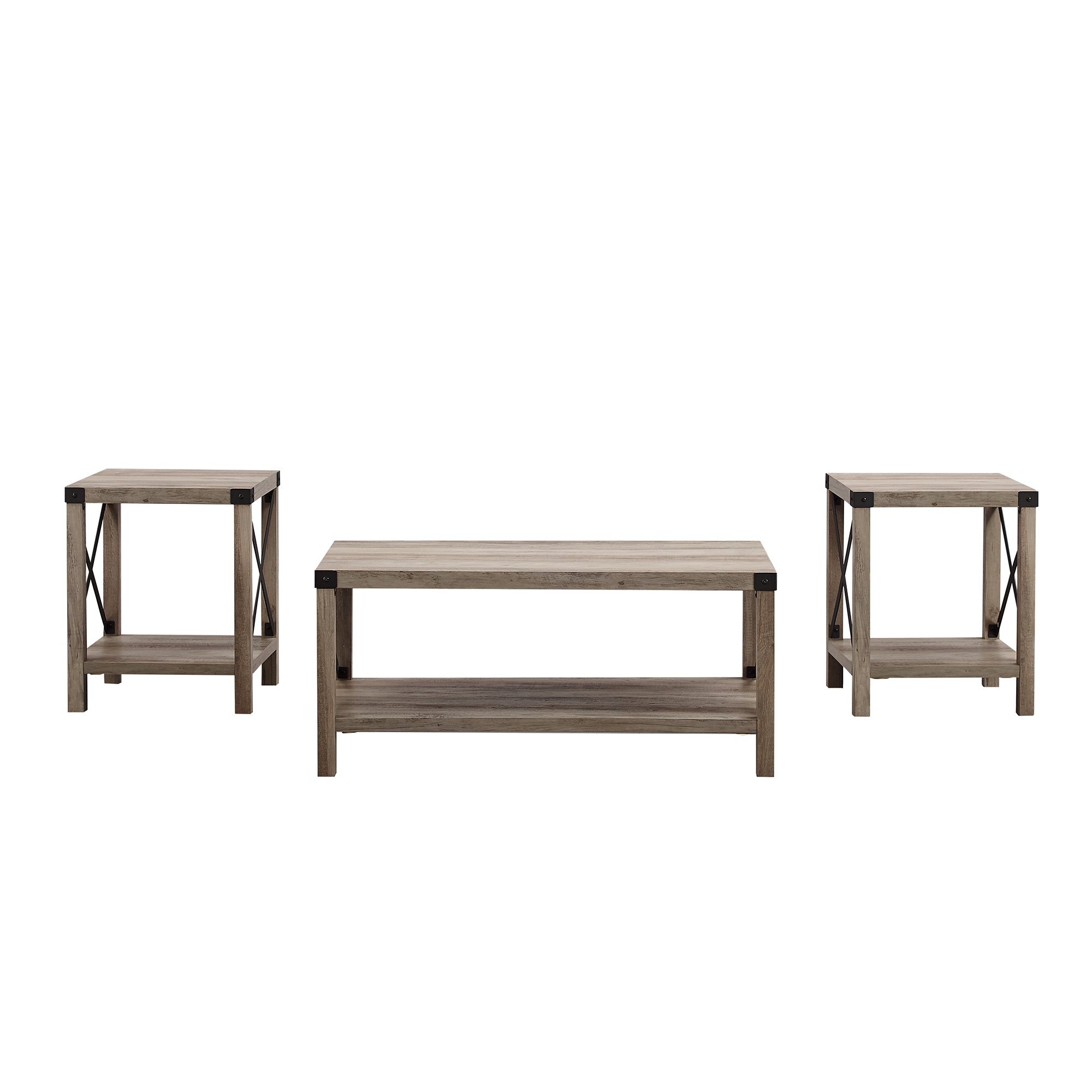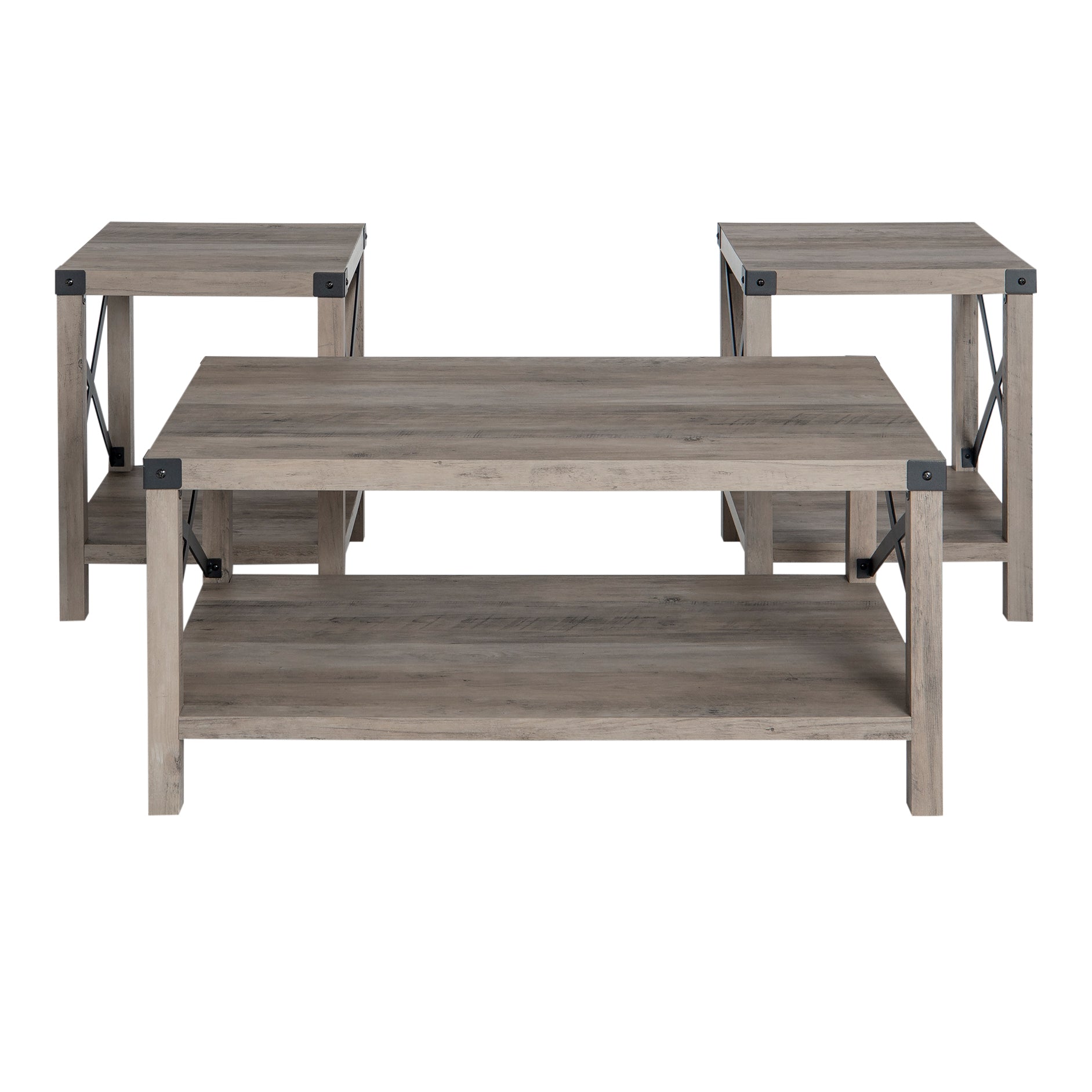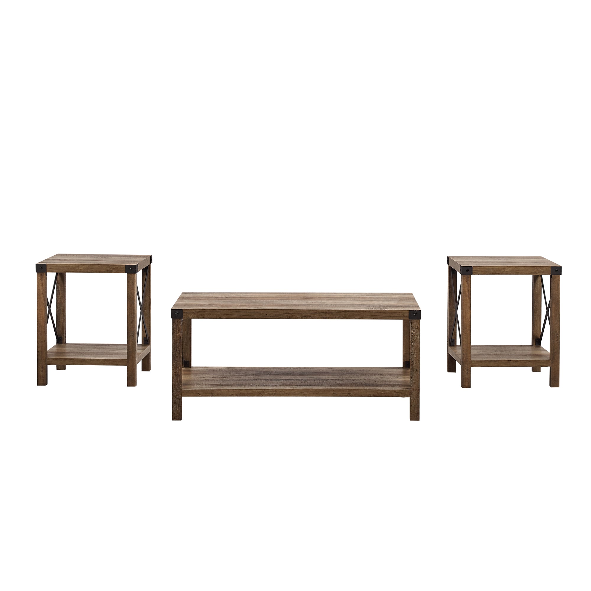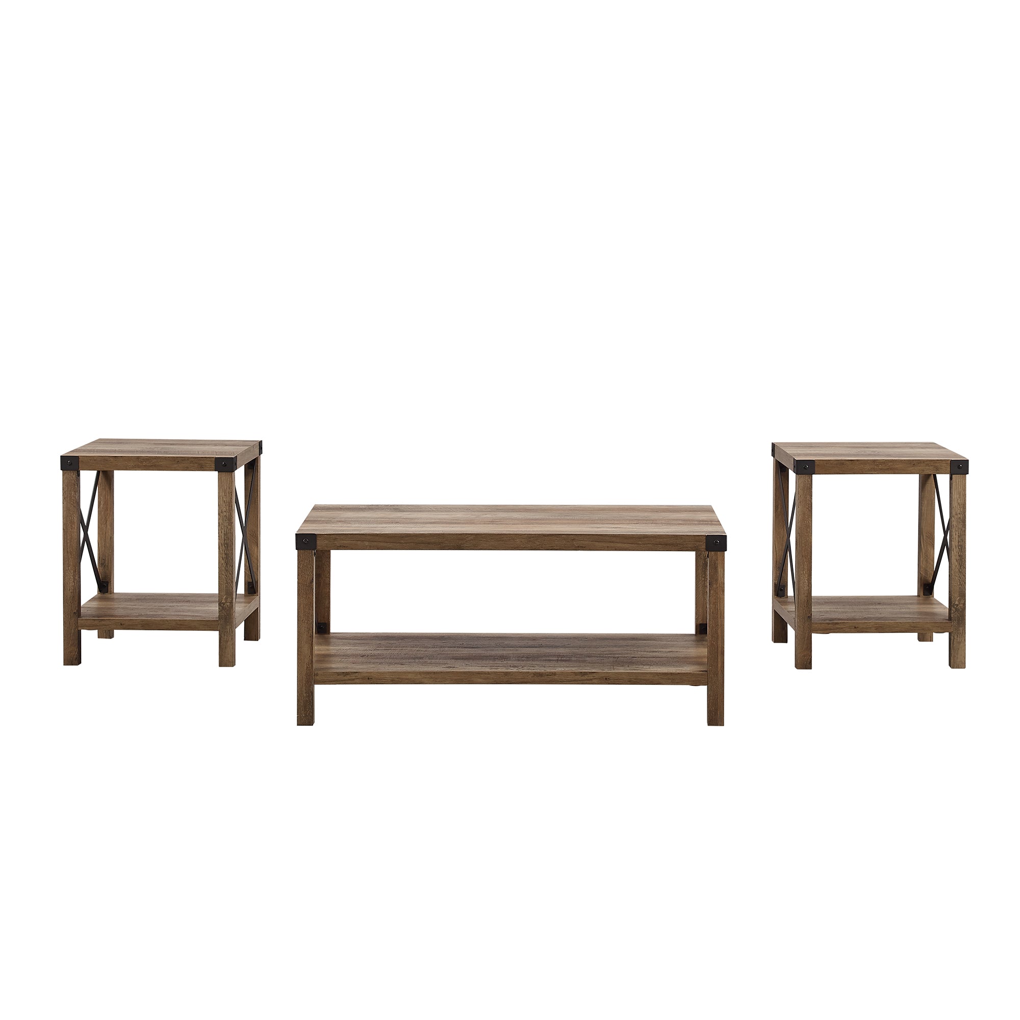 Lasso an industrial farmhouse feel into your home with this wood and metal accent three-piece table set. Mixed materials come together to deliver a rustic personality full of dynamic details. Both the rectangular coffee table and square side tables have lower shelves and feature metal X accents on two of their sides while metal brackets embrace the four top corners of each table. This set includes two side tables and one coffee table.
