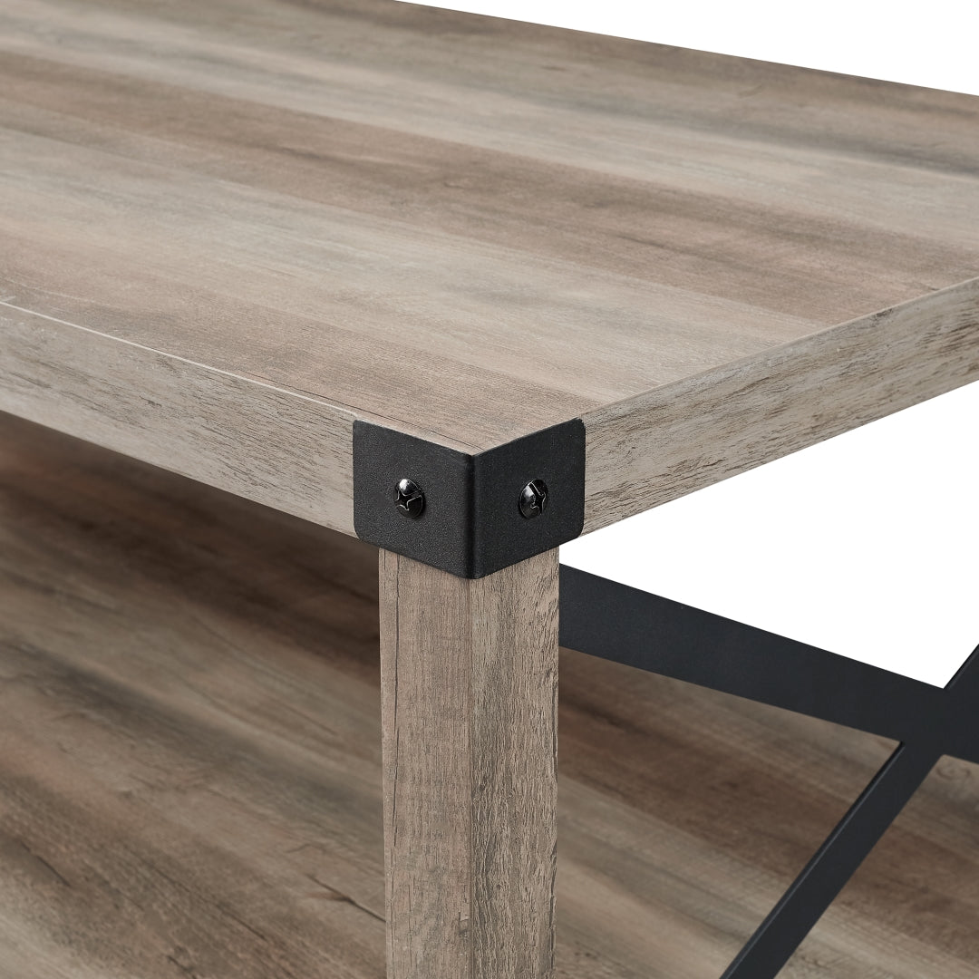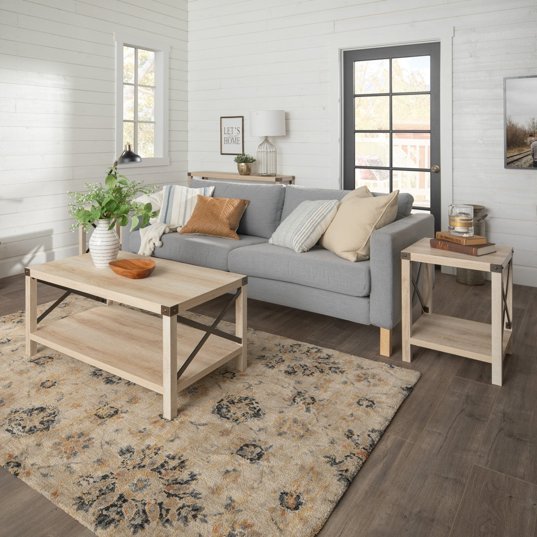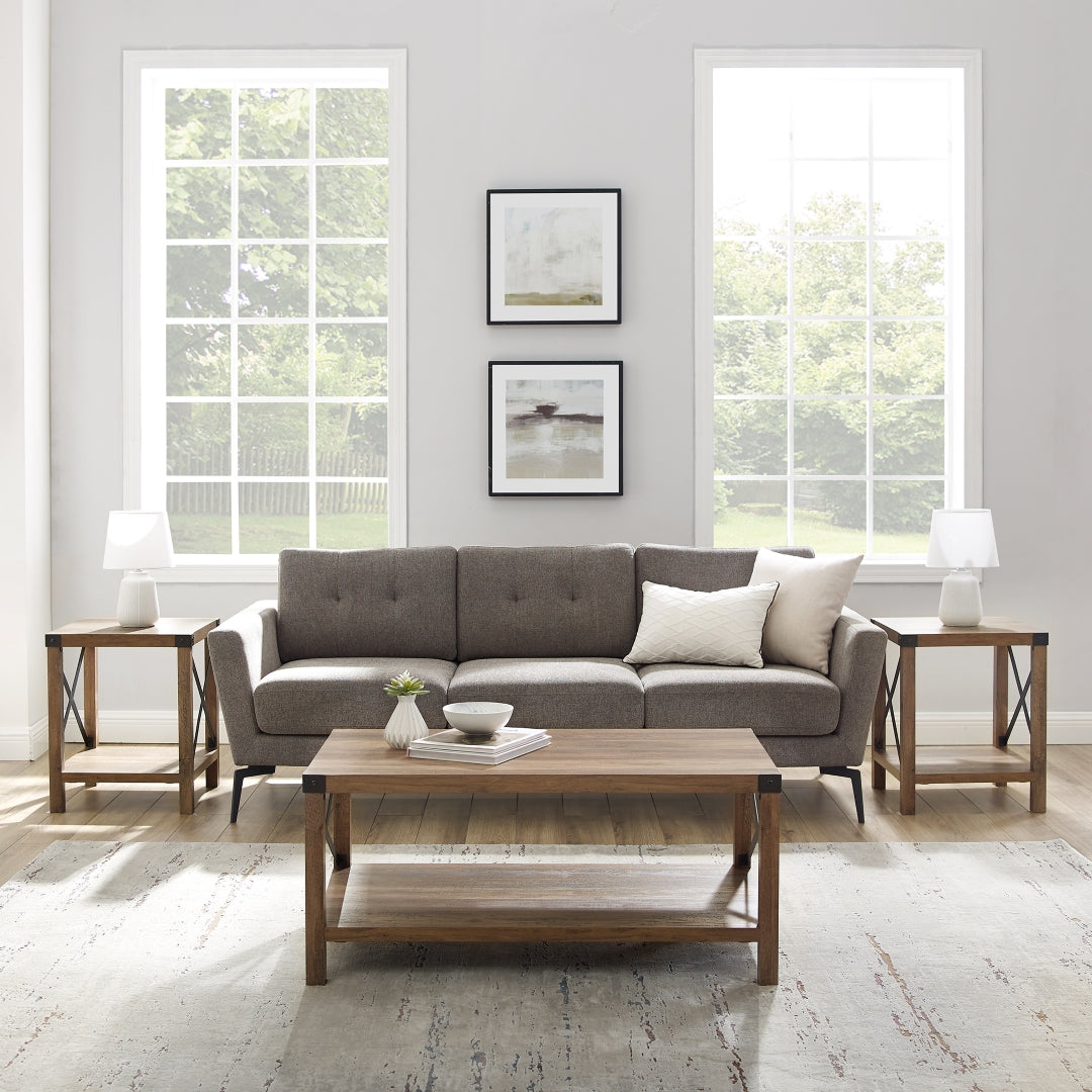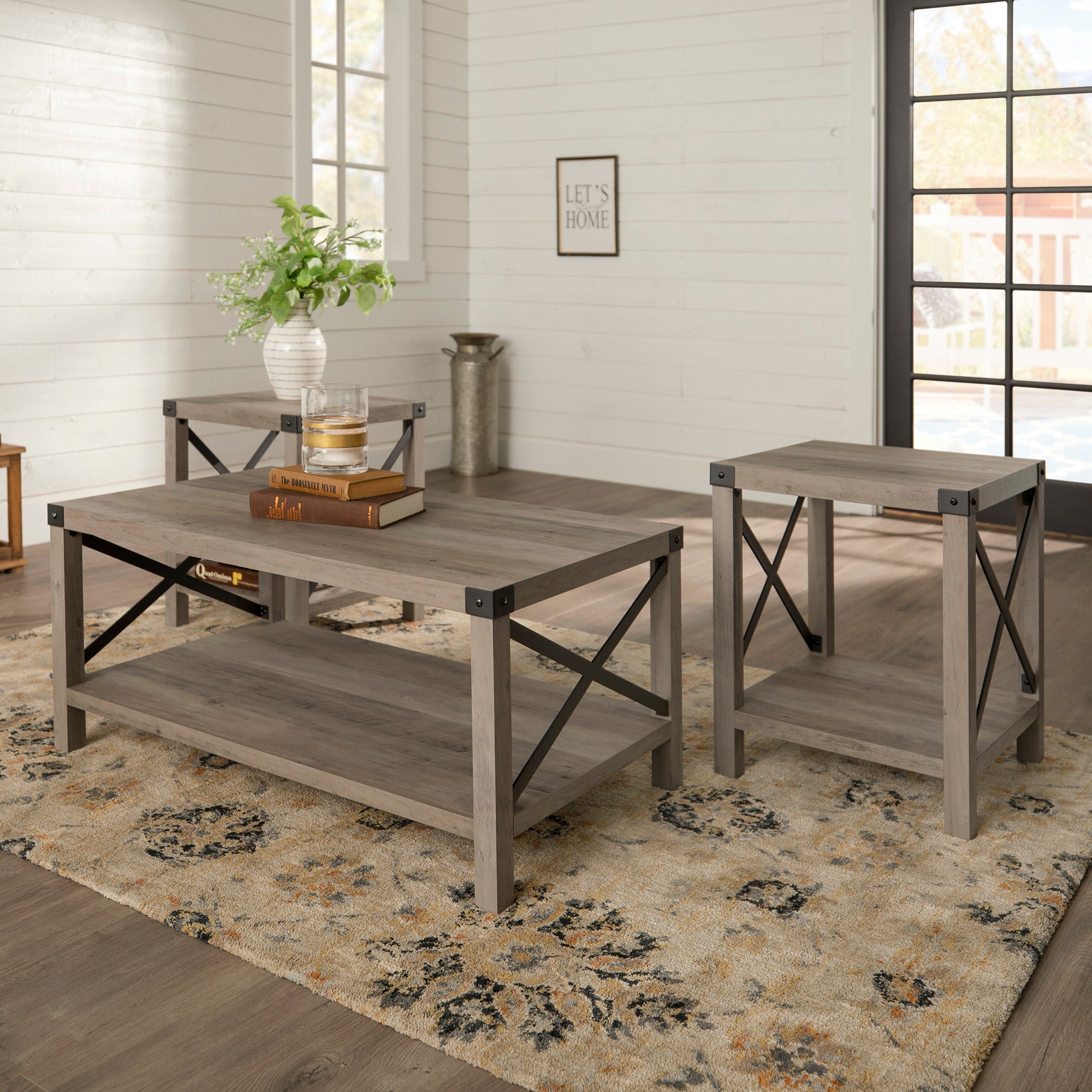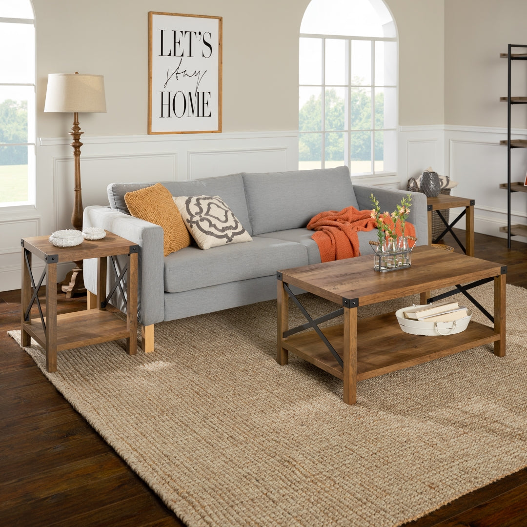 Lasso an industrial farmhouse feel into your home with this wood and metal accent three-piece table set. Mixed materials come together to deliver a rustic personality full of dynamic details. Both the rectangular coffee table and square side tables have lower shelves and feature metal X accents on two of their sides while metal brackets embrace the four top corners of each table. This set includes two side tables and one coffee table.