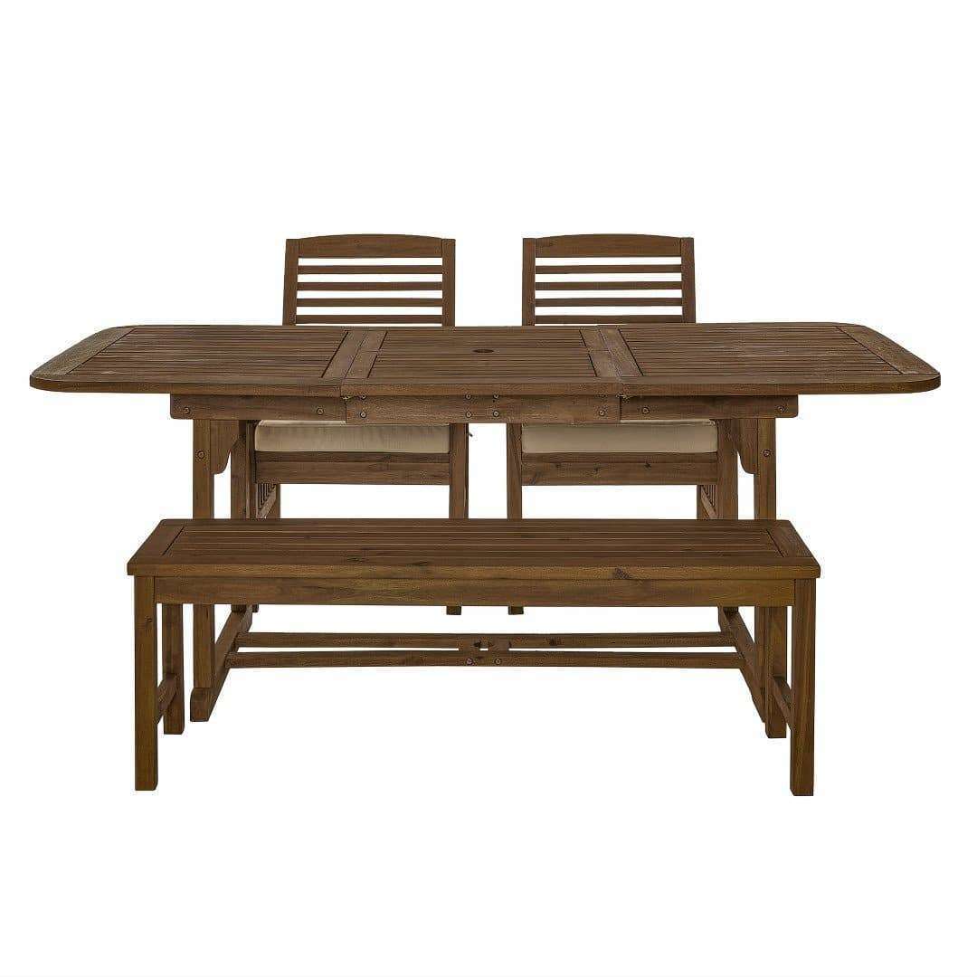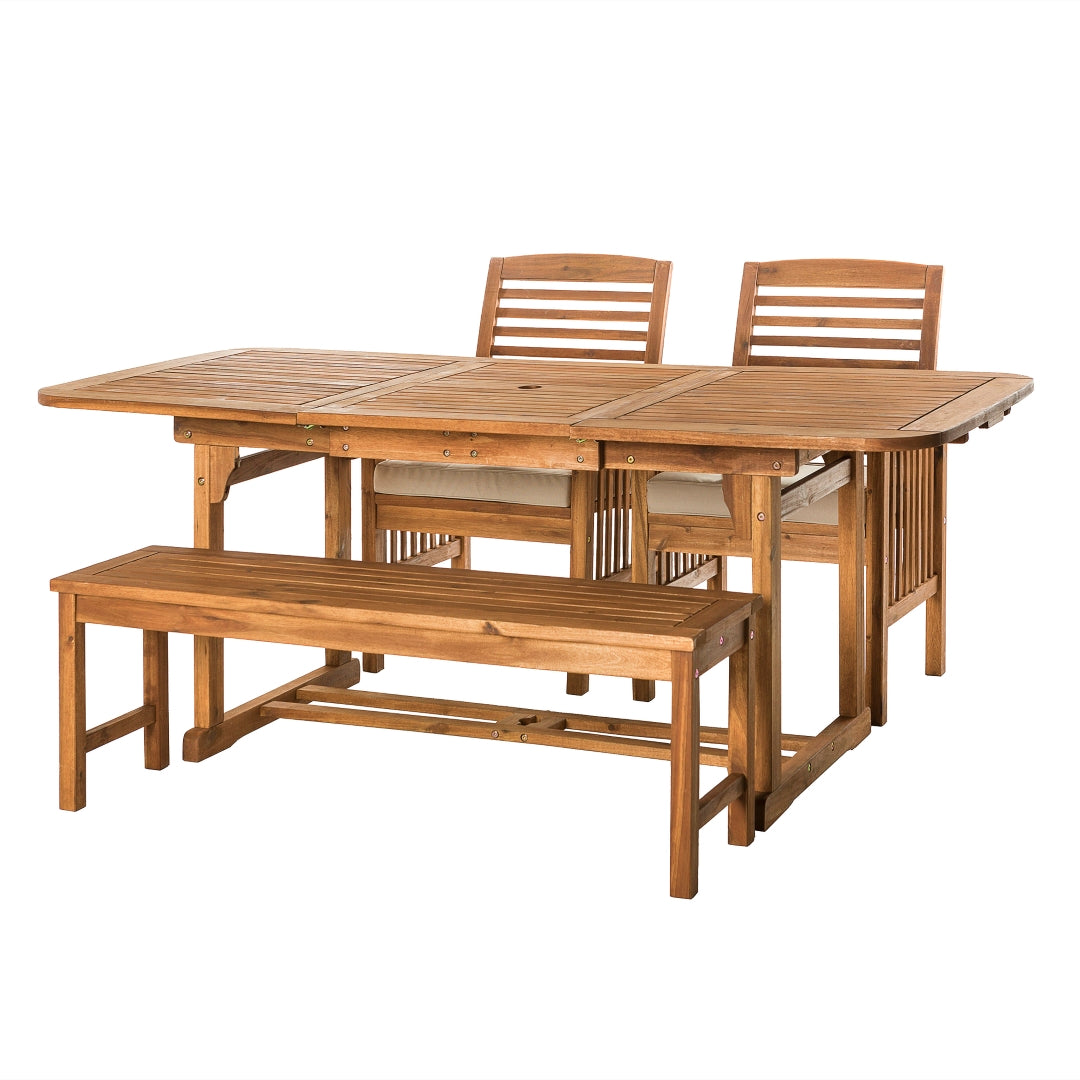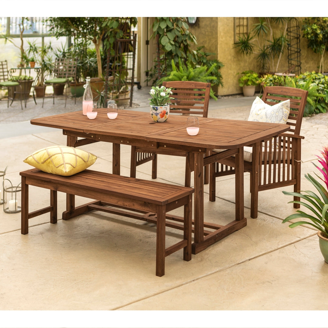 Classic and comfortable, you'll be impressed by this timeless outdoor patio dining set. The slat pattern on every piece provides a fresh and stylish take on outdoor furniture while the weather resistant cushions provide support. The table includes a butterfly leaf extension that has a hole that can accommodate an outdoor umbrella. This dining set includes one extendable table, one bench and two chairs.