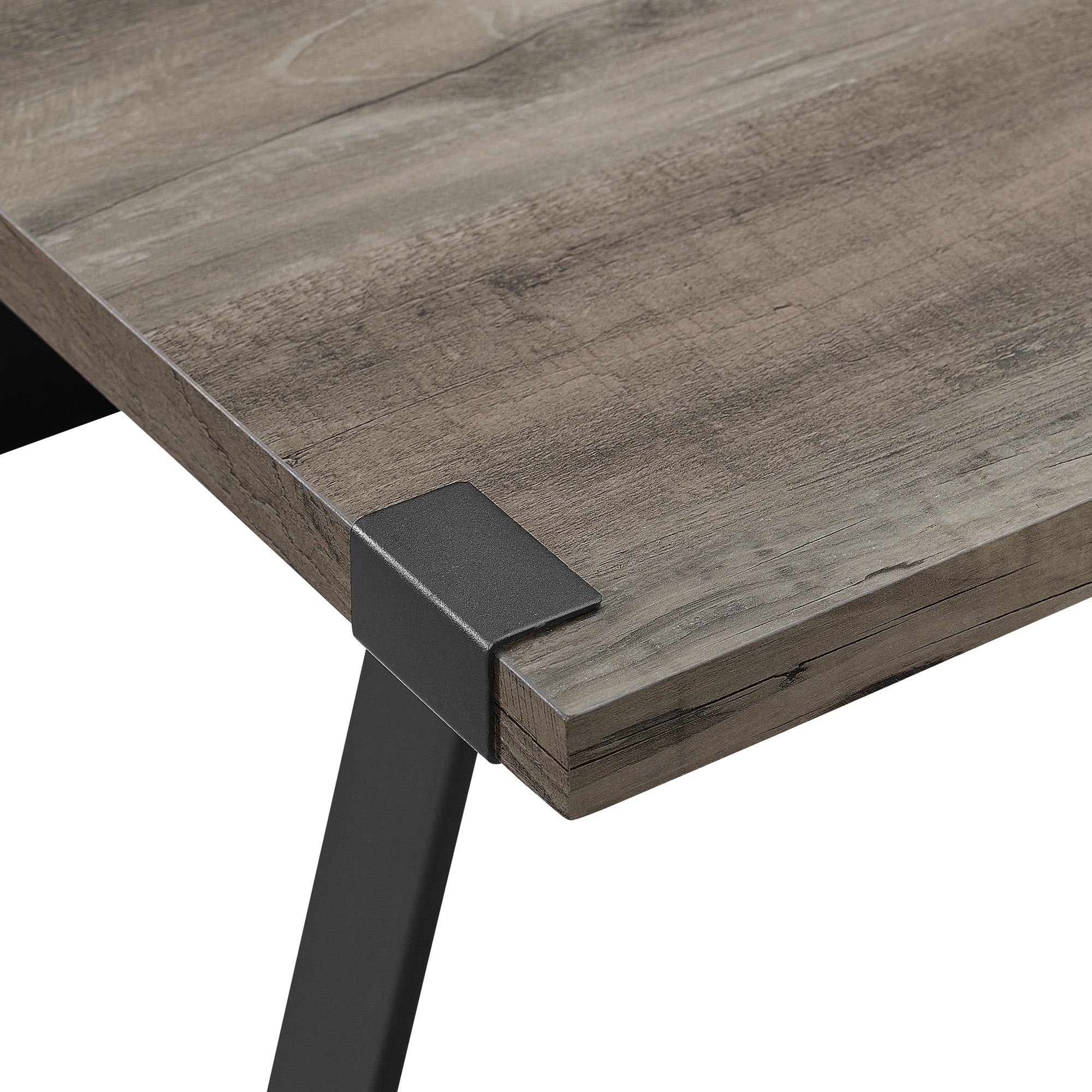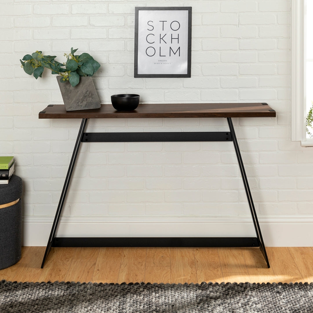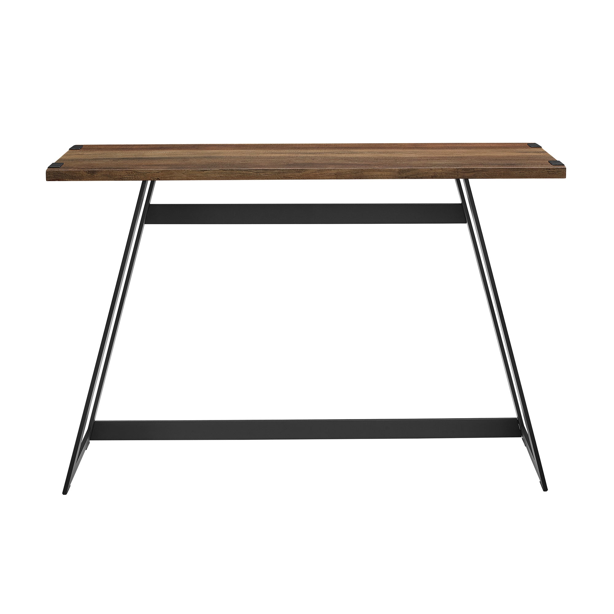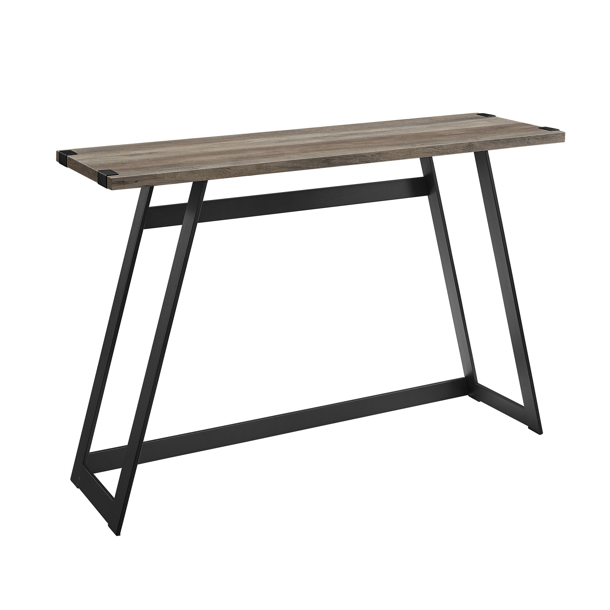 Create a more inviting entryway or living room with our console table. This urban industrial inspired entry table can be embellished with a variety of décor to complement your current interior style in your home. Display a beautiful floral arrangement and pictures of family and friends along the table top, with a mirror above to open up your space. This sofa table features a unique angular metal frame which holds up the table top with metal accents to create an urban feel.