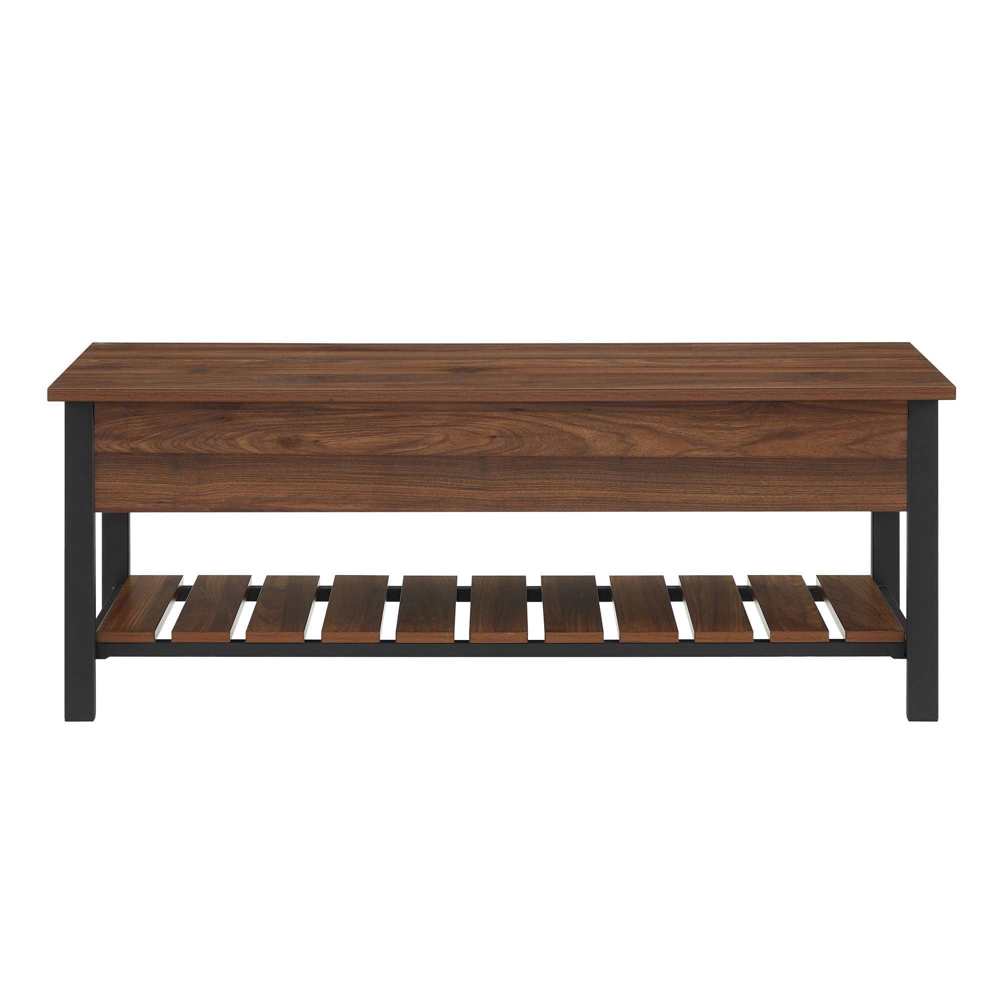 Both beautiful and functional, this storage bench with a modern farmhouse flair will invigorate your home’s entryway or hallway. Made of high-grade MDF, premium laminate, and powder coated metal, the rustic design of this unit emulates a city park bench. Open the top of the bench to access interior storage. Use the bottom slatted shelf as a shoe rack. This wood and metal bench comfortably seats two adults.