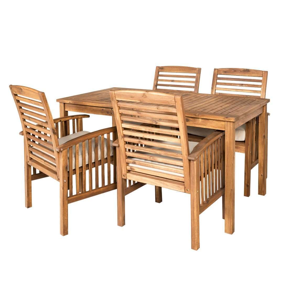 Make your outdoor space more welcoming with this 5-piece simple patio dining set. Made from acaia wood, this set is constructed with simple lines. The tops of the chairs and arm rests are smoothly curved to create a more relaxed look and feel for your patio. Extra lines of wood throughout the dining set give more structure, while the minor details of the hardware complement the design. Fusing modern and contemporary style to a more classic and traditional style, while maintaining an overall simple design. The four chairs provide room, so everyone can enjoy the day sitting outside together. Includes outdoor dining table and four chairs.