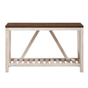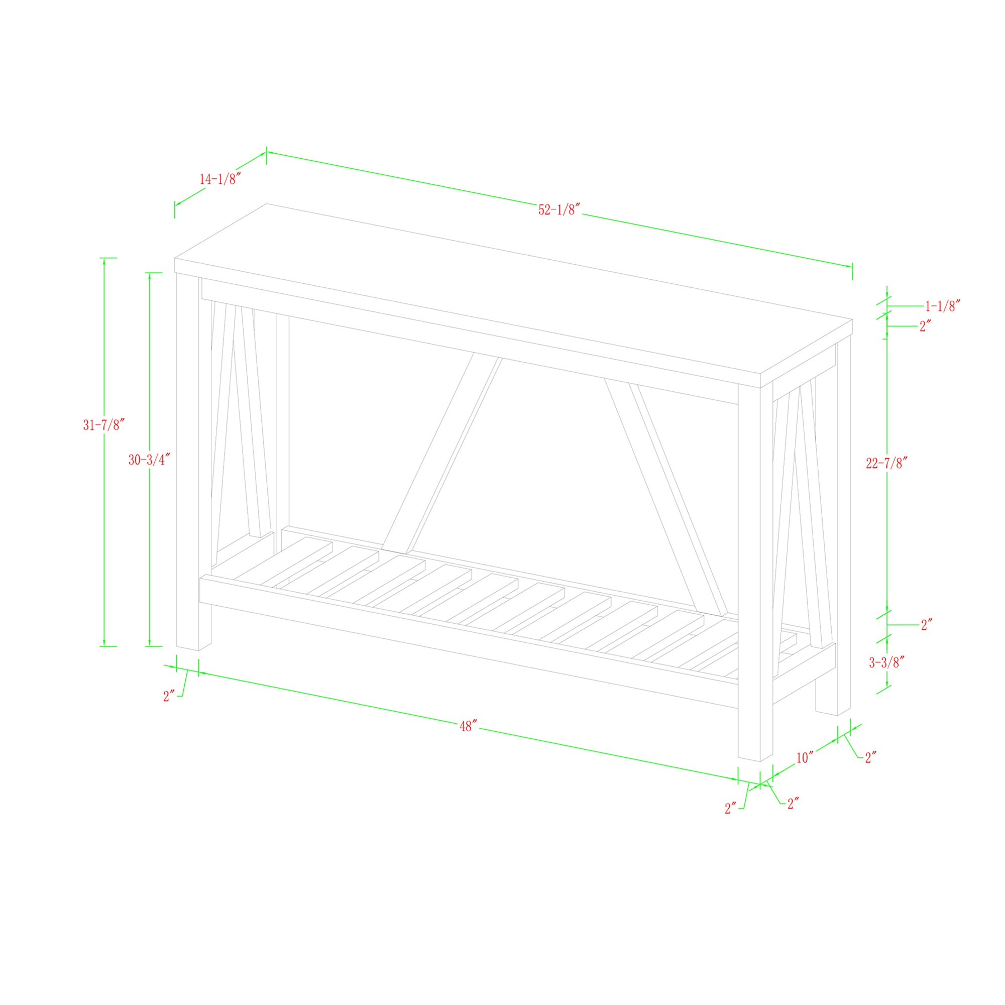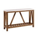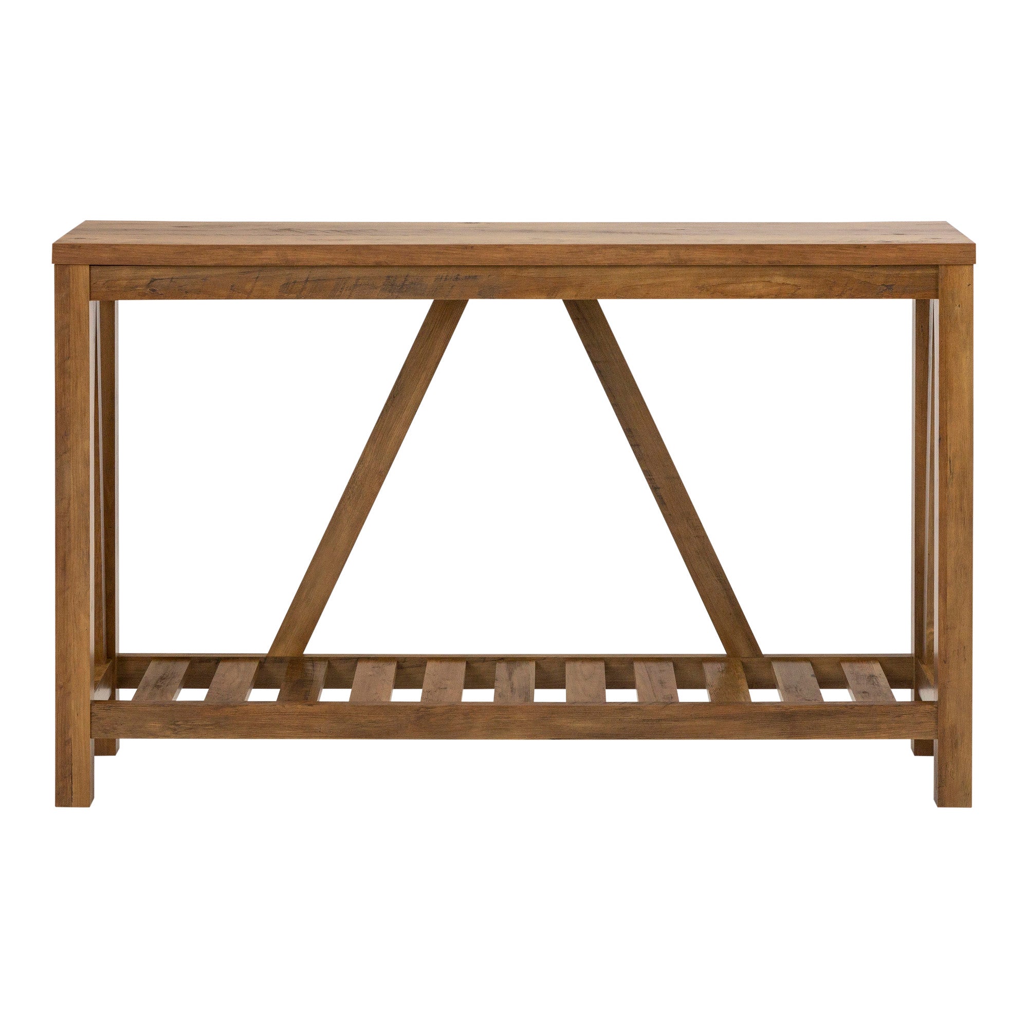 Rustic charm can be yours when you add this 52-inch A-Frame console table to your living room, entryway, or hallway. The walnut styled finish bring the perfect touch of aesthetic appeal while the spacious table top and open slatted bottom shelf provide the perfect place to display and store your favorite accessories, photos, and collectibles. Constructed of high-grade MDF and durable laminate, this piece will be the simple answer for all of your decorating needs.