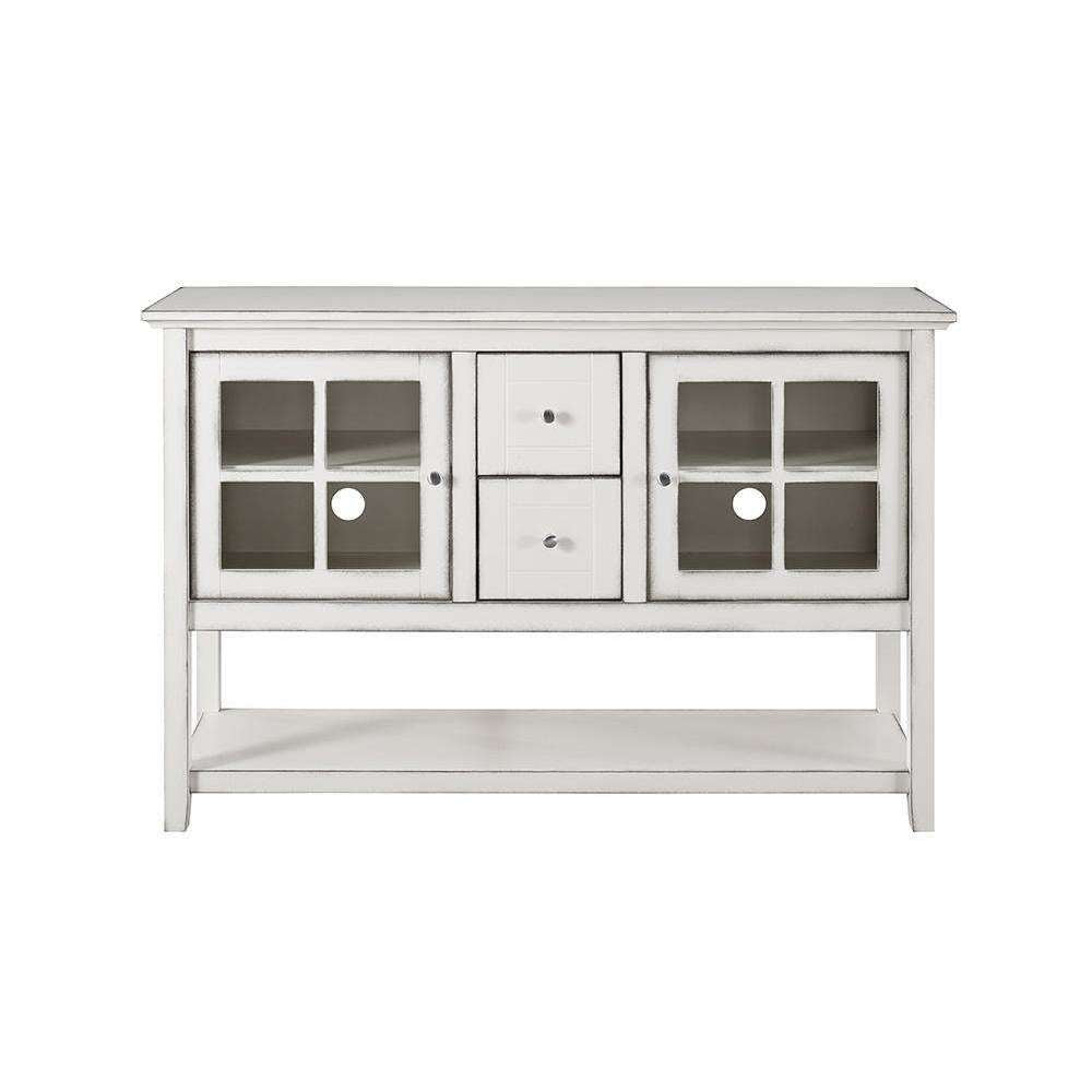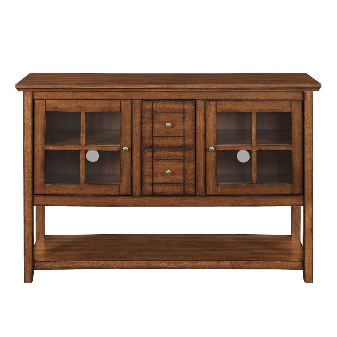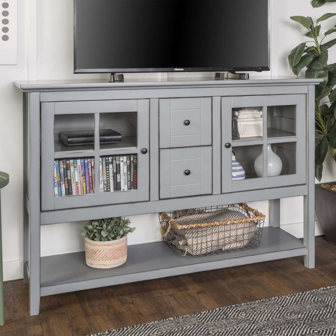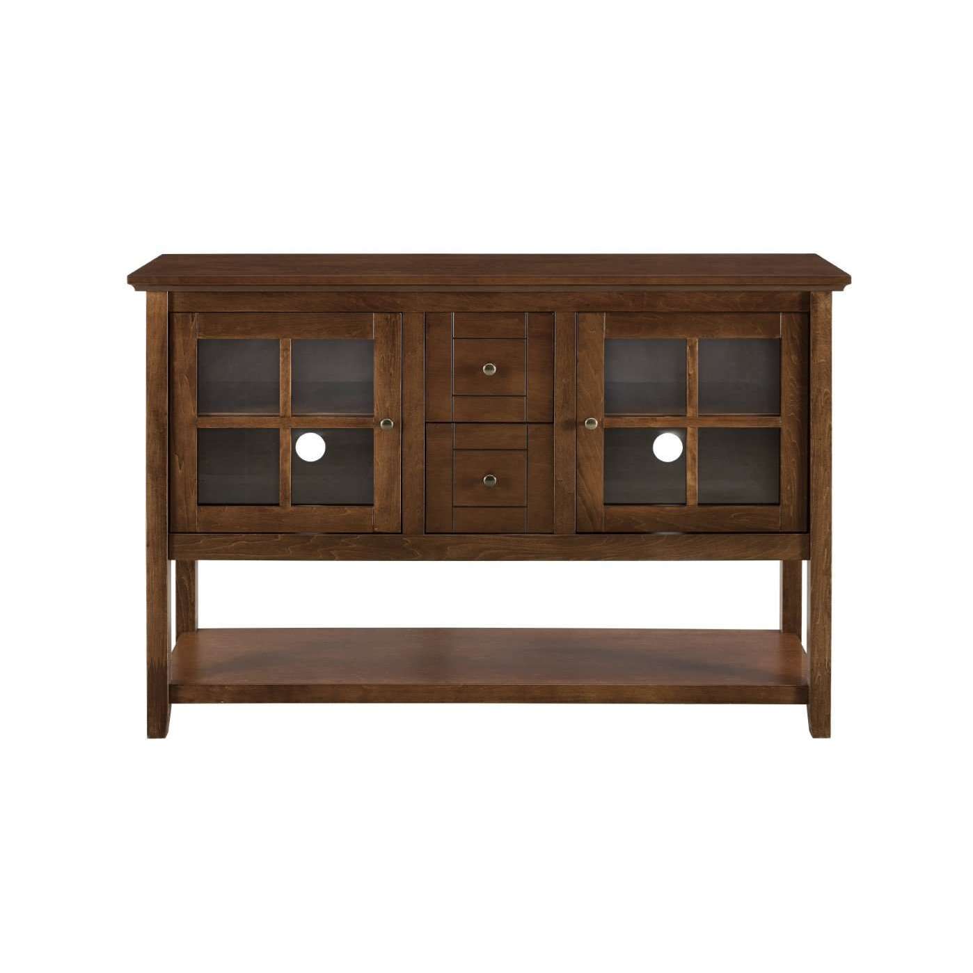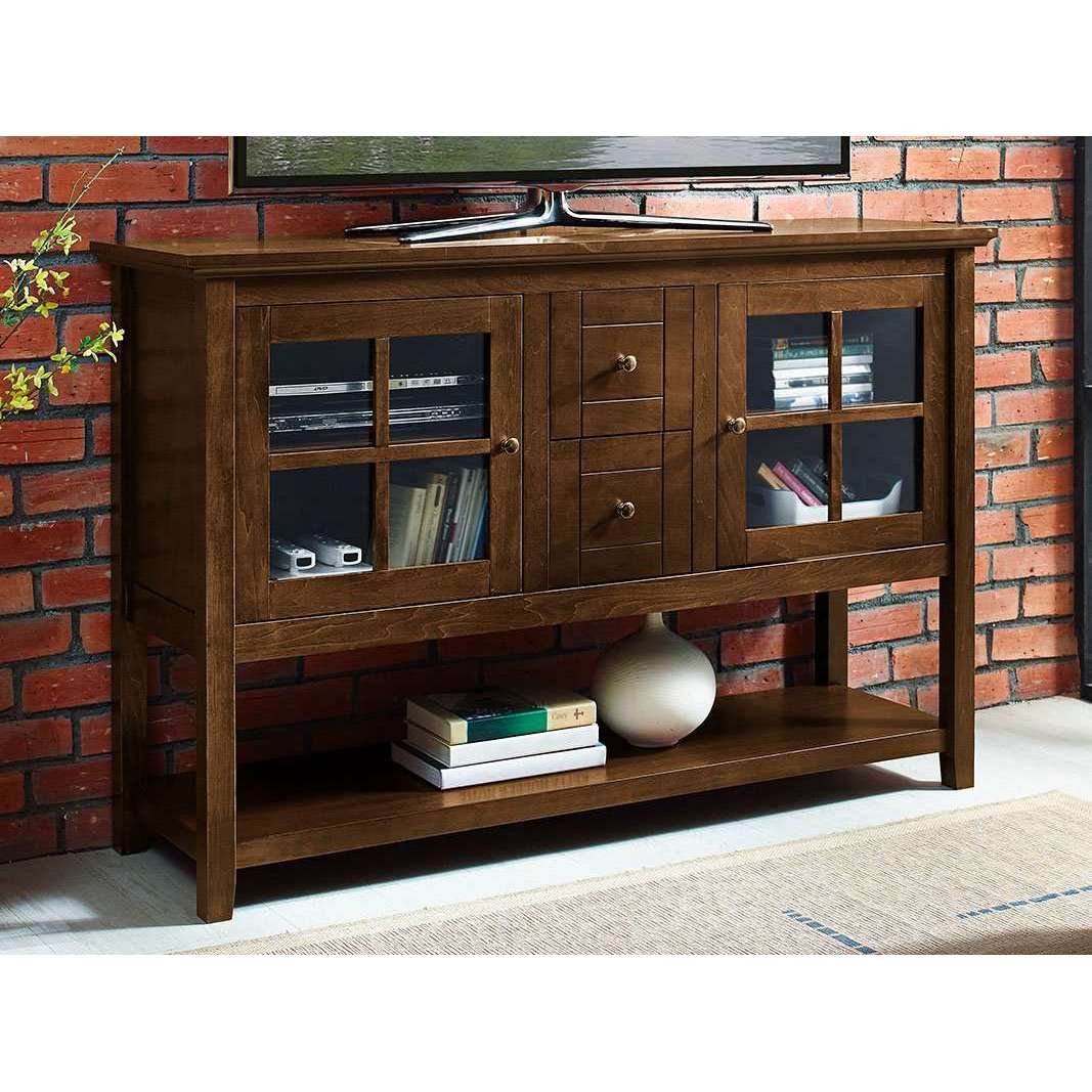 The added height and style of this console make it a perfect fit for any room in your house, whether it be for entertaining, dining, or decorative purposes. Crafted from high-grade MDF, this entertainment center accommodates most TVs up to 55 inches. Features adjustable shelves behind glass-paned doors to provide ample storage space for media components or decorative accessories. Includes two multi-functional storage drawers and a spacious bottom shelf. In a transitional style, this TV stand gives a stylish update to your living room, entryway, or kitchen.
