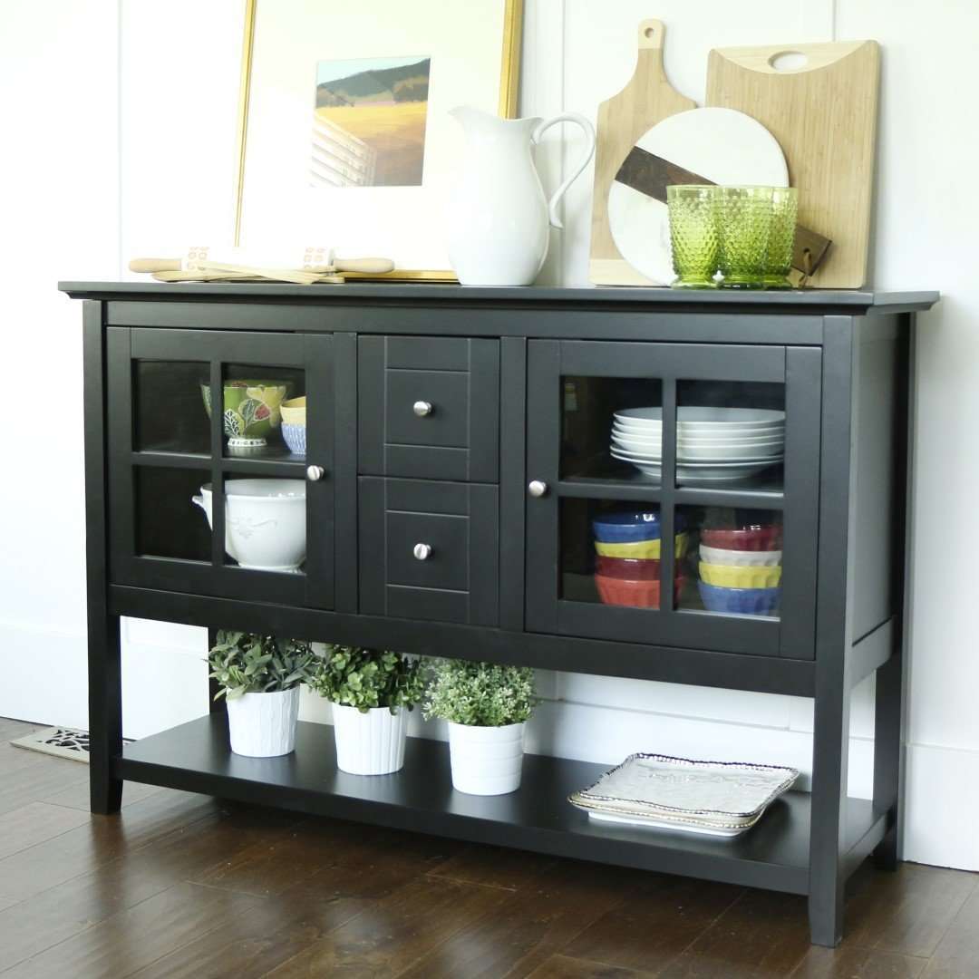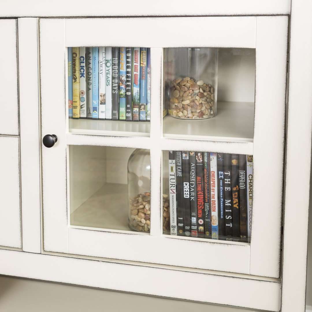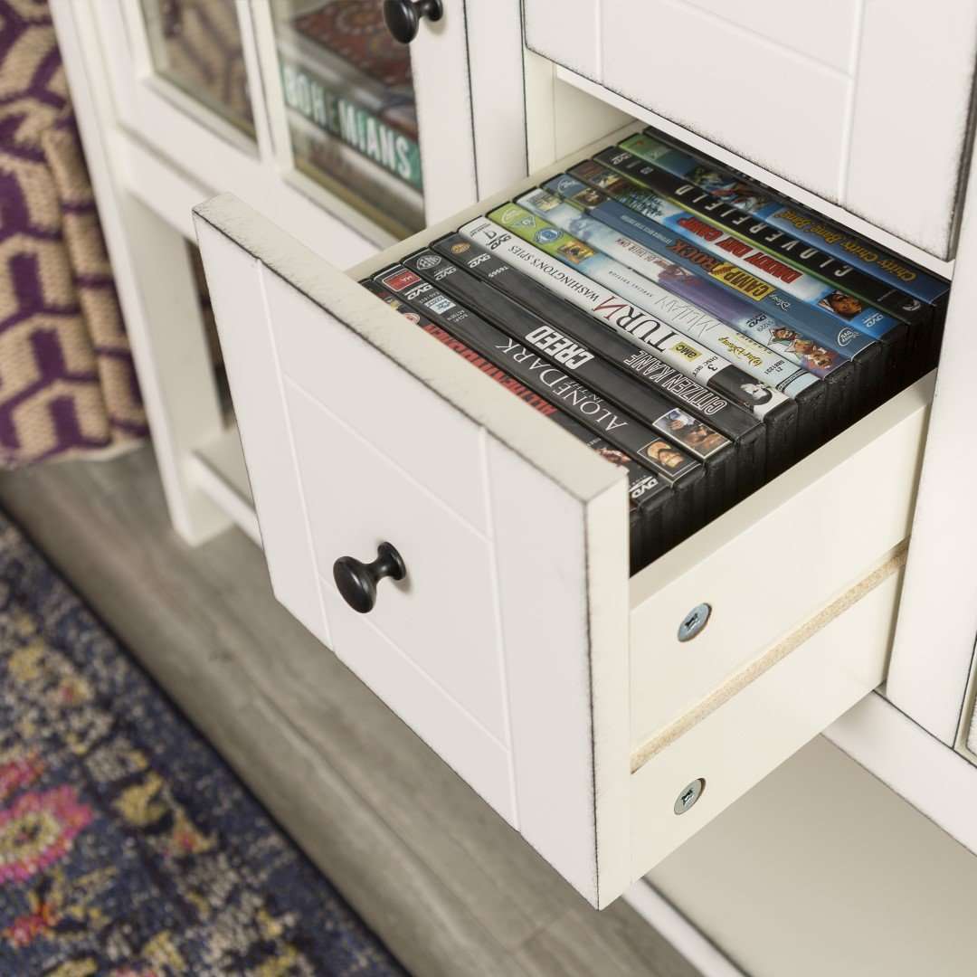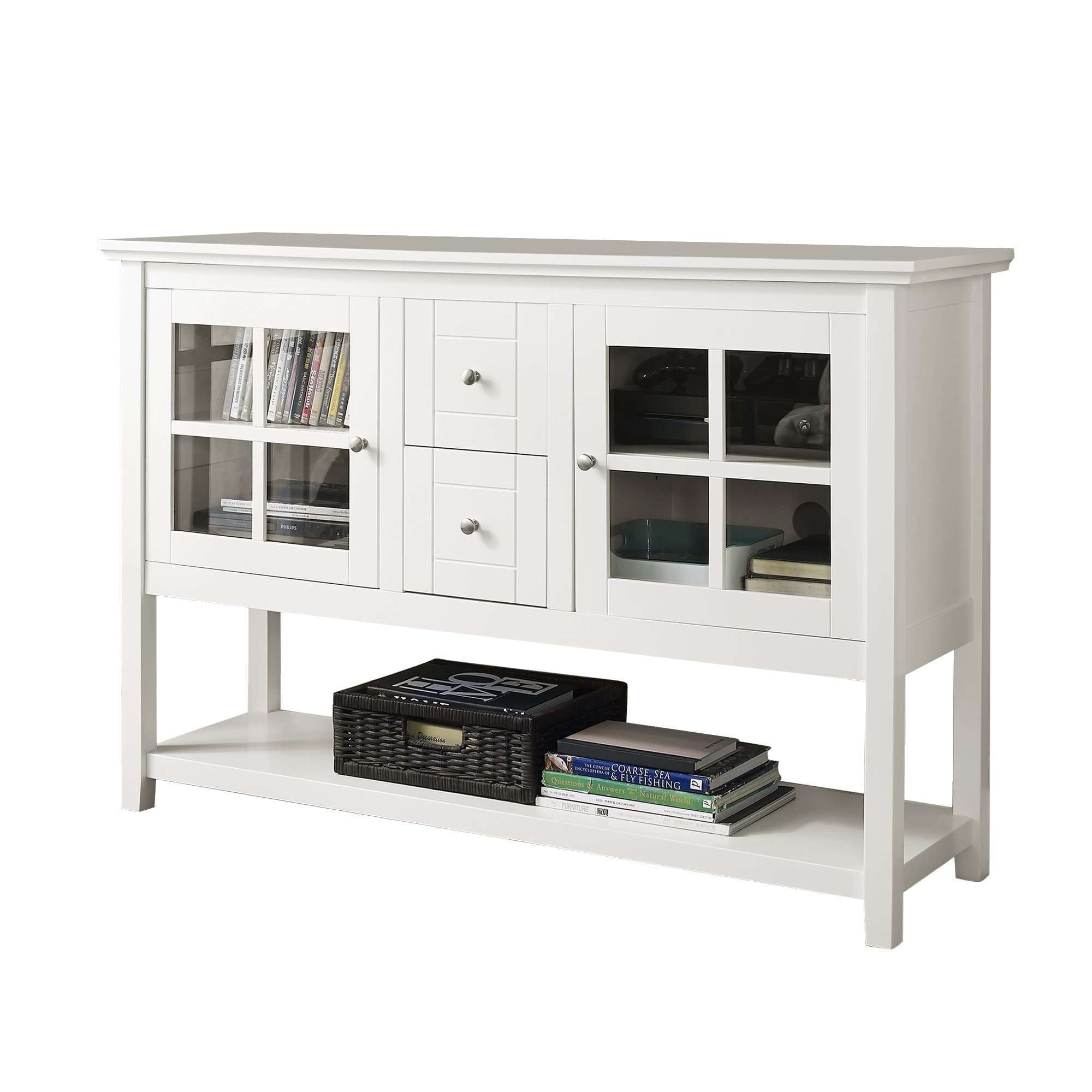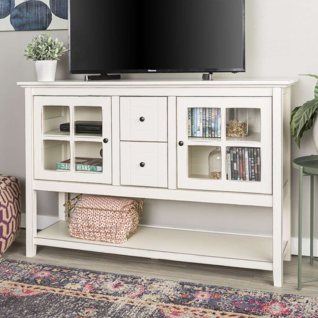 The added height and style of this console make it a perfect fit for any room in your house, whether it be for entertaining, dining, or decorative purposes. Crafted from high-grade MDF, this entertainment center accommodates most TVs up to 55 inches. Features adjustable shelves behind glass-paned doors to provide ample storage space for media components or decorative accessories. Includes two multi-functional storage drawers and a spacious bottom shelf. In a transitional style, this TV stand gives a stylish update to your living room, entryway, or kitchen.