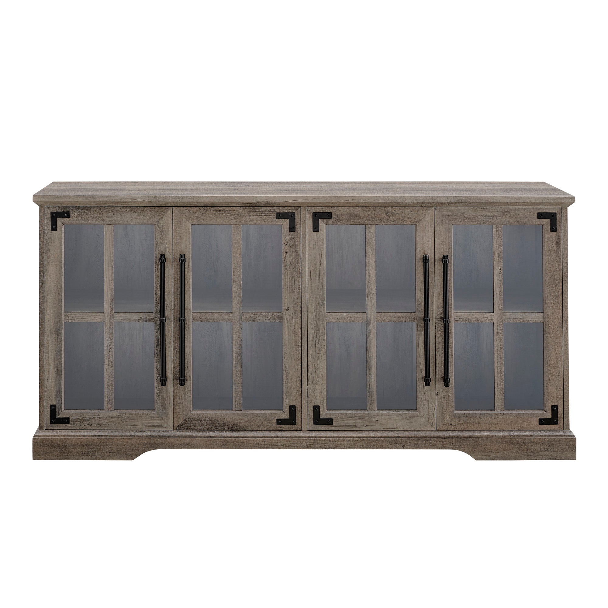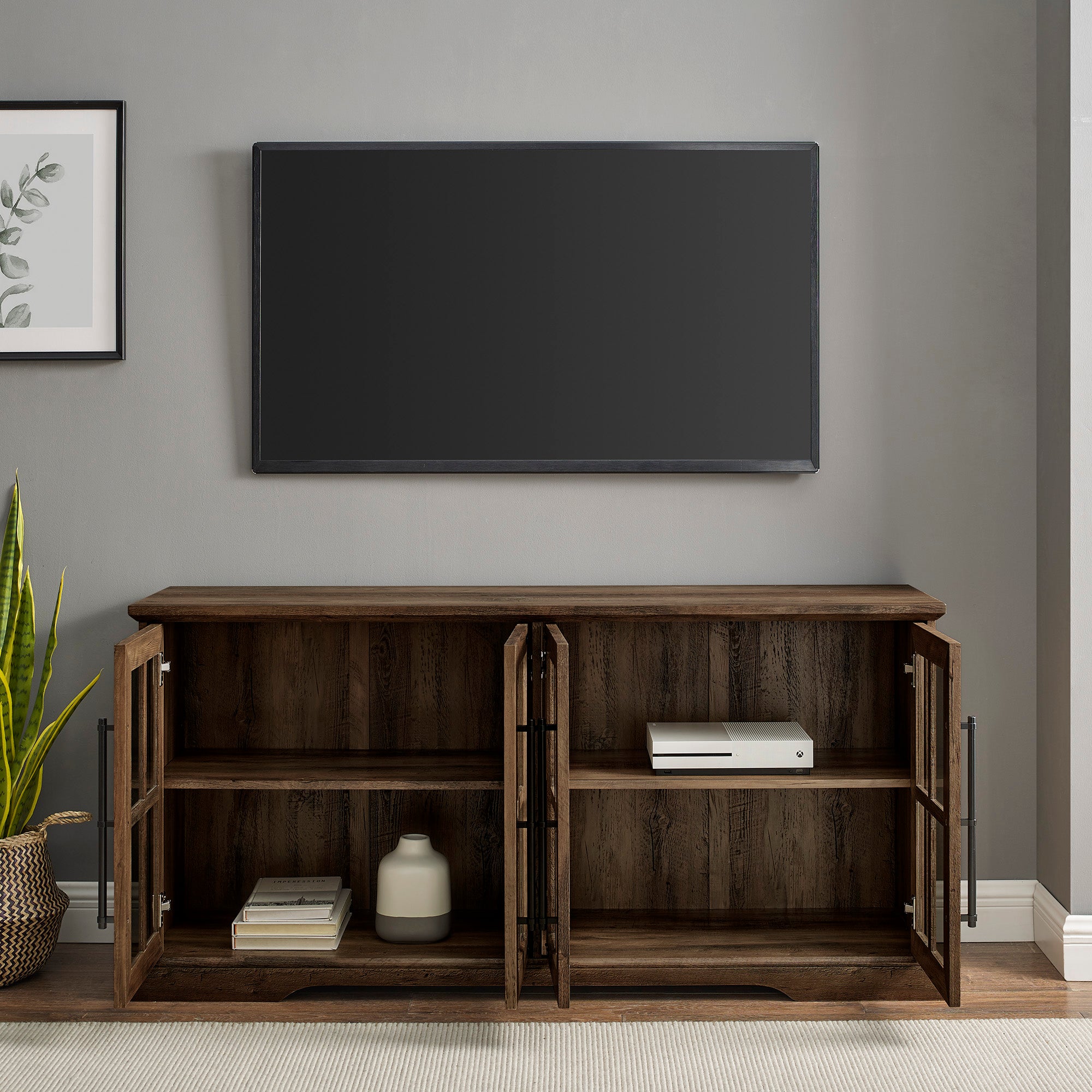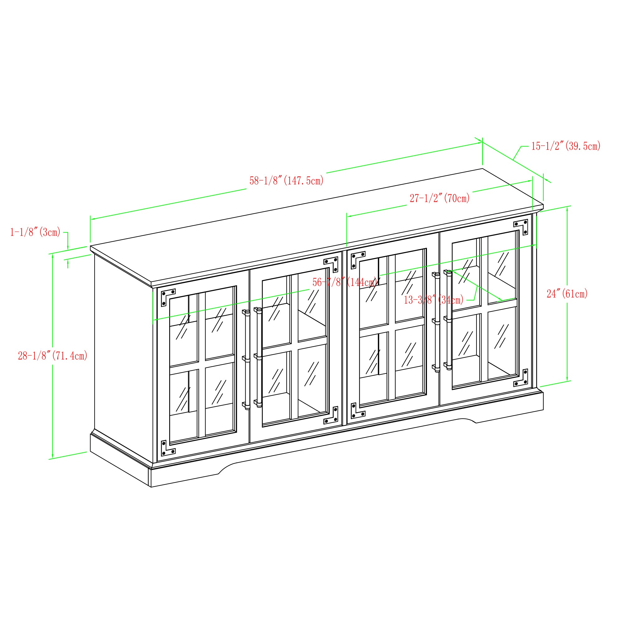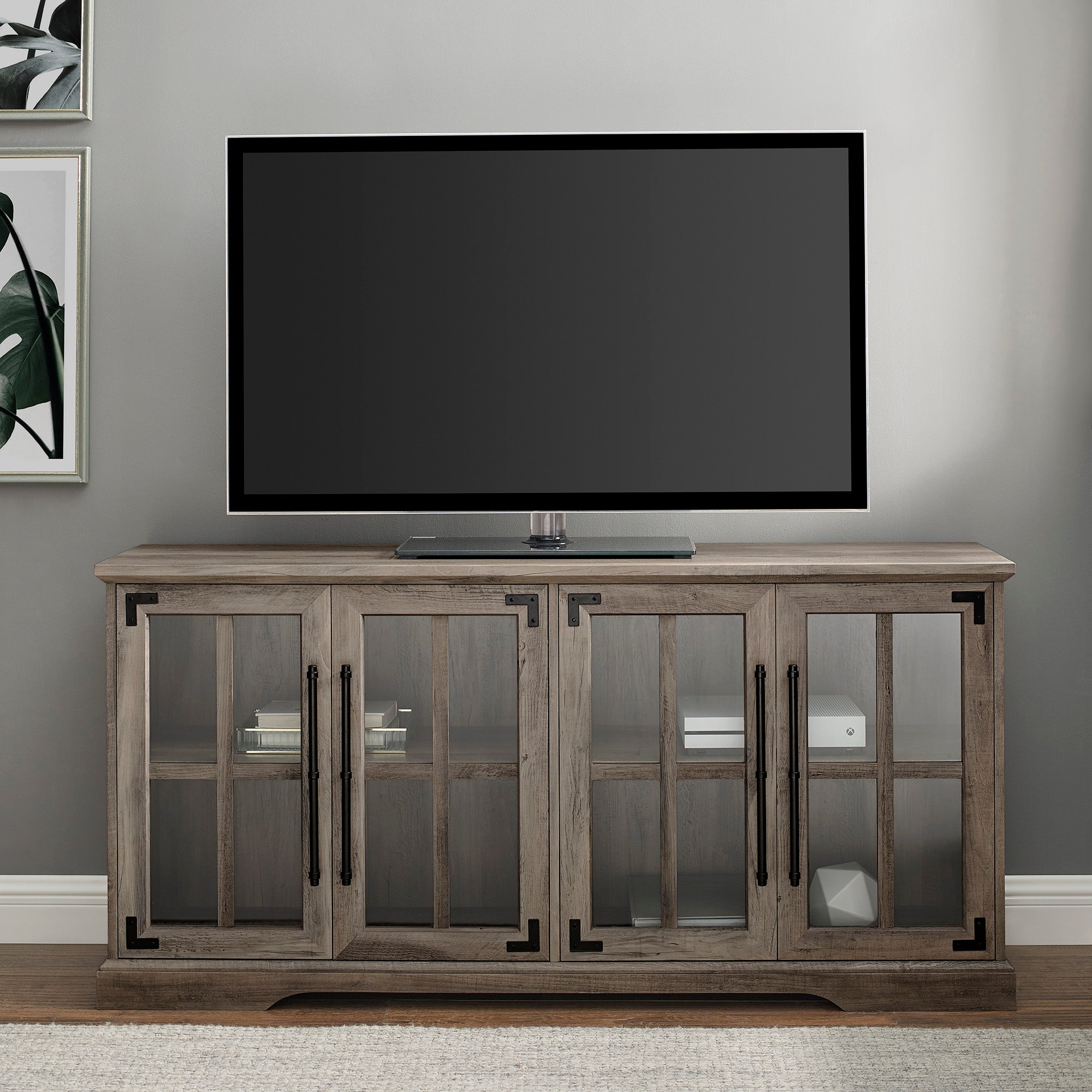 Country flair for the current age, this farmhouse TV stand has a historic presence mixed with all the modern modifications necessary to make this a dream entertainment stand. It has adjustable shelves and cord management options so you can organize electronics to your preference. Four tempered glass doors with a classic fretwork design feature metal corner accents that incorporate a rustic element to into this traditional console. The doors also have soft close hinges. A beveled top and bottom add the final touches to this charming country style media stand.