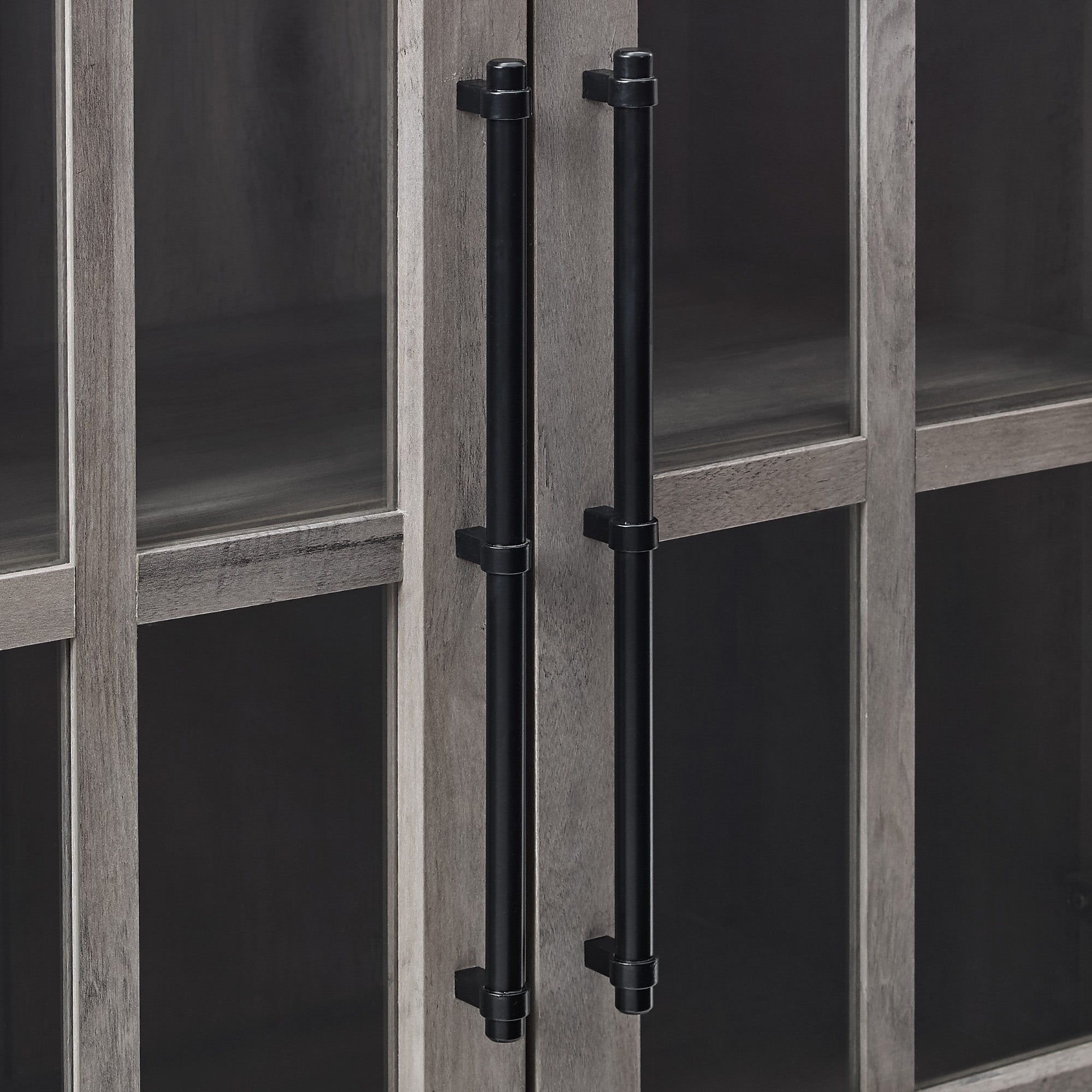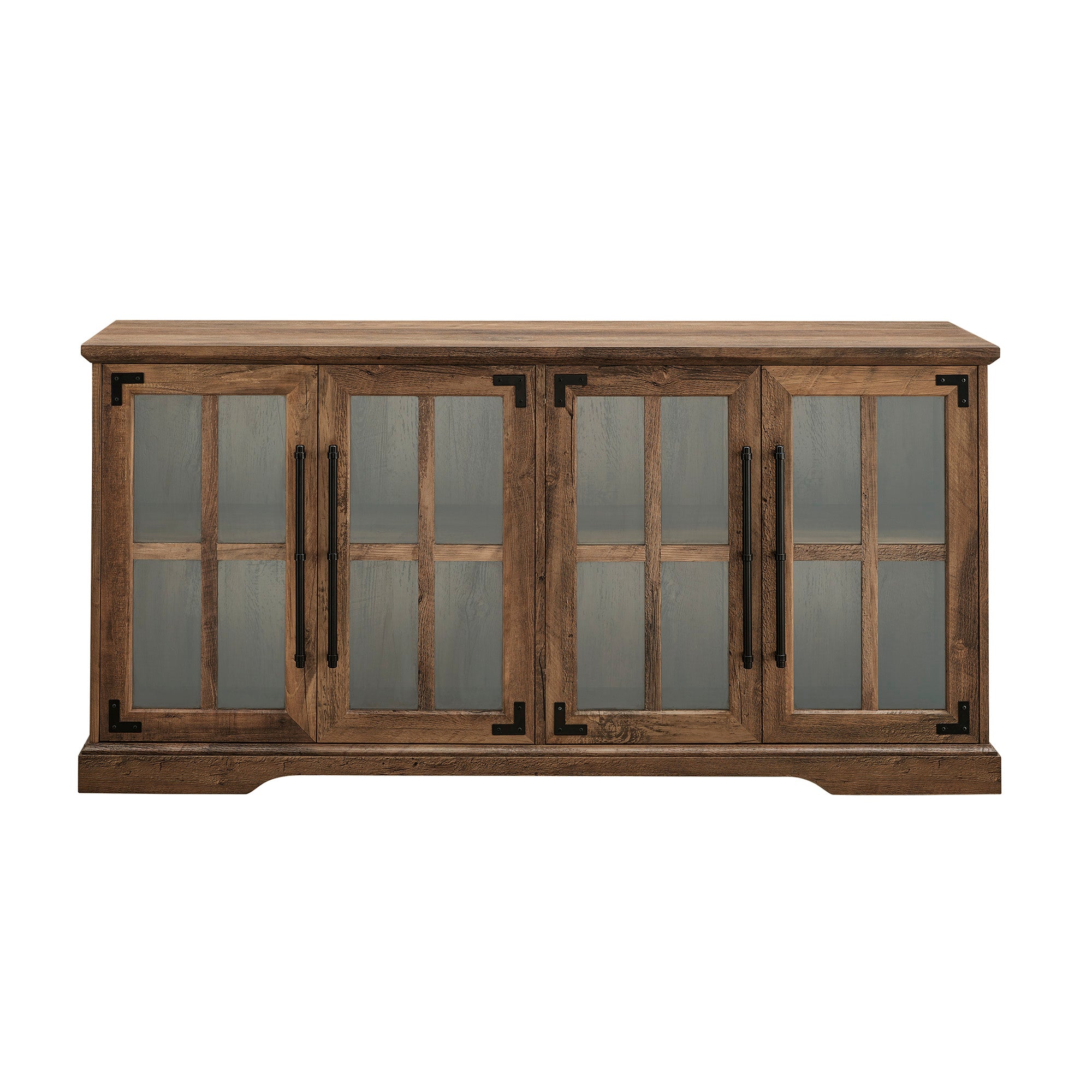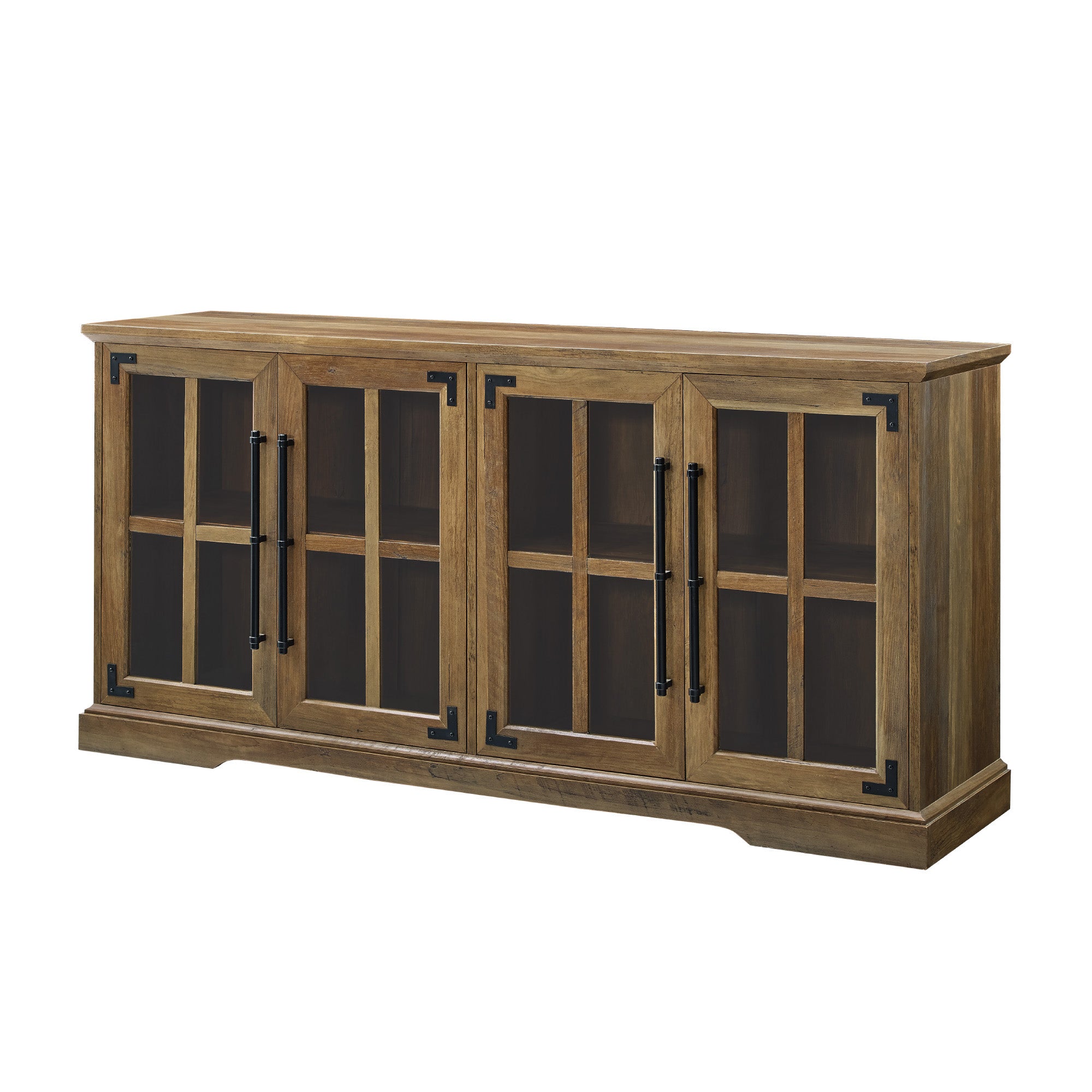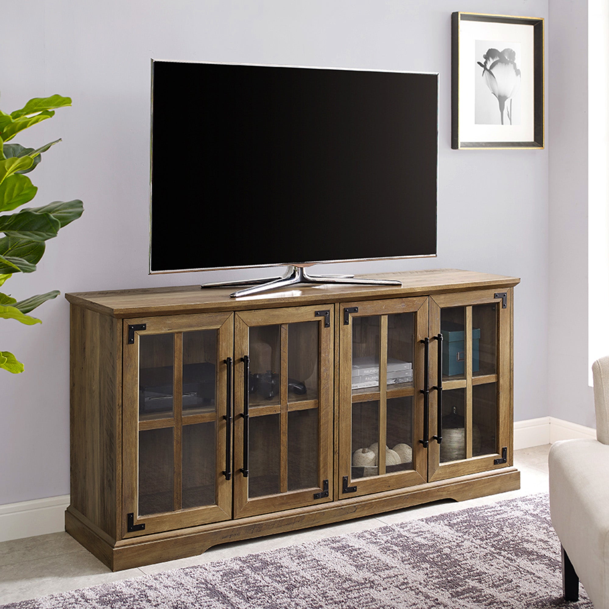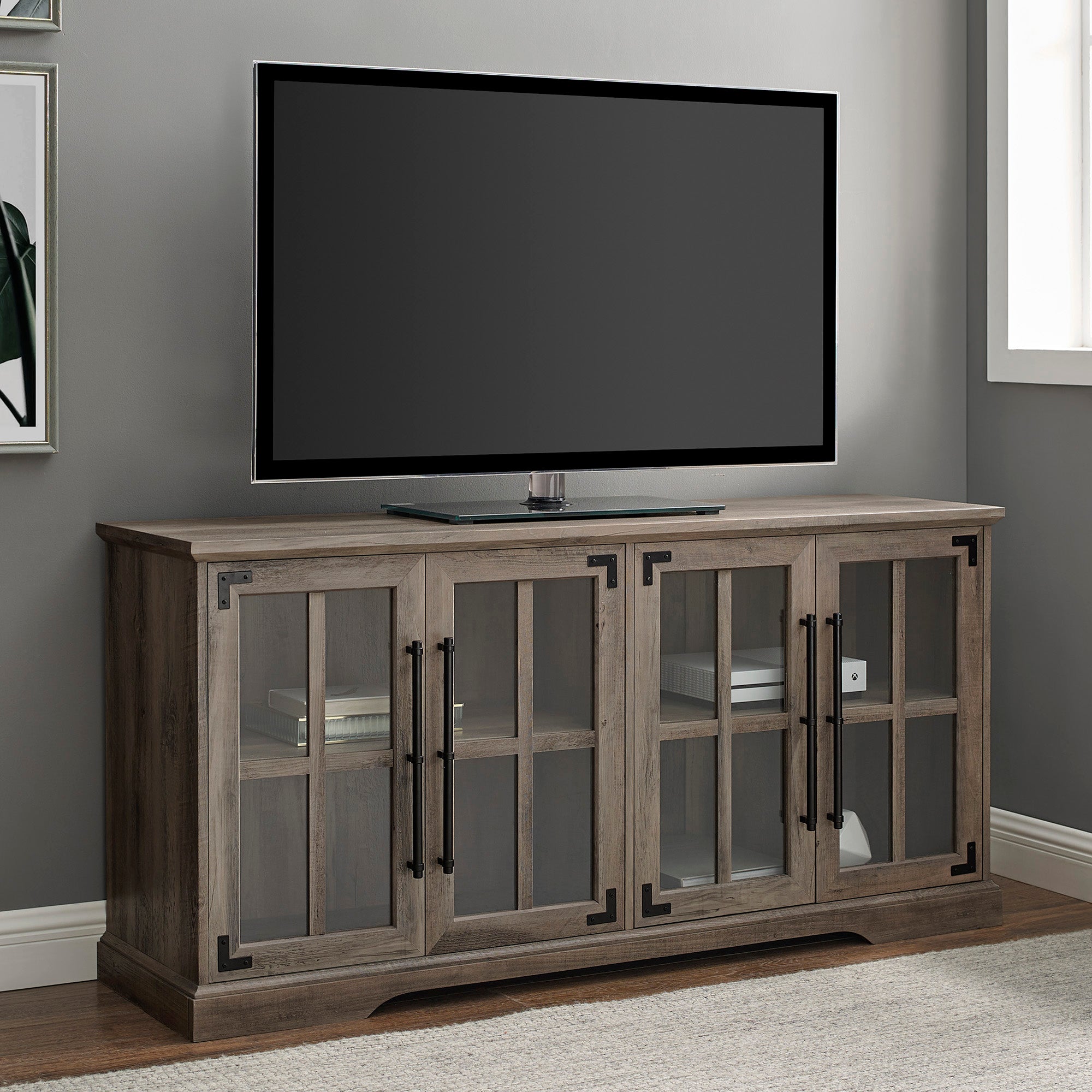 Country flair for the current age, this farmhouse TV stand has a historic presence mixed with all the modern modifications necessary to make this a dream entertainment stand. It has adjustable shelves and cord management options so you can organize electronics to your preference. Four tempered glass doors with a classic fretwork design feature metal corner accents that incorporate a rustic element to into this traditional console. The doors also have soft close hinges. A beveled top and bottom add the final touches to this charming country style media stand.