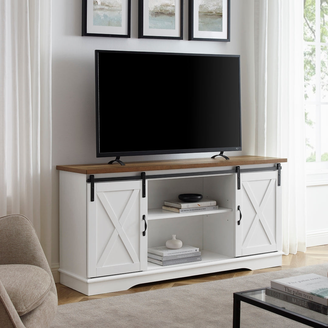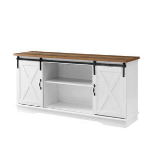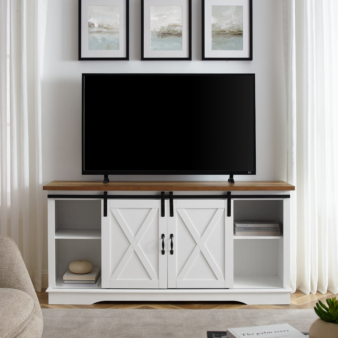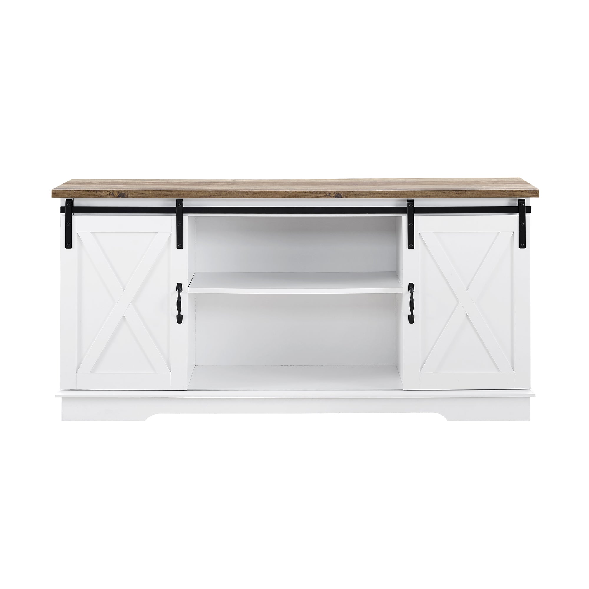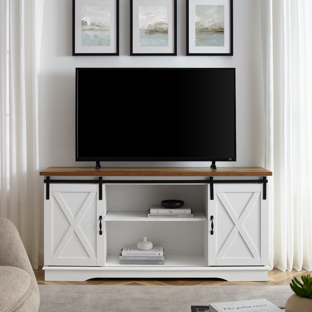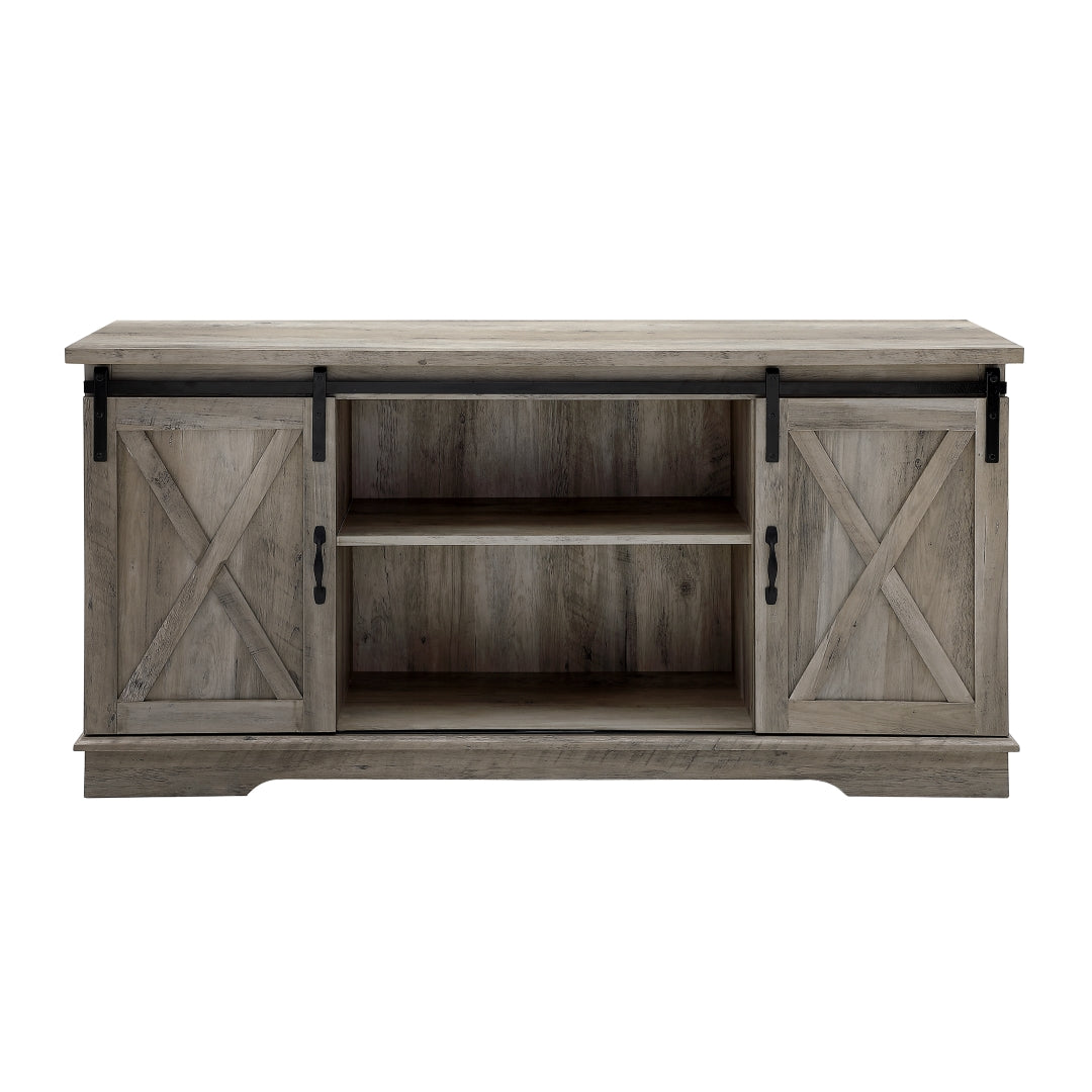 This TV stand will give your living room a charming country feel, while also providing plenty of storage space for your electronics and décor. Featuring two sliding barn door styled cabinet fronts for a versatile design where you can either close off the middle or both sides, depending on your needs. Adjustable shelving and cable management make it simple for you to keep your electronics in one place. This media console is constructed of high-grade MDF. The modern farmhouse style of this entertainment center will become a piece in your living room you’ll admire.