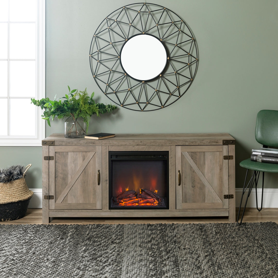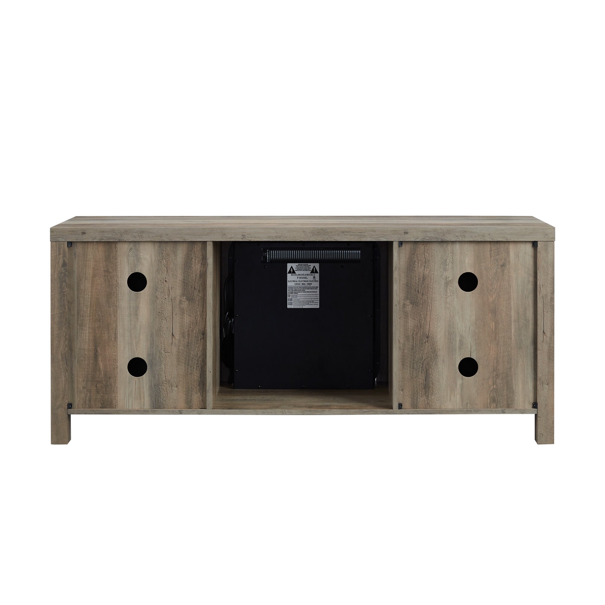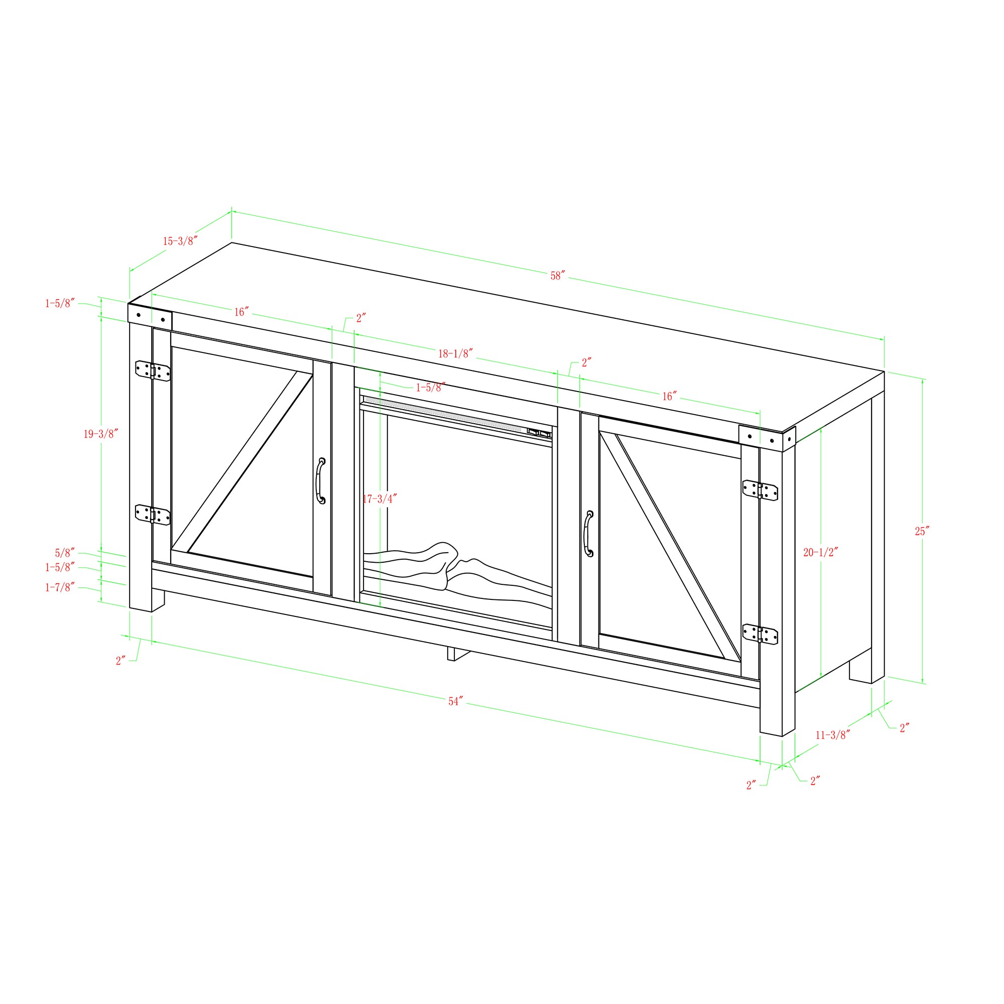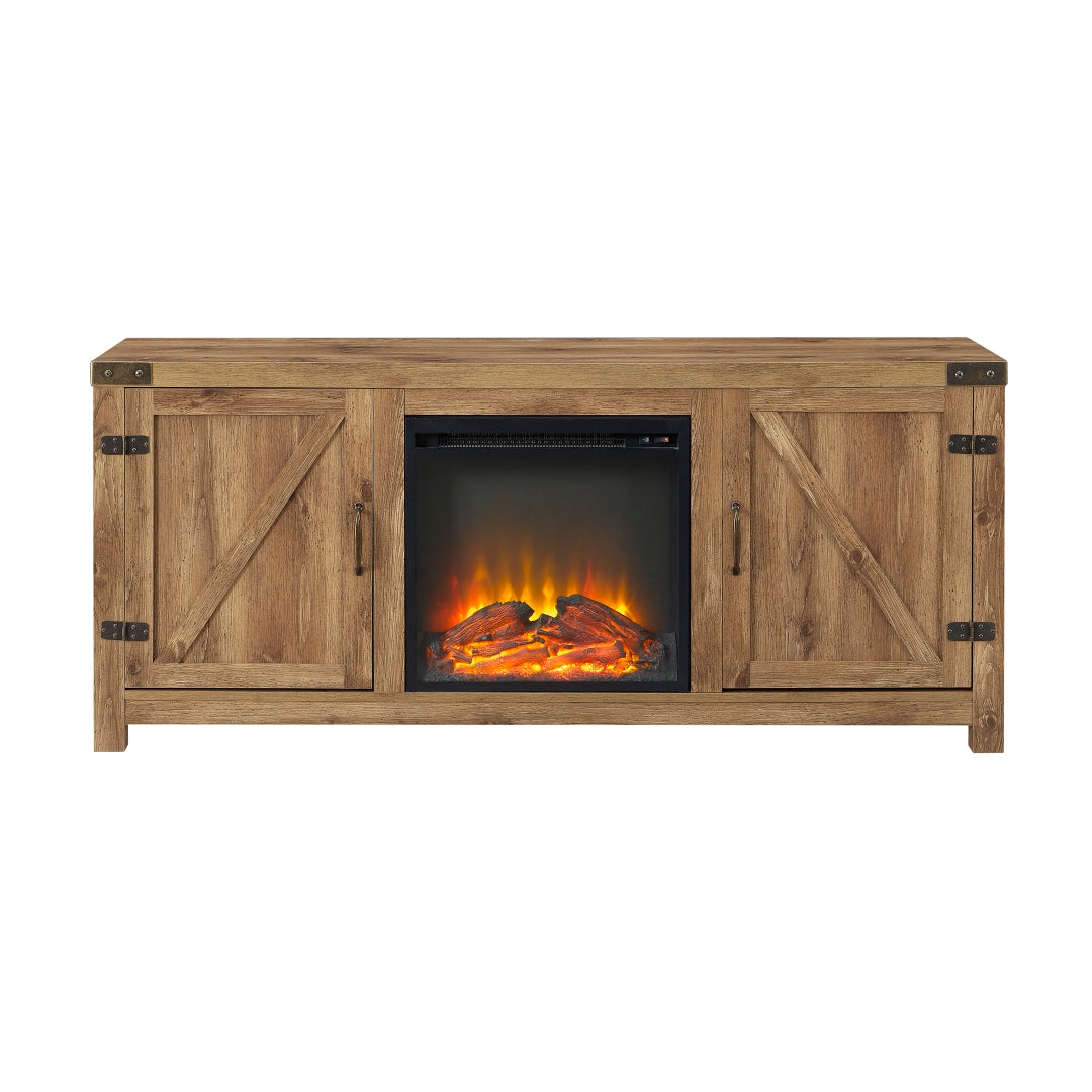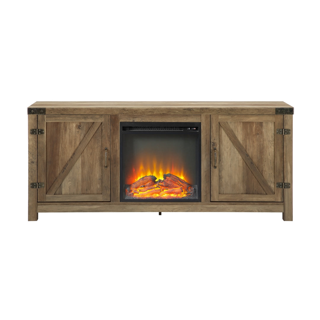 This cozy 58-inch fireplace TV stand is the perfect piece to give your living or family room area a charming country feel. Features concealed storage space behind the barn styled side doors with adjustable shelving to fit your media and accessories, while having a mix of rustic and modern farmhouse style. Includes a fireplace insert to warm up when it gets chilly that’s easy to use and requires no electrician or venting.
