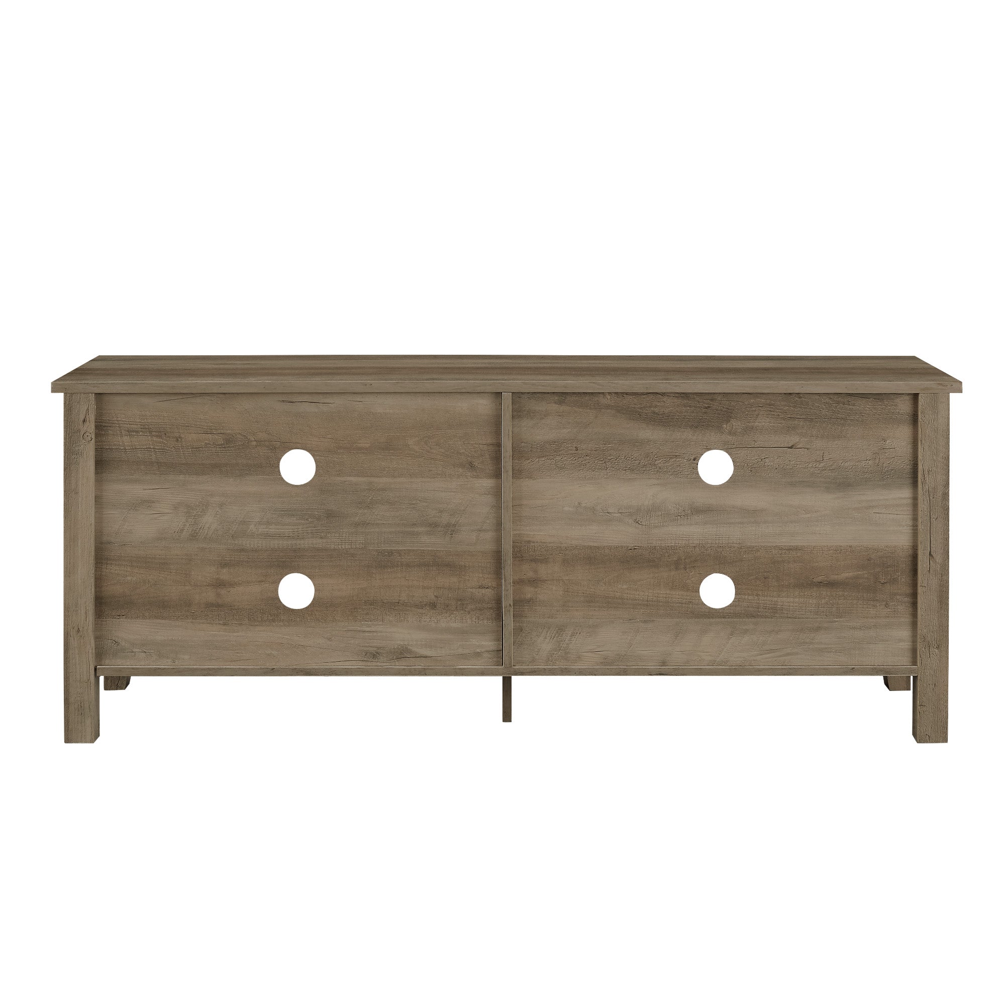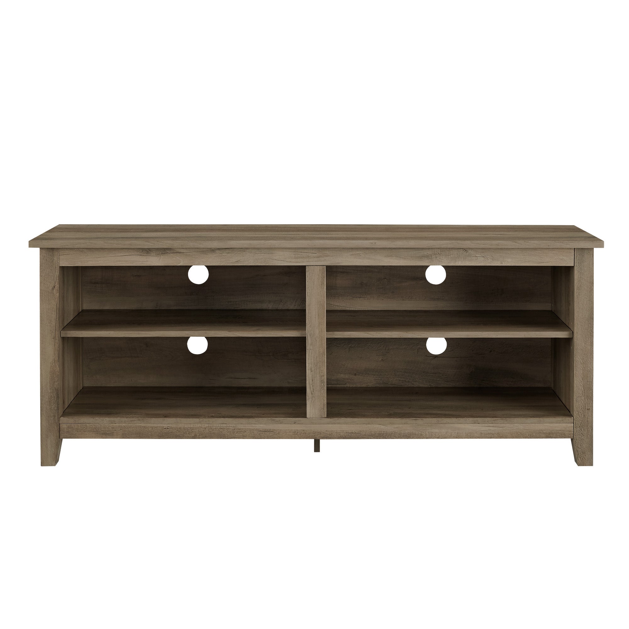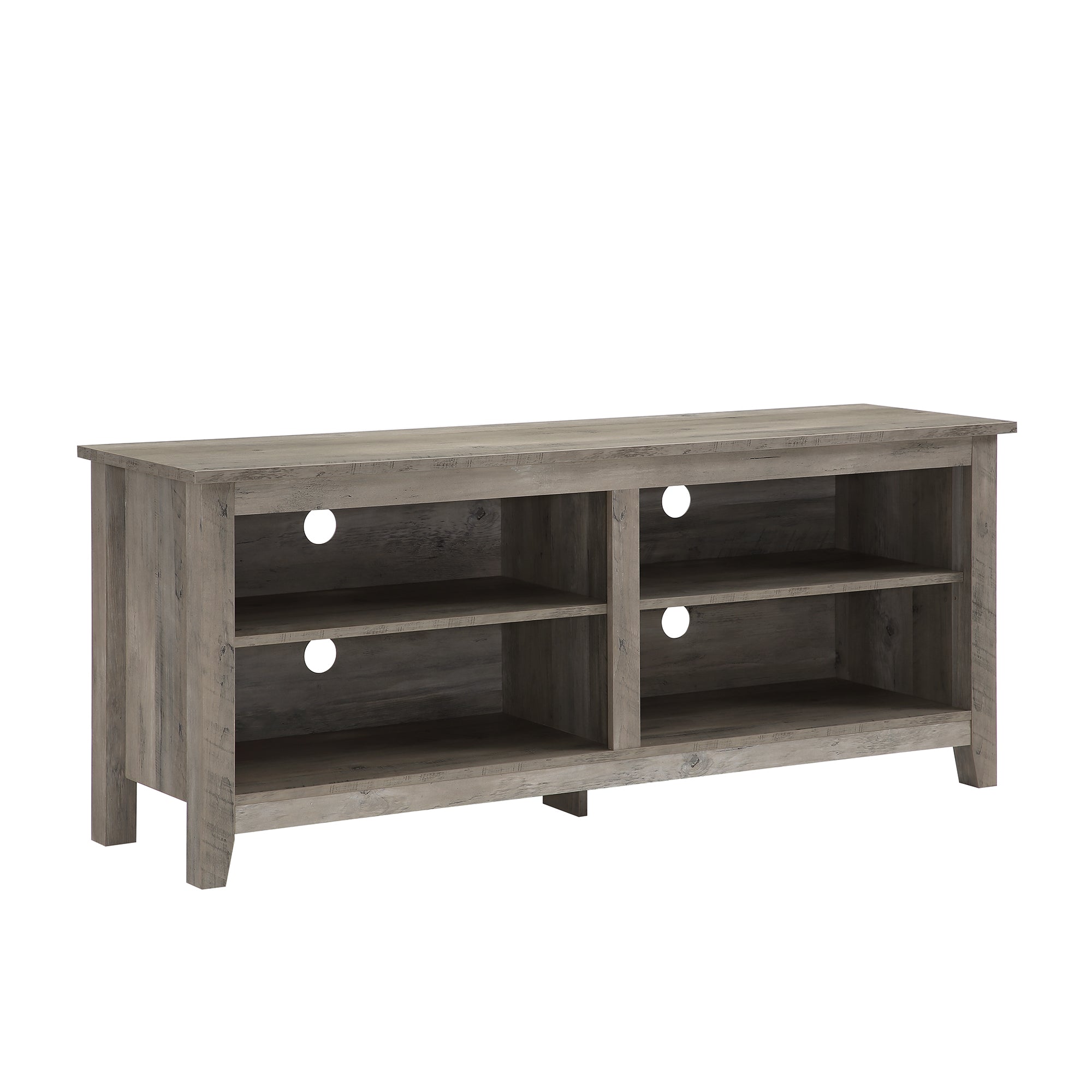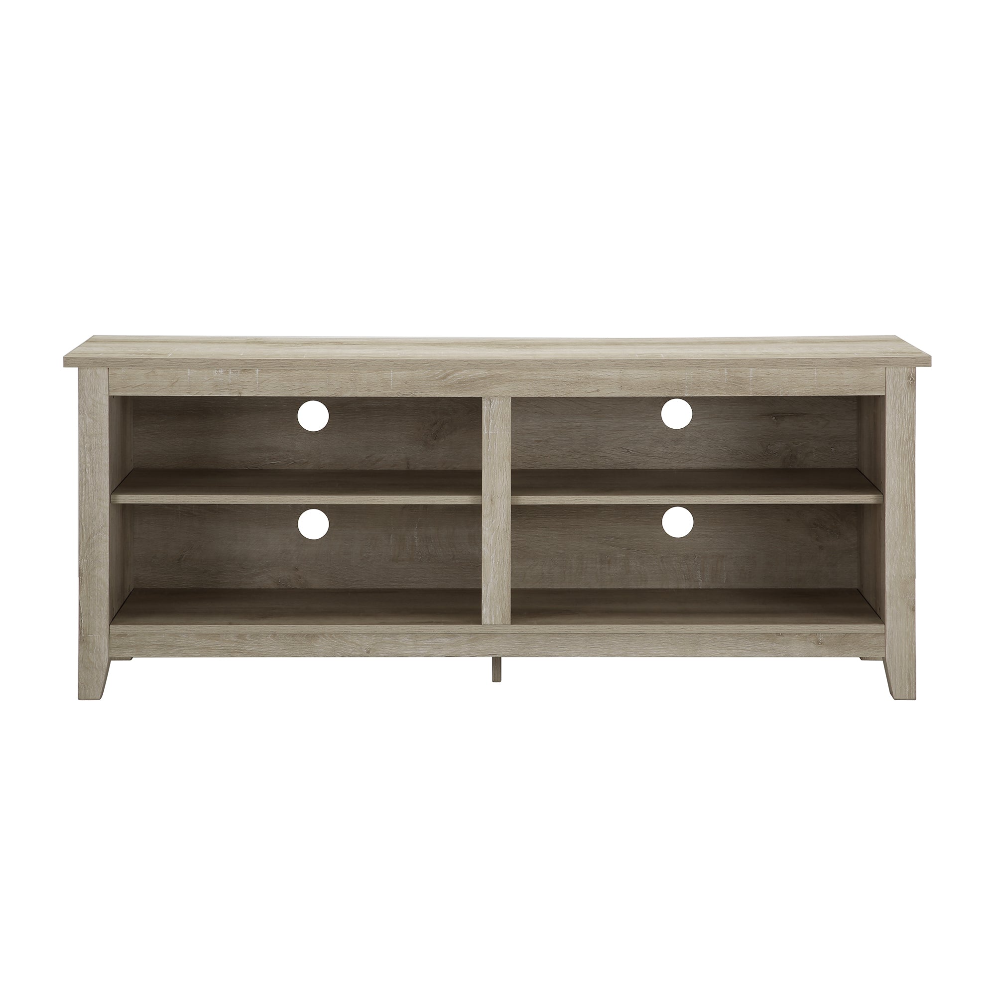 Display your TV in style with this 58-inch TV stand. Crafted from high-grade MDF with a durable laminate finish for a rich, textured surface, this storage console features two adjustable shelves on both sides for anything from your electronics to your home décor. With a cord management port at the back of each shelving space, you’ll never have to worry about a tangled mess of wires as it’ll keep them organized. This entertainment center mixes a traditional style with the on trend rustic farmhouse look with its simple design and will be a classic piece to your living room. This media stand will accommodate most flat-panel TVs up to 60 inches.