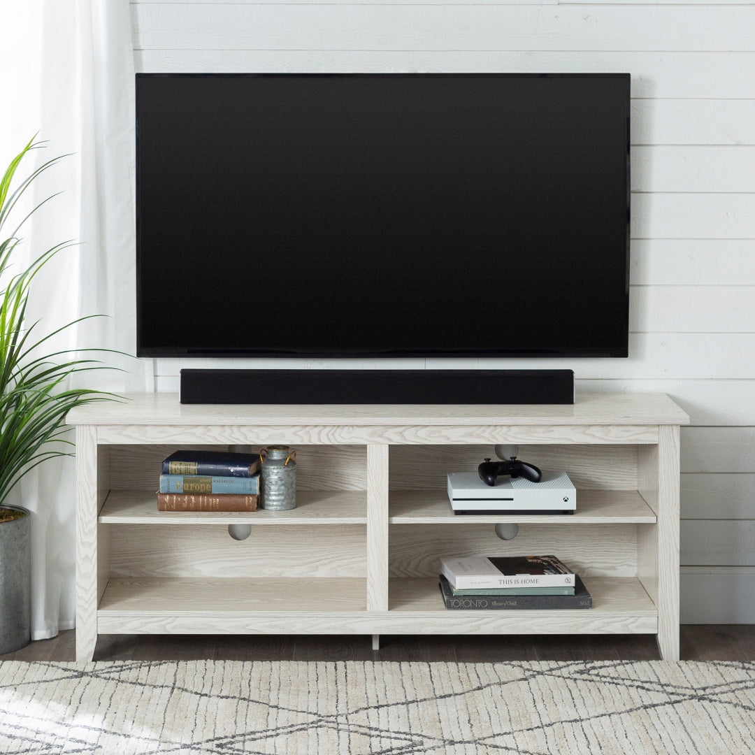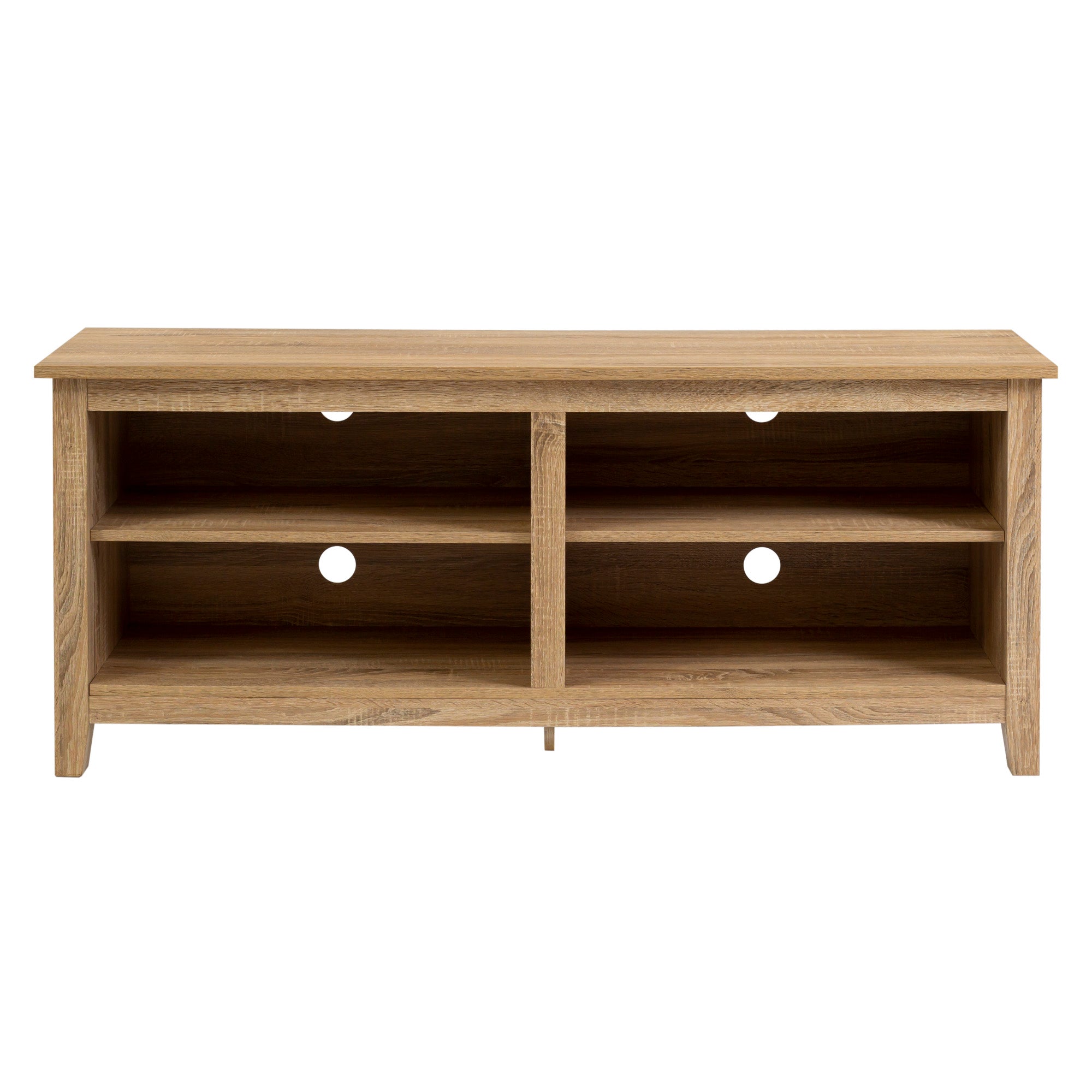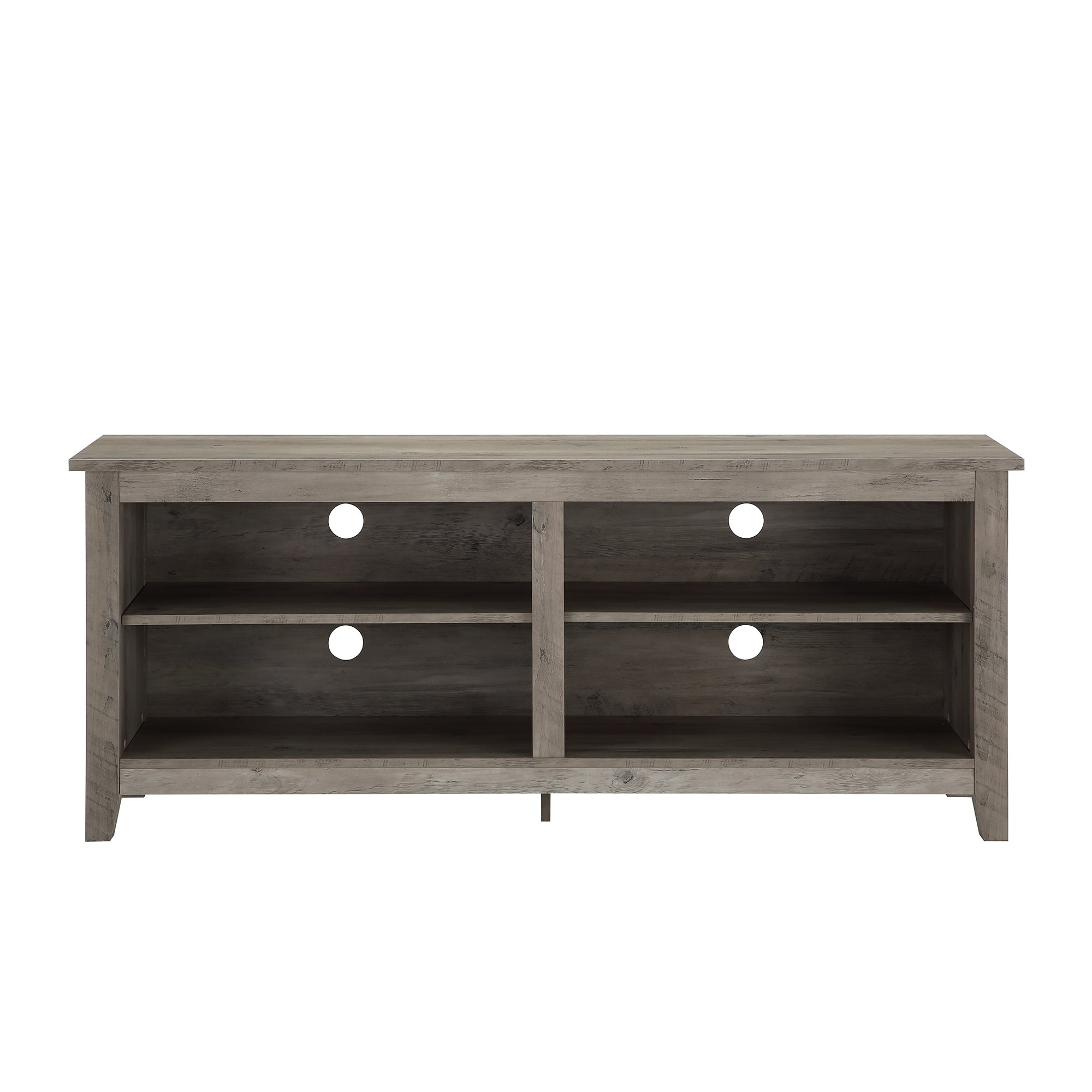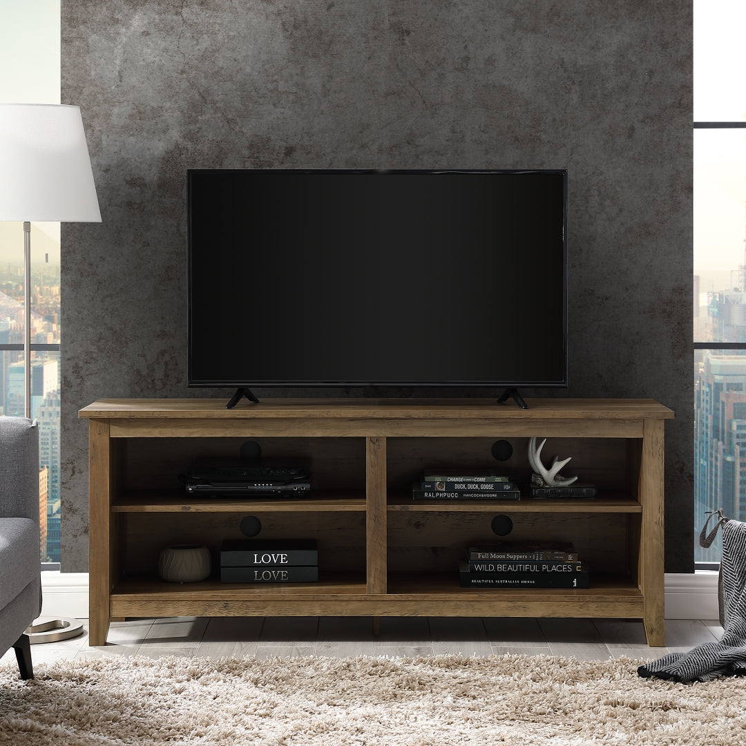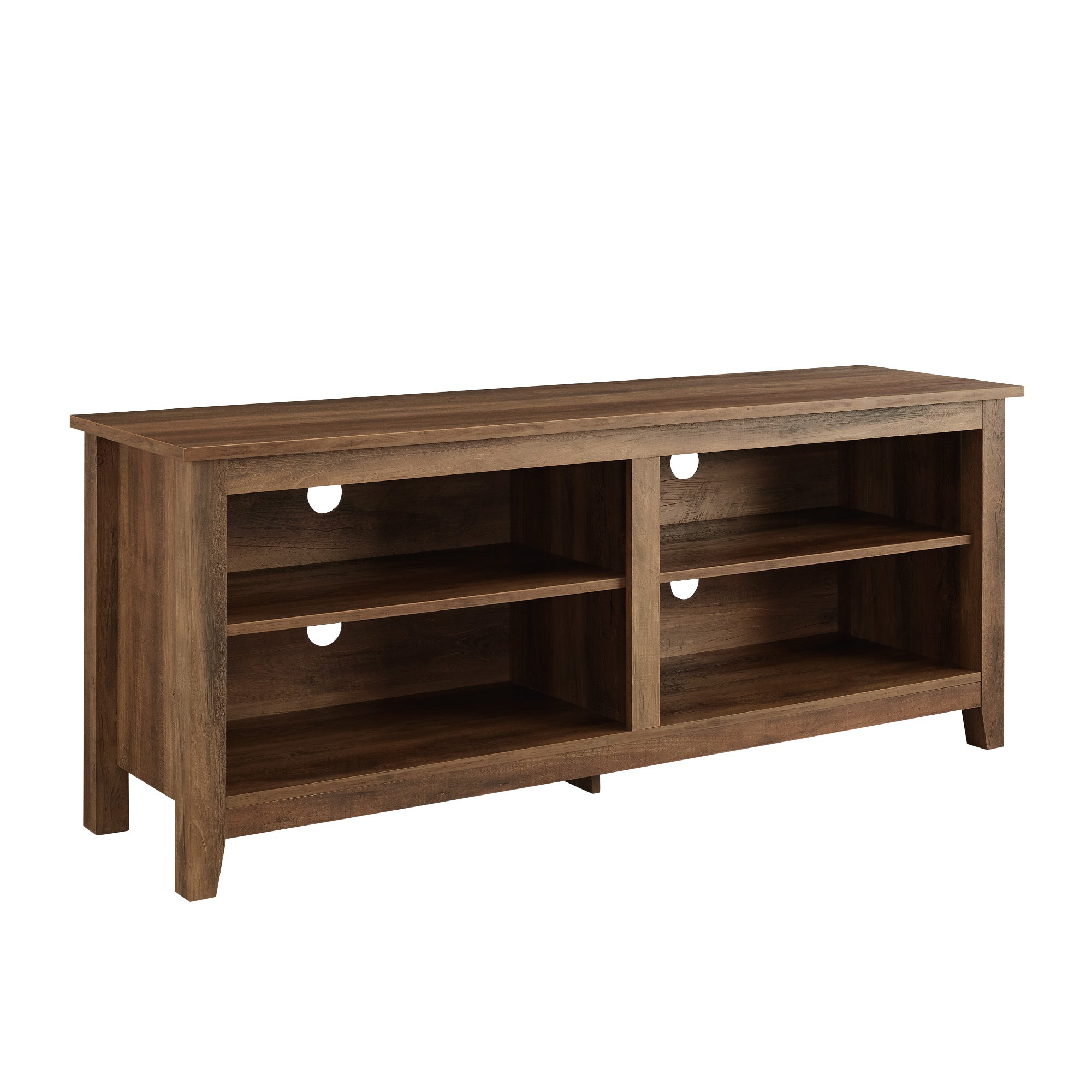 Display your TV in style with this 58-inch TV stand. Crafted from high-grade MDF with a durable laminate finish for a rich, textured surface, this storage console features two adjustable shelves on both sides for anything from your electronics to your home décor. With a cord management port at the back of each shelving space, you’ll never have to worry about a tangled mess of wires as it’ll keep them organized. This entertainment center mixes a traditional style with the on trend rustic farmhouse look with its simple design and will be a classic piece to your living room. This media stand will accommodate most flat-panel TVs up to 60 inches.