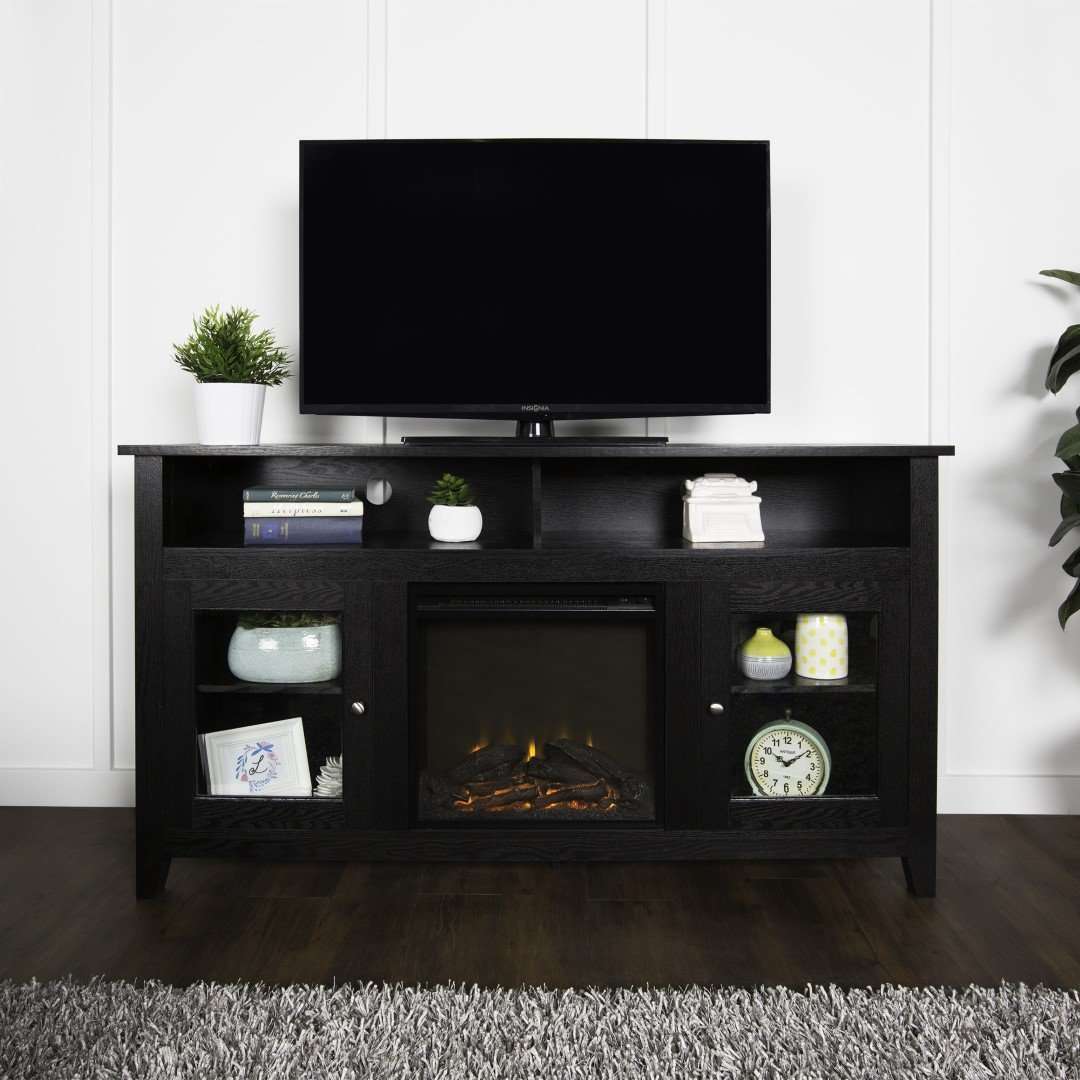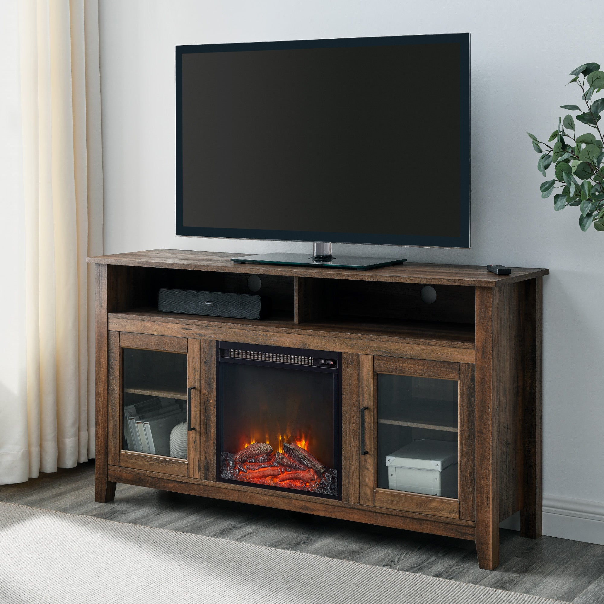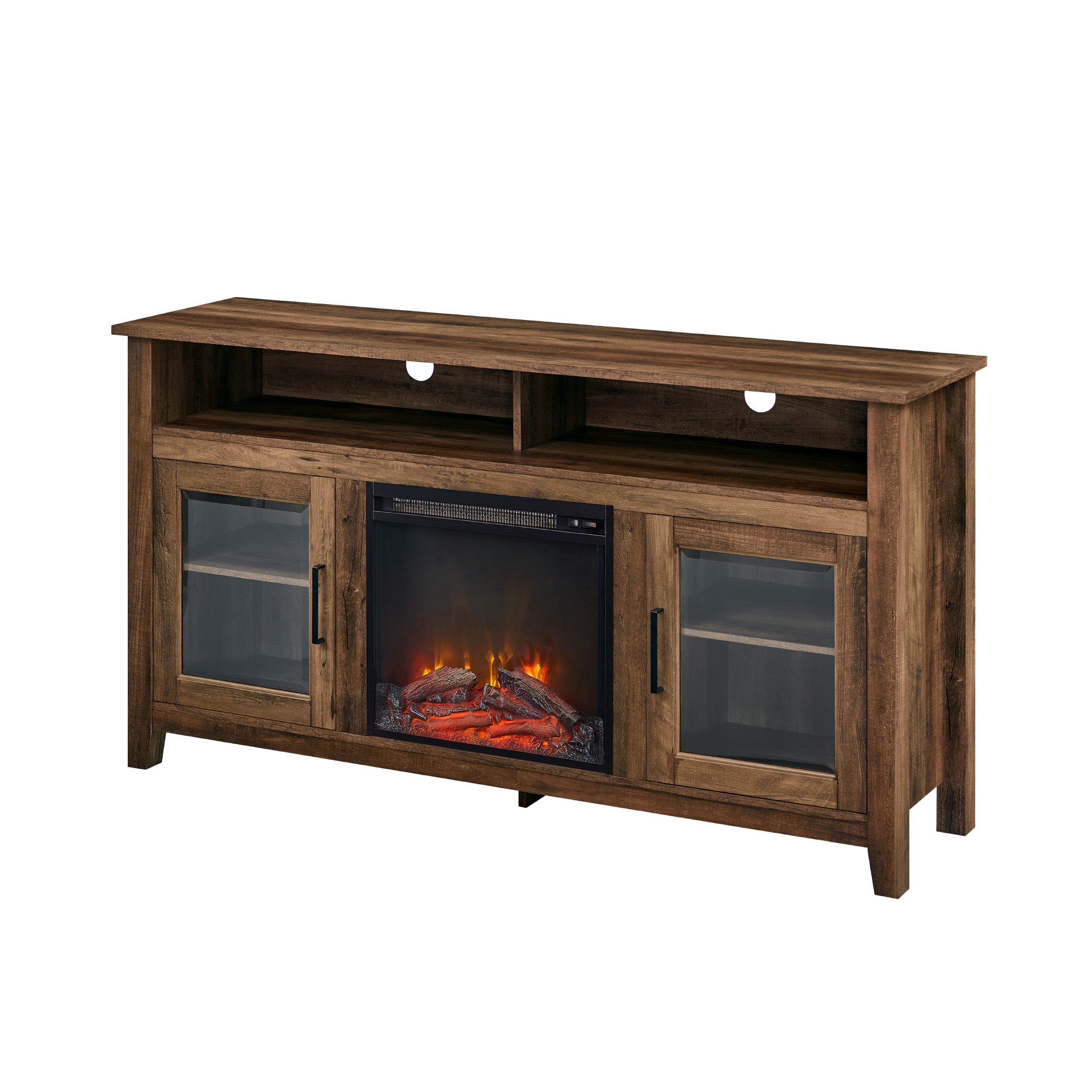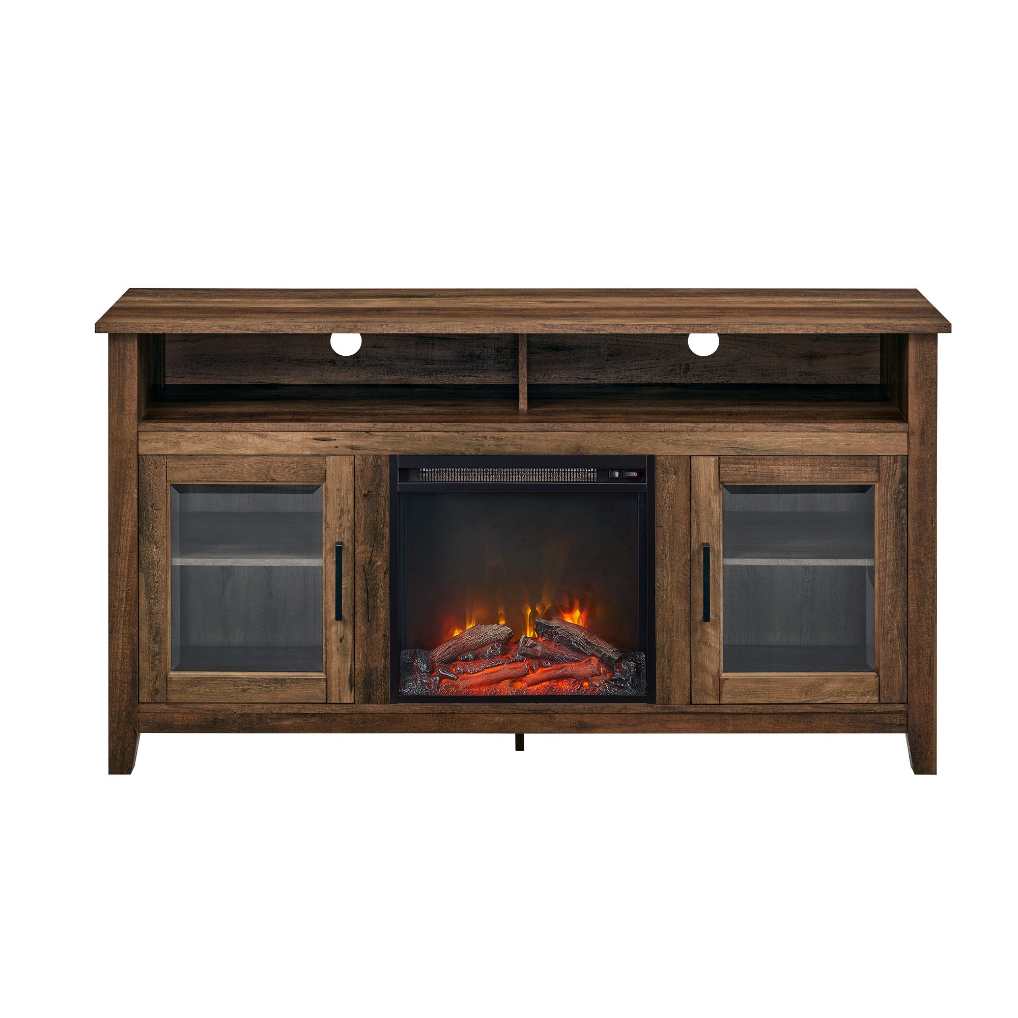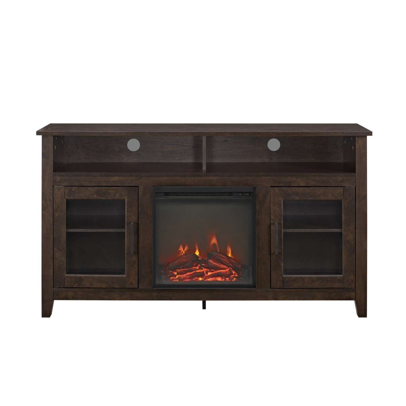 Create a warm, entertaining space in any room of your home with this 58-inch highboy media stand with an electric fireplace. Crafted from high-grade MDF with a durable laminate finish, this transitional style TV stand accommodates most flat panel TVs up to 60 inches. This entertainment center features adjustable shelving behind two glass doors, open shelving to fit your media components and accessories, and a cable management system to maintain a tidy space. Installation for electric fireplace requires no technician, simply plug into a standard household outlet and no venting required.