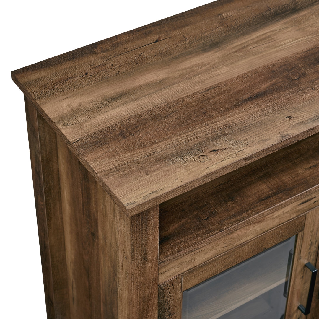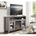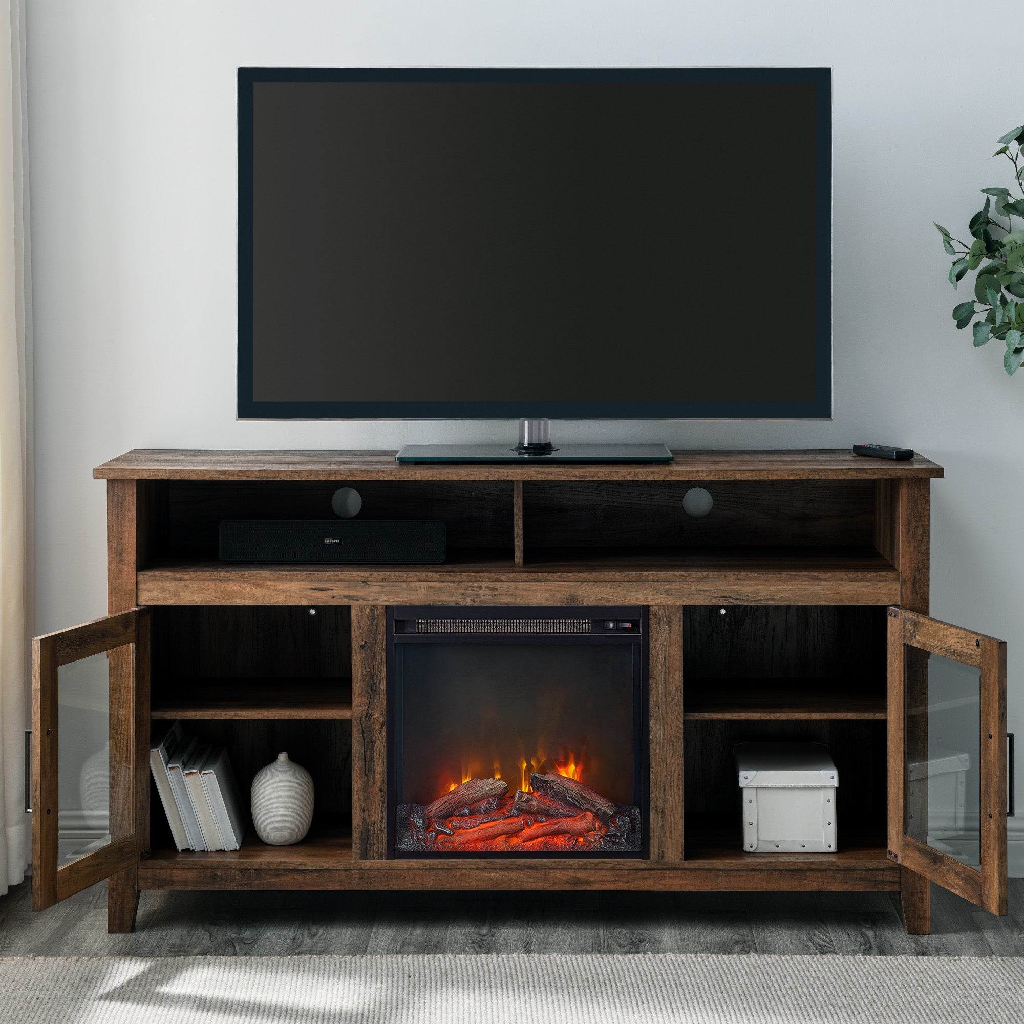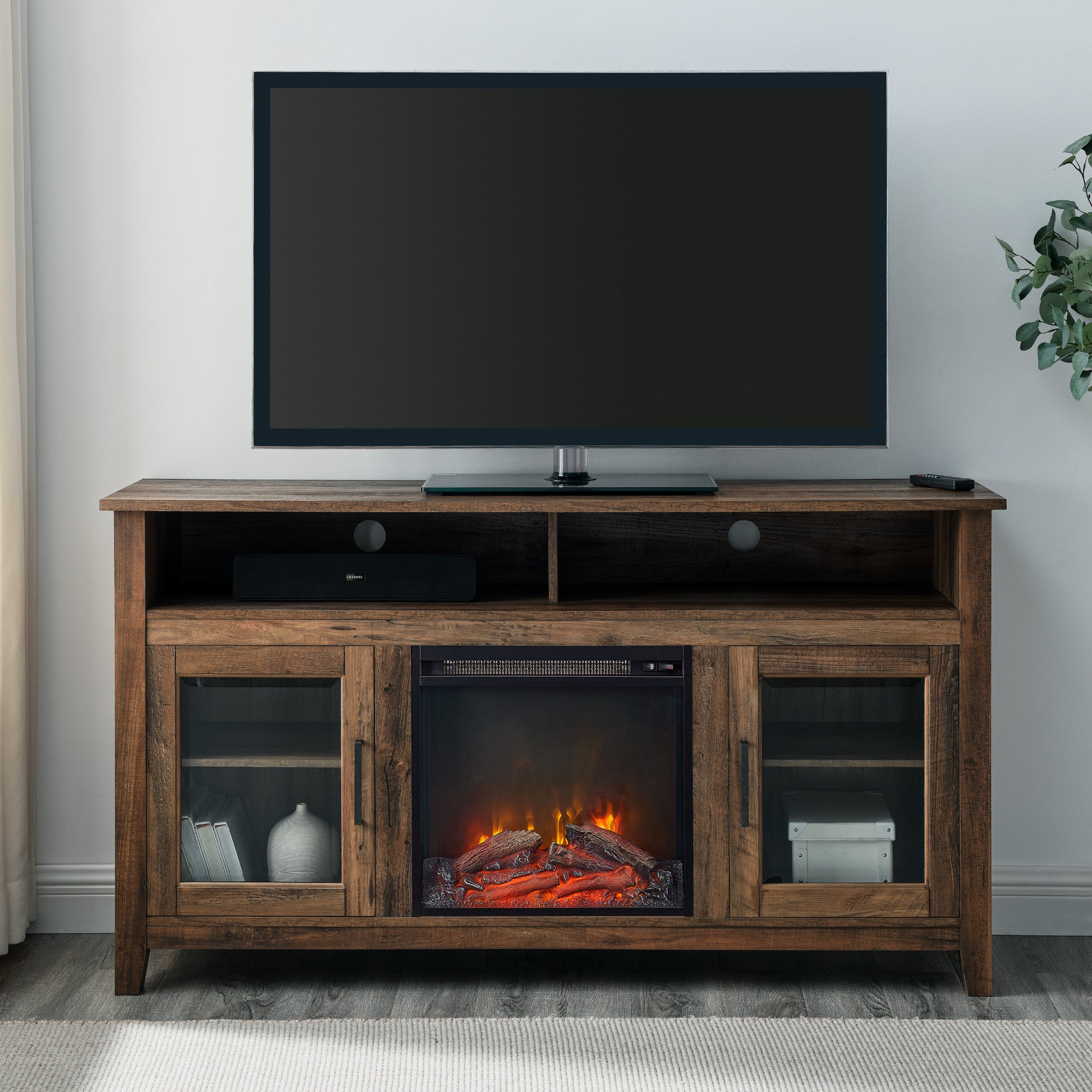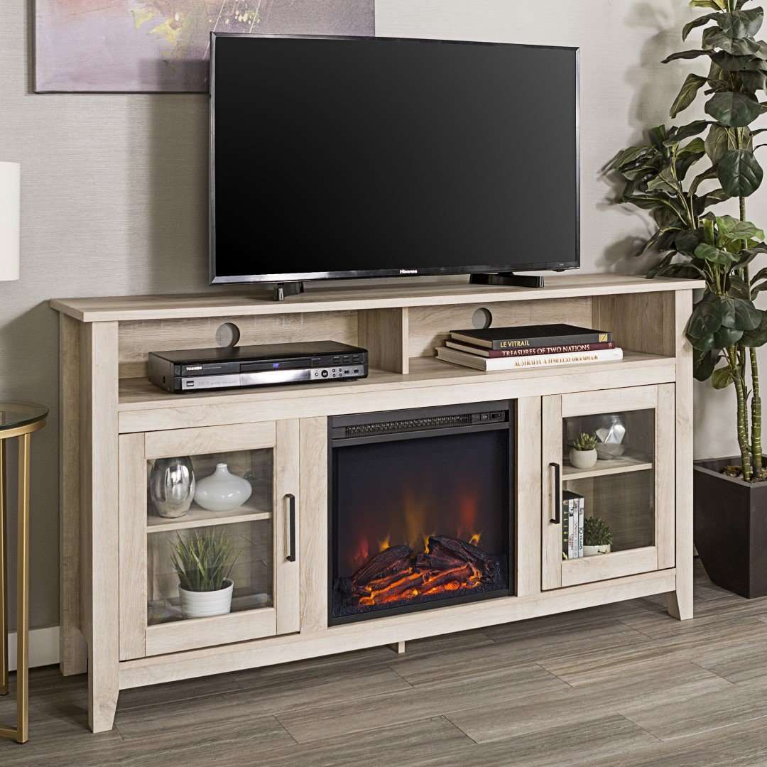 Create a warm, entertaining space in any room of your home with this 58-inch highboy media stand with an electric fireplace. Crafted from high-grade MDF with a durable laminate finish, this transitional style TV stand accommodates most flat panel TVs up to 60 inches. This entertainment center features adjustable shelving behind two glass doors, open shelving to fit your media components and accessories, and a cable management system to maintain a tidy space. Installation for electric fireplace requires no technician, simply plug into a standard household outlet and no venting required.