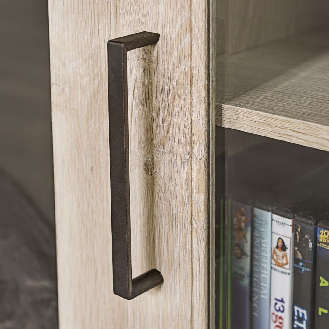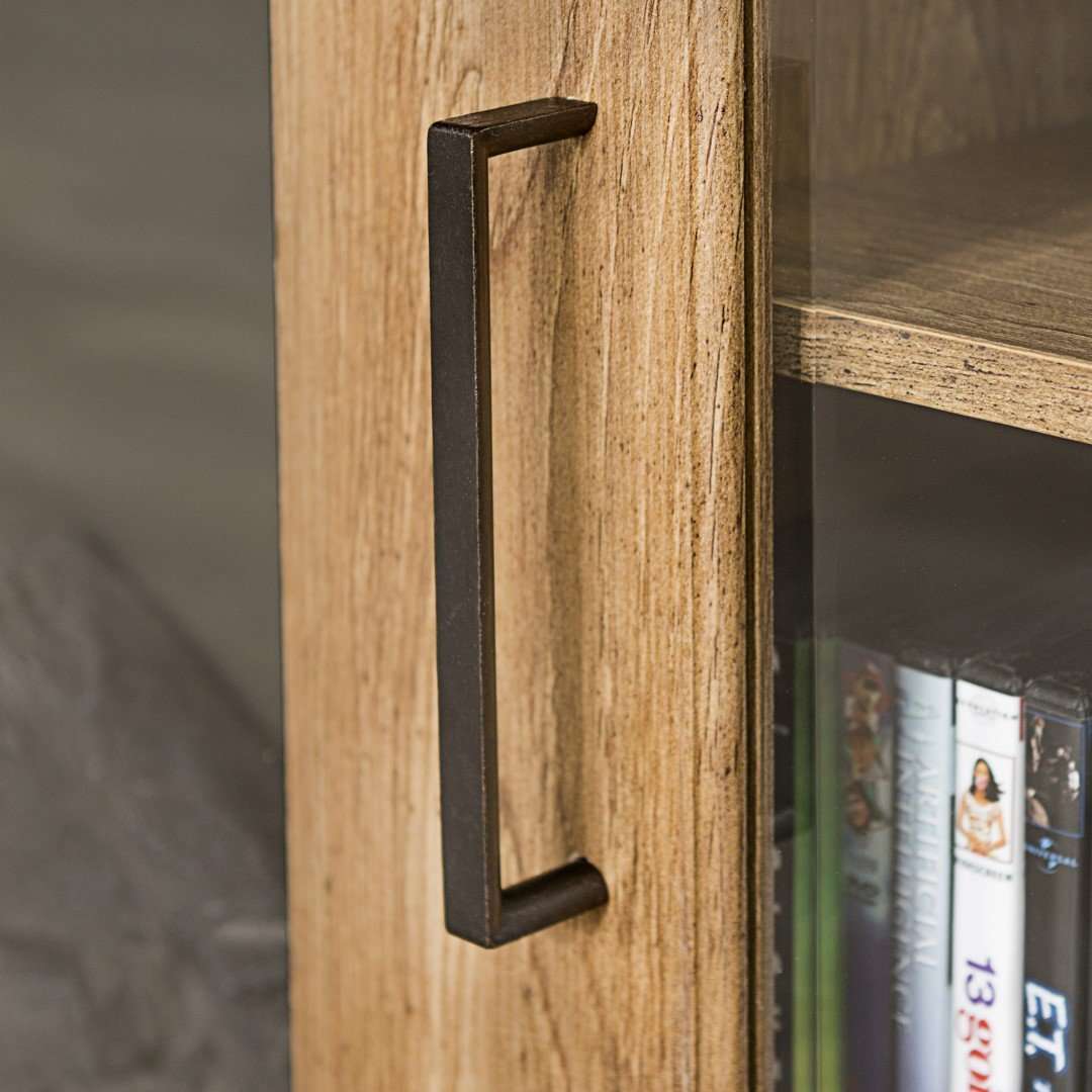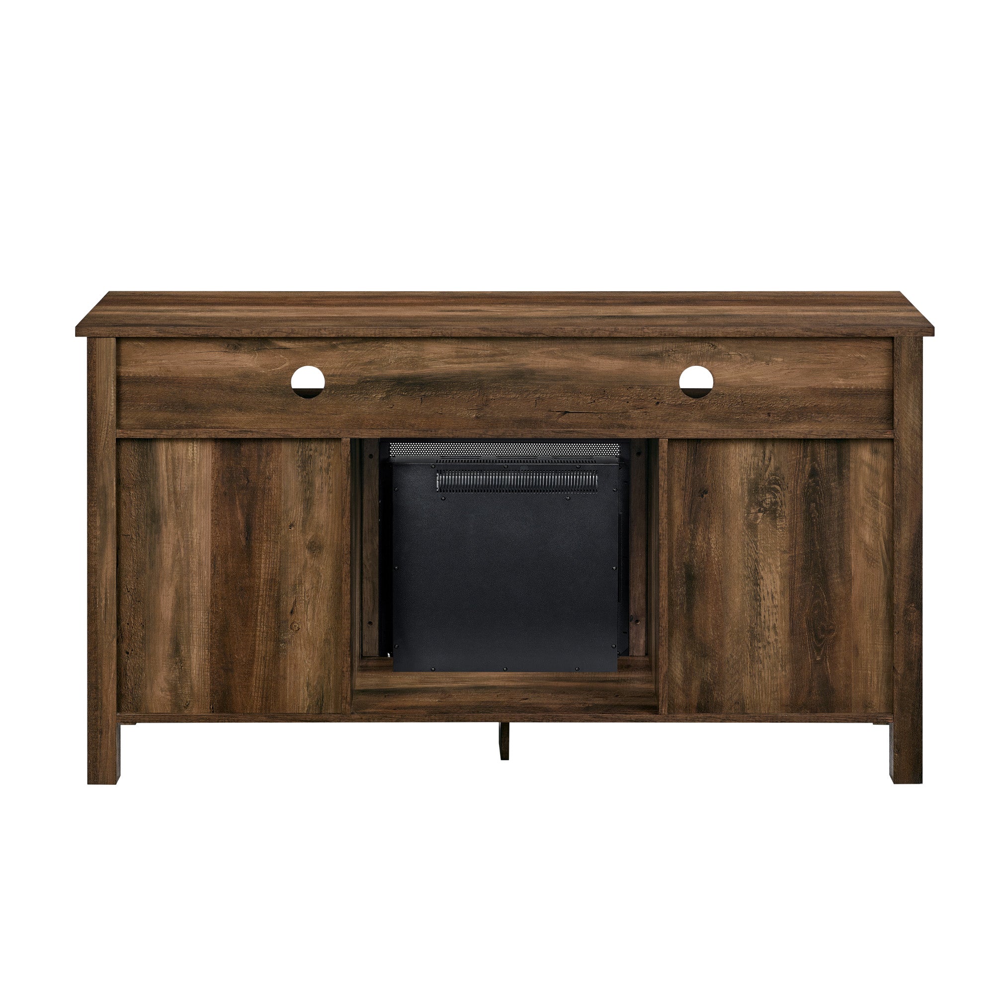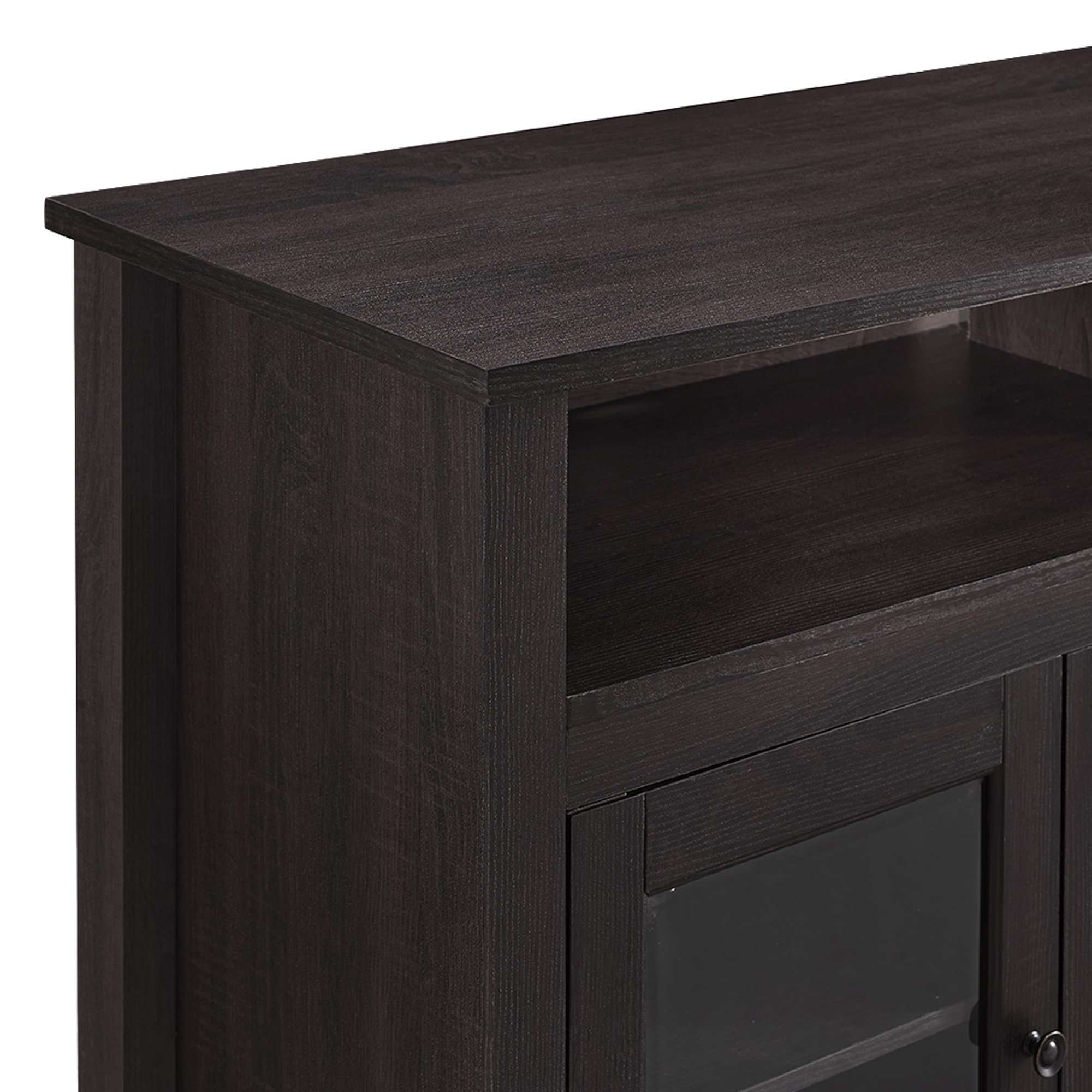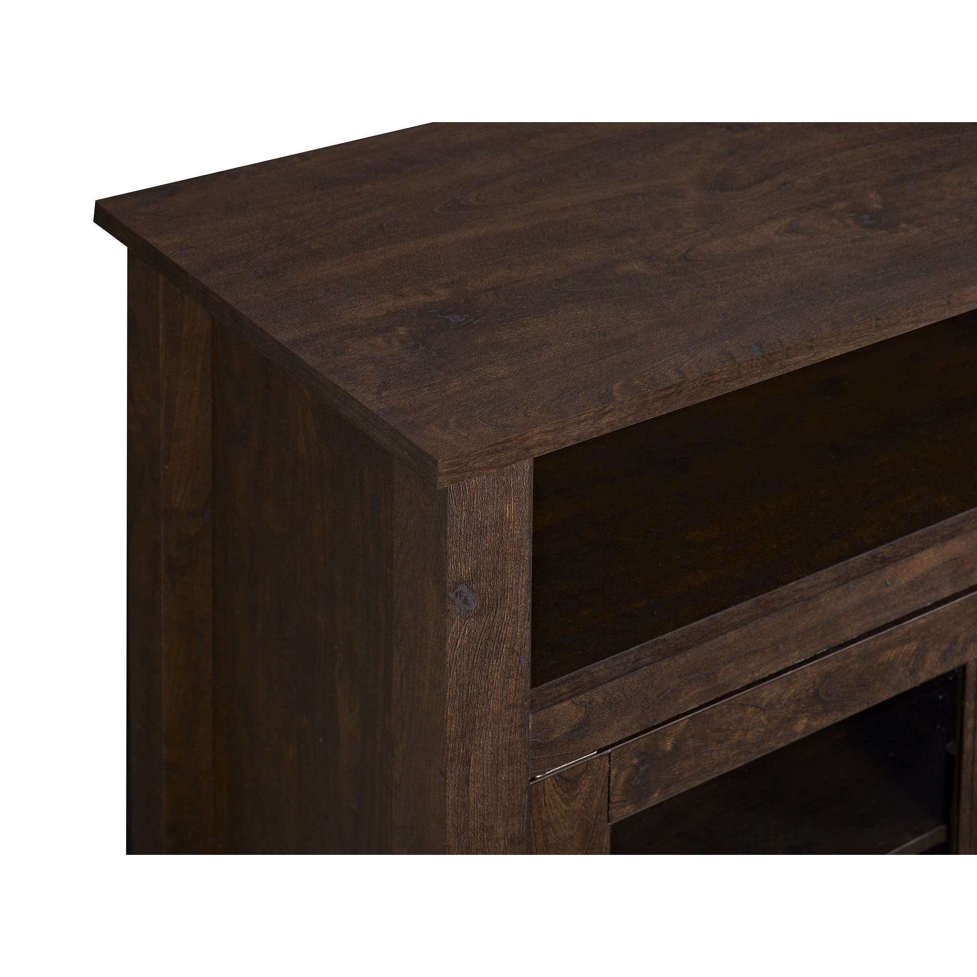 Create a warm, entertaining space in any room of your home with this 58-inch highboy media stand with an electric fireplace. Crafted from high-grade MDF with a durable laminate finish, this transitional style TV stand accommodates most flat panel TVs up to 60 inches. This entertainment center features adjustable shelving behind two glass doors, open shelving to fit your media components and accessories, and a cable management system to maintain a tidy space. Installation for electric fireplace requires no technician, simply plug into a standard household outlet and no venting required.