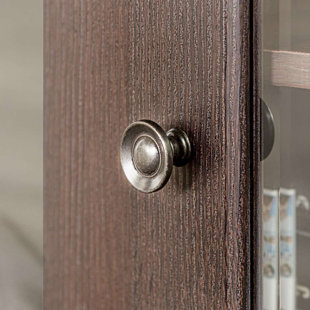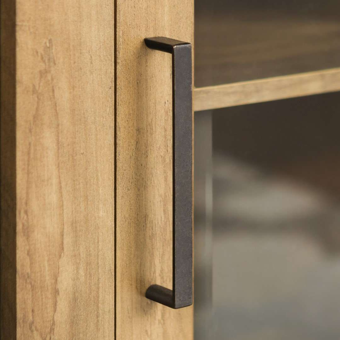 - Featuring tempered safety glass cabinet door fronts