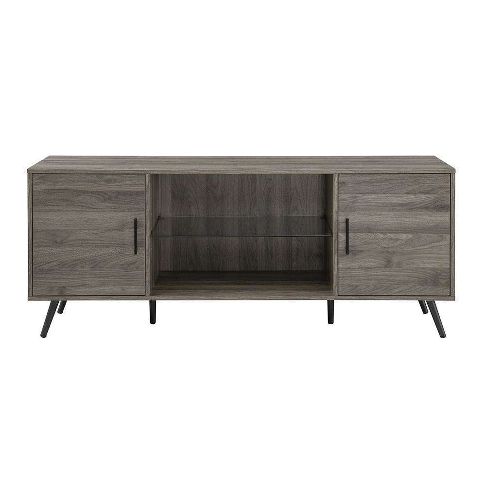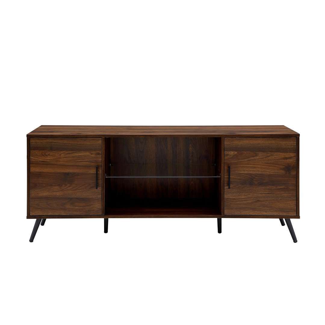 Slide into style with this versatile console. Designed with a mid-century aesthetic in mind the simplicity of this piece is also its strength. The center shelf is tempered glass, making the middle of the console uncomplicated and open to house anything from vinyl records to travel souvenirs. The two compartments on the side include adjustable shelving and cord management so your electronics can stay organized however you'd like. Plus, since they’re tucked away behind closed doors it manages visual clutter. This modern entertainment stand also includes adjustable rubber feet to protect your floor.