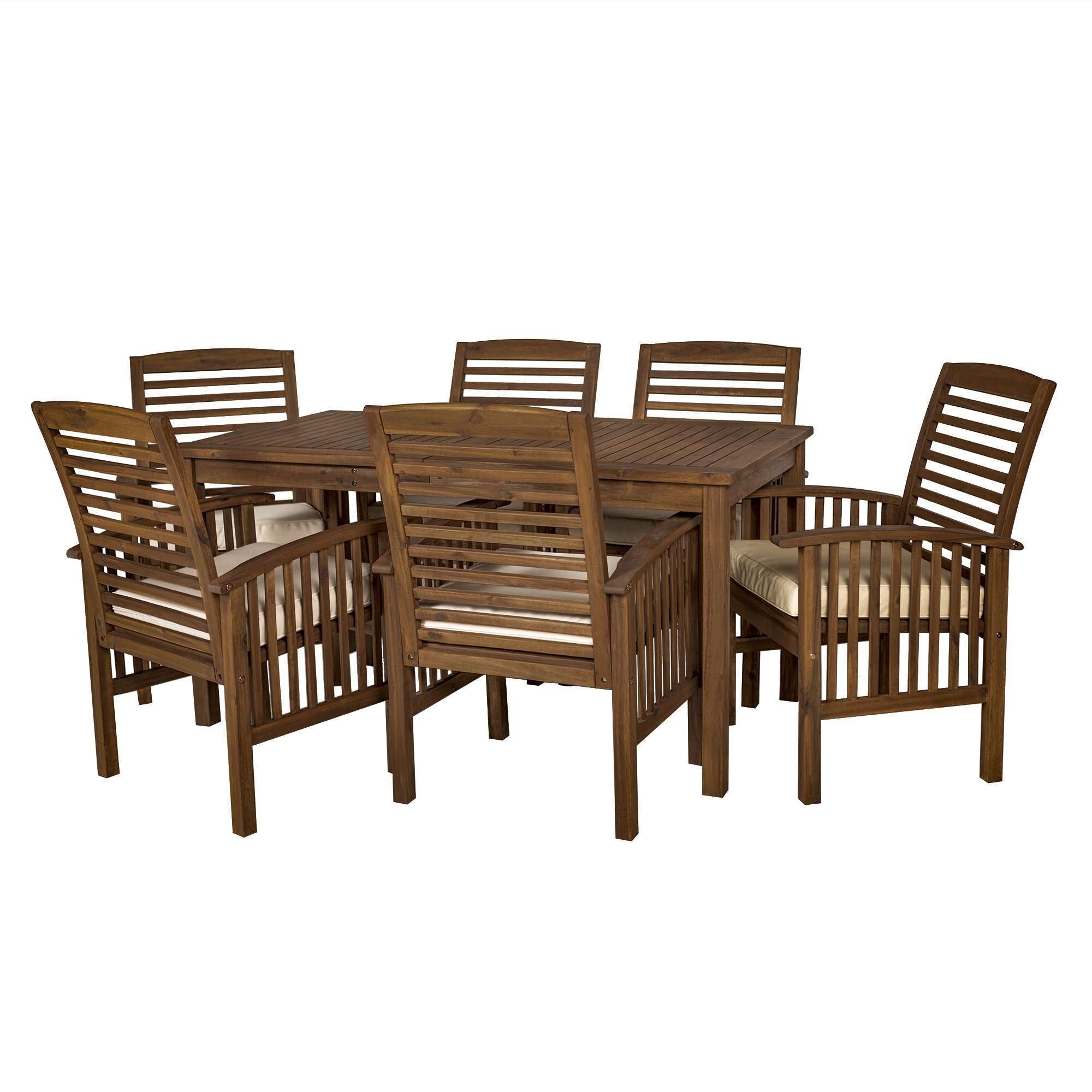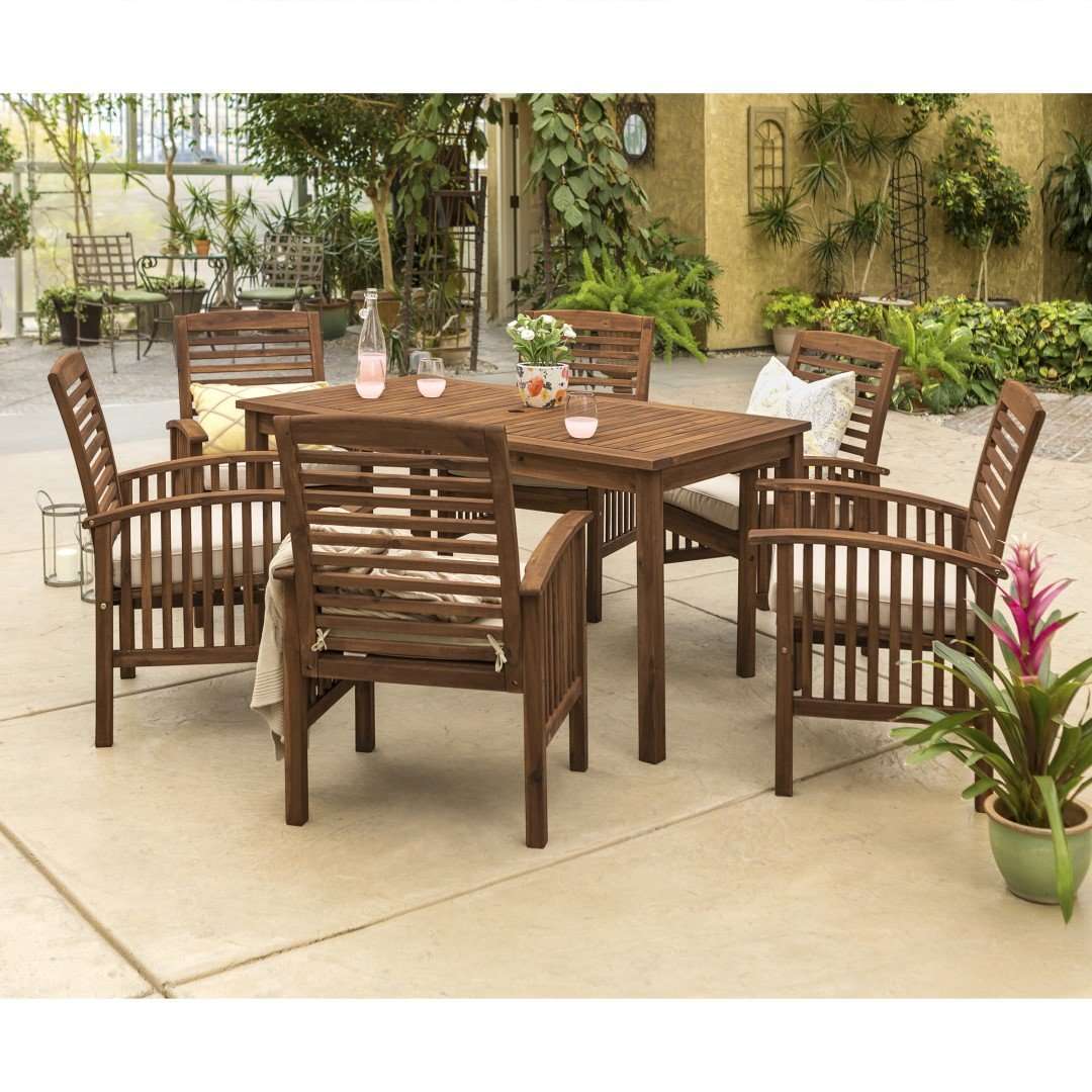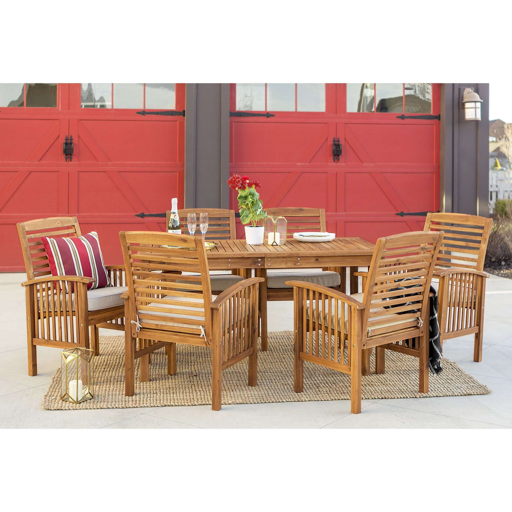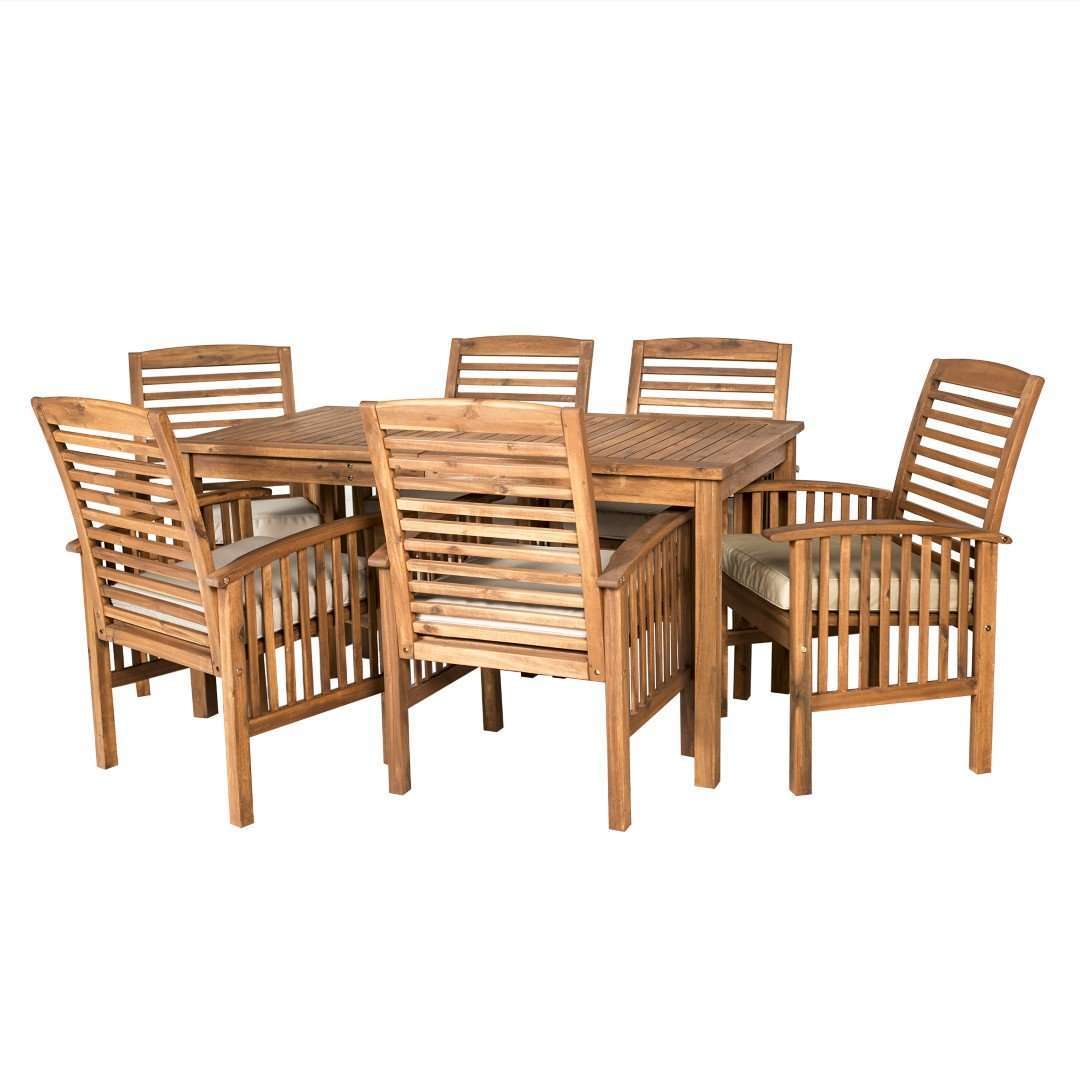 Make your outdoor space more welcoming with this 7-piece simple patio dining set. Made from acaia wood, this set is constructed with simple lines. The tops of the chairs and arm rests are smoothly curved to create a more relaxed look and feel for your patio. Extra lines of wood throughout the dining set give more structure, while the minor details of the hardware complement the design. Fusing modern and contemporary style to a more classic and traditional style, while maintaining an overall simple design. Having six chairs provides room for everyone to go outside and enjoy nature together. Includes outdoor dining table and six chairs.