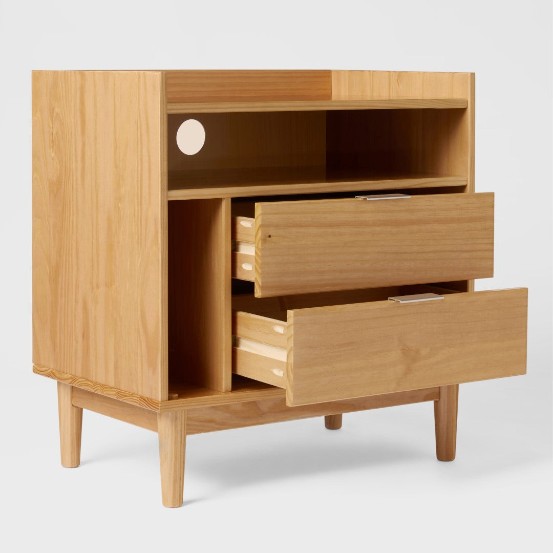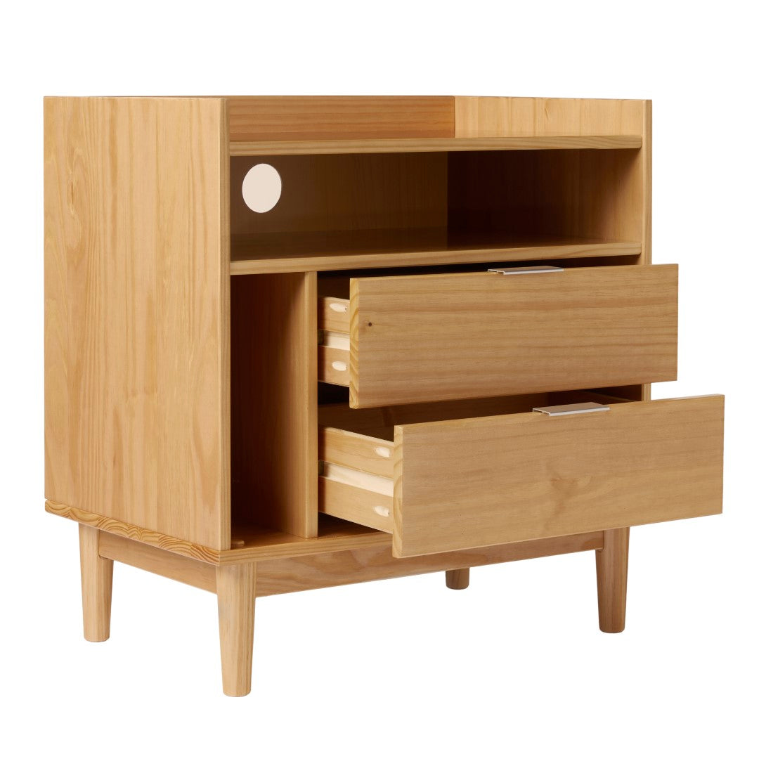 - Feature 9: 1 vertical shelf, and 2 drawers with wood drawer runners. The feet are straight round tapered.