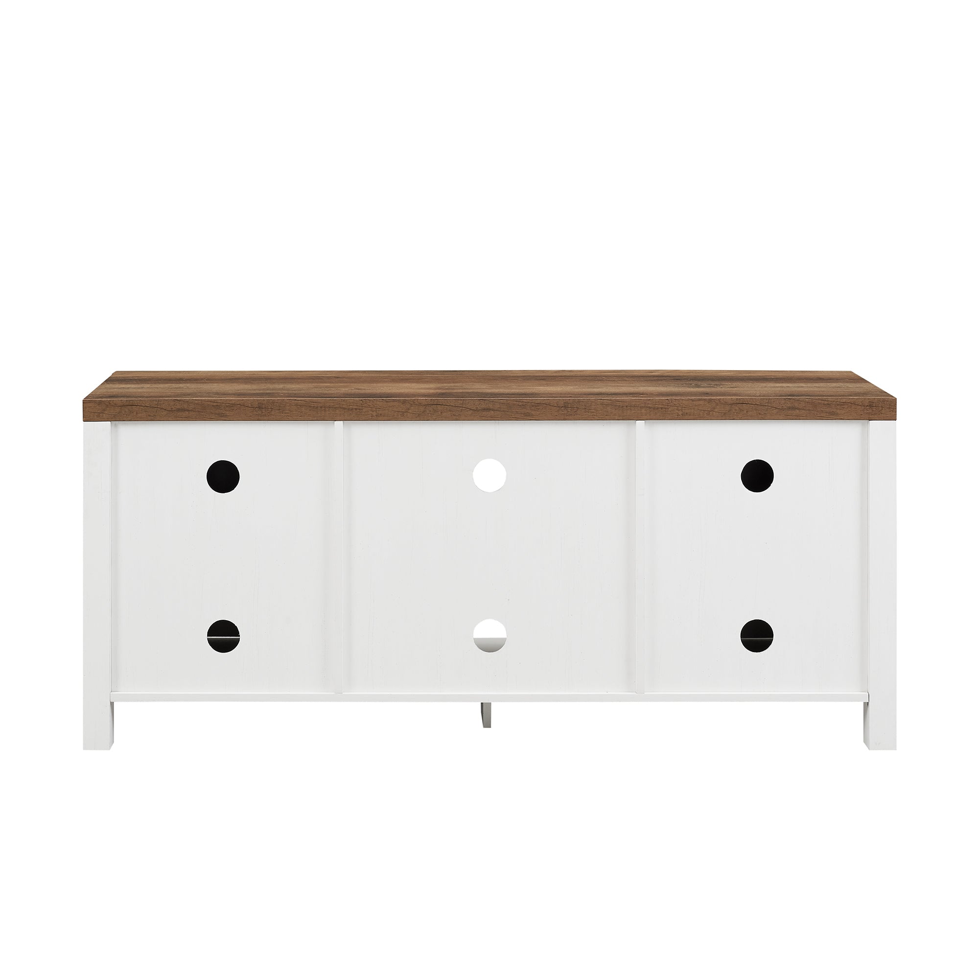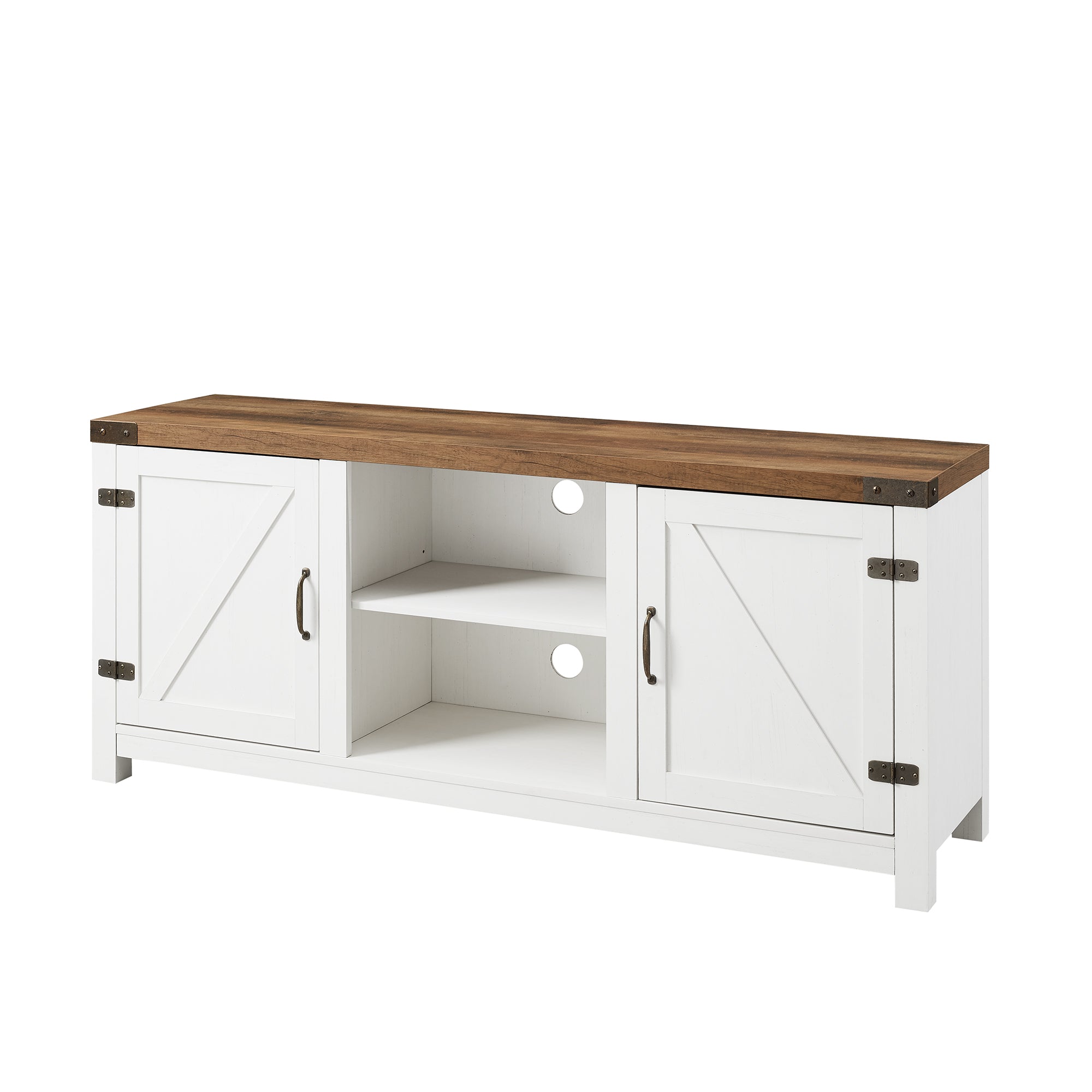 Let your space speak your cozy lingo with this double barn door TV stand. Settle into movie night with a piece that flaunts a subtle farmhouse charm with equally admirable defining features, like its metal corner accents, exposed hinges, and bronze hardware. Three adjustable shelves are prime places for your media essentials for hassle-free watch parties or solo series binges. Two barn doors offer concealed storage for bins or movies, and a center open cubby debuts display space for décor. Come home to comfort, and retreat to your favorite show and the homey refuge of this two-toned TV stand.