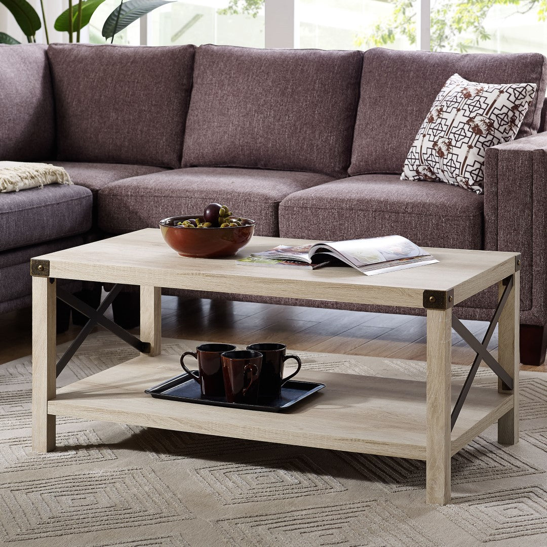 Give your living room some rustic style with our industrial inspired coffee table. Black painted metal accents are featured on the top corners and x-shaped sides, which contrast beautifully with the wood textured surface made from durable laminate. Our coffee table provides just enough space for placing down items from your TV remote to your mail, while also having a shelf underneath for simple storage or decor.