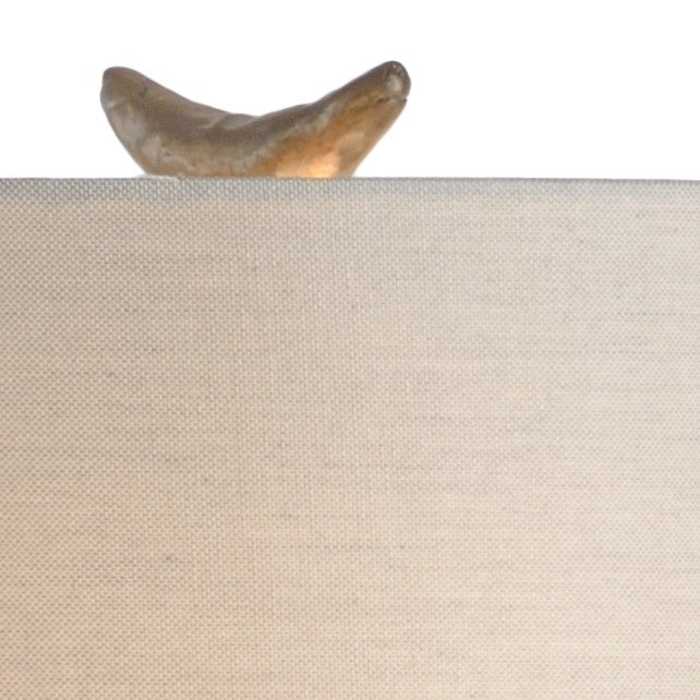 - Shade: Neutral light taupe linen drum shade that directs light downward to highlight the textured sculpture and provide task/ambient lighting