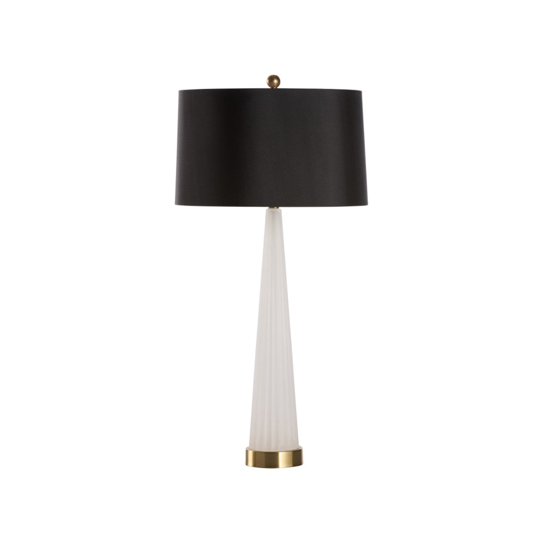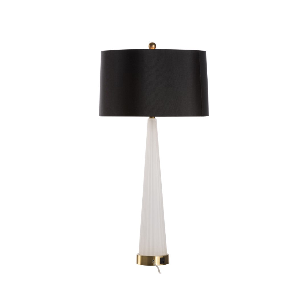 The Ava Lamp brings refined, modern elegance to any room with its tapered fluted glass body, polished brass base, and striking black shade. Designed for both style and everyday convenience, it pairs classic materials with a built-in USB port for easy device charging — ideal for bedside, desk, or living area lighting.