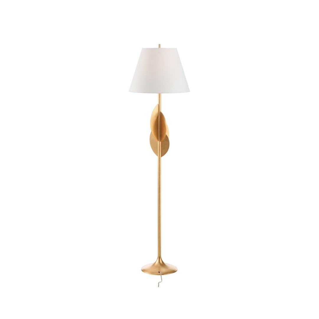 Sculptural and sophisticated, this floor lamp brings modern elegance and warm ambient light to living rooms, bedrooms, or entryways. The Avalon Floor Lamp pairs a striking gold leaf finish and layered disc accents with a tapered shade to create a balanced, gallery-ready silhouette that works equally well as a focal point or complementary accent.