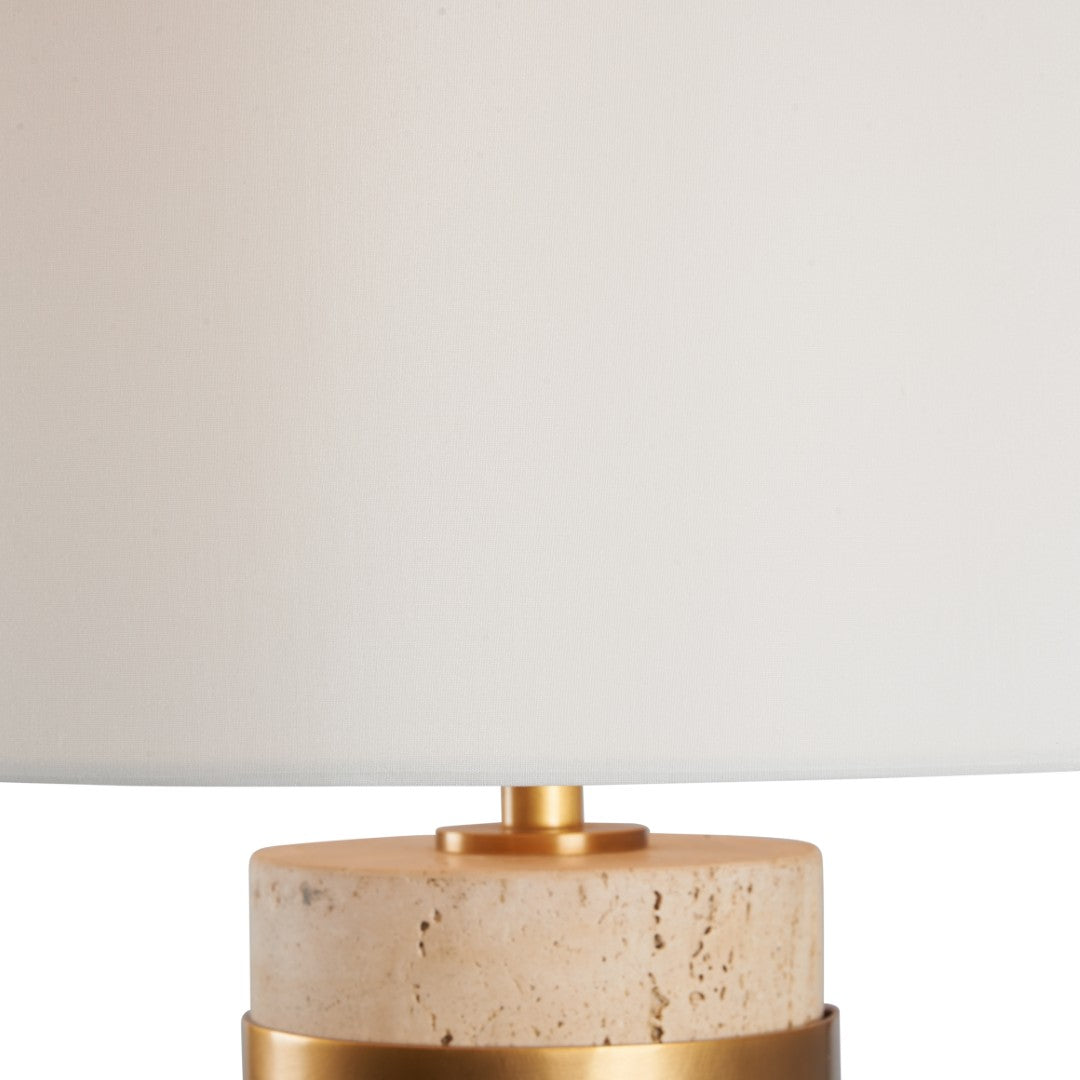 The Bridgeport Lamp melds classic materials with modern silhouette to elevate living rooms, bedrooms, or entryways. Its warm travertine stone base and sculptural antique brass wrap create a refined focal point, while the crisp white drum shade diffuses light for a soft, inviting ambiance.