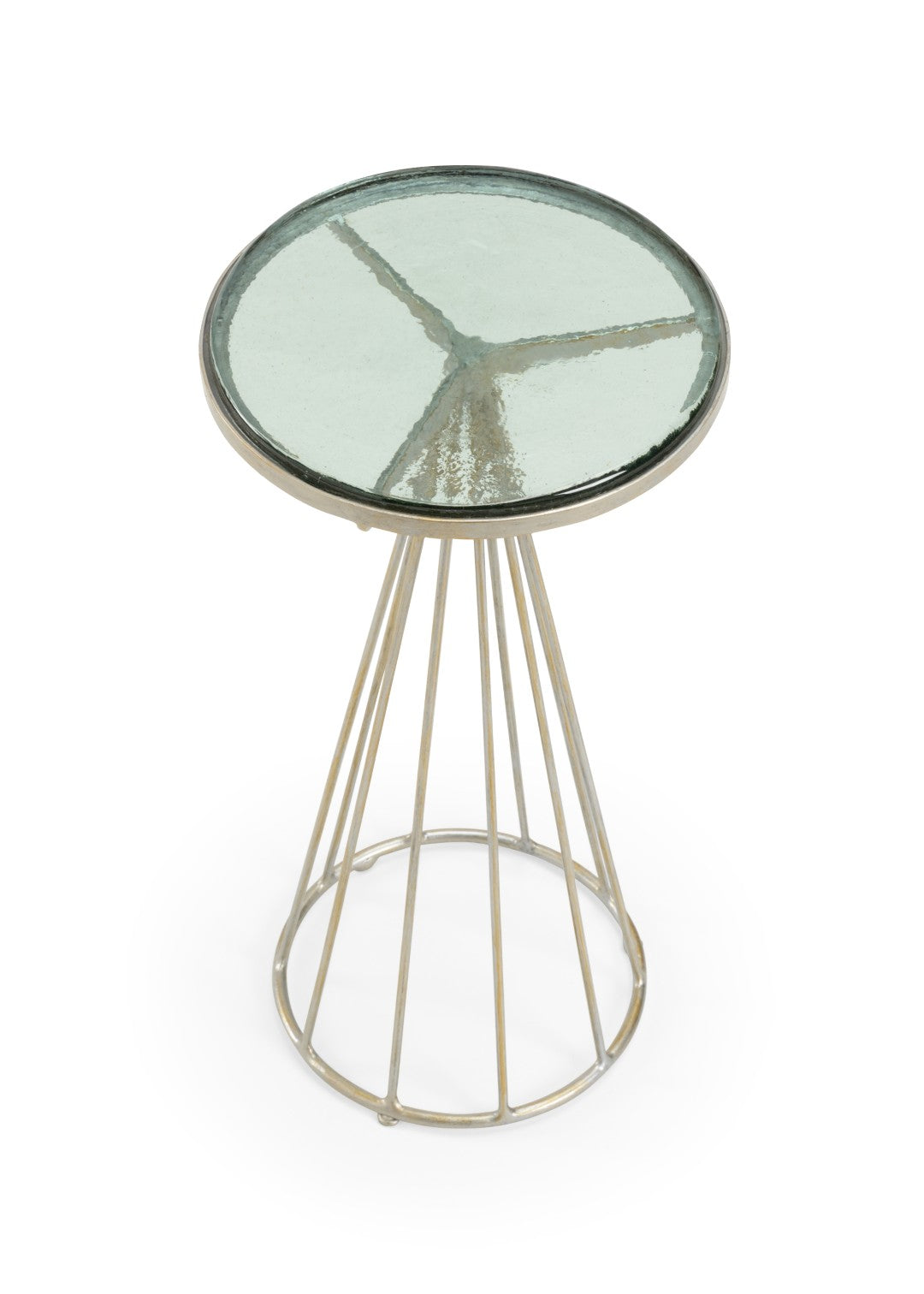 A charming accent table that blends artisanal craftsmanship with eco-friendly materials — perfect as a drink table or stylish side table. Hand-forged iron and recycled green glass combine with an antique silver finish to create a versatile piece that adds texture and understated elegance to contemporary, coastal, or vintage-inspired interiors.