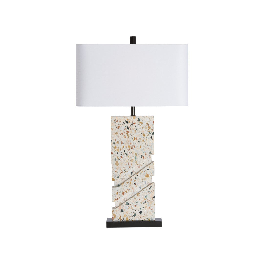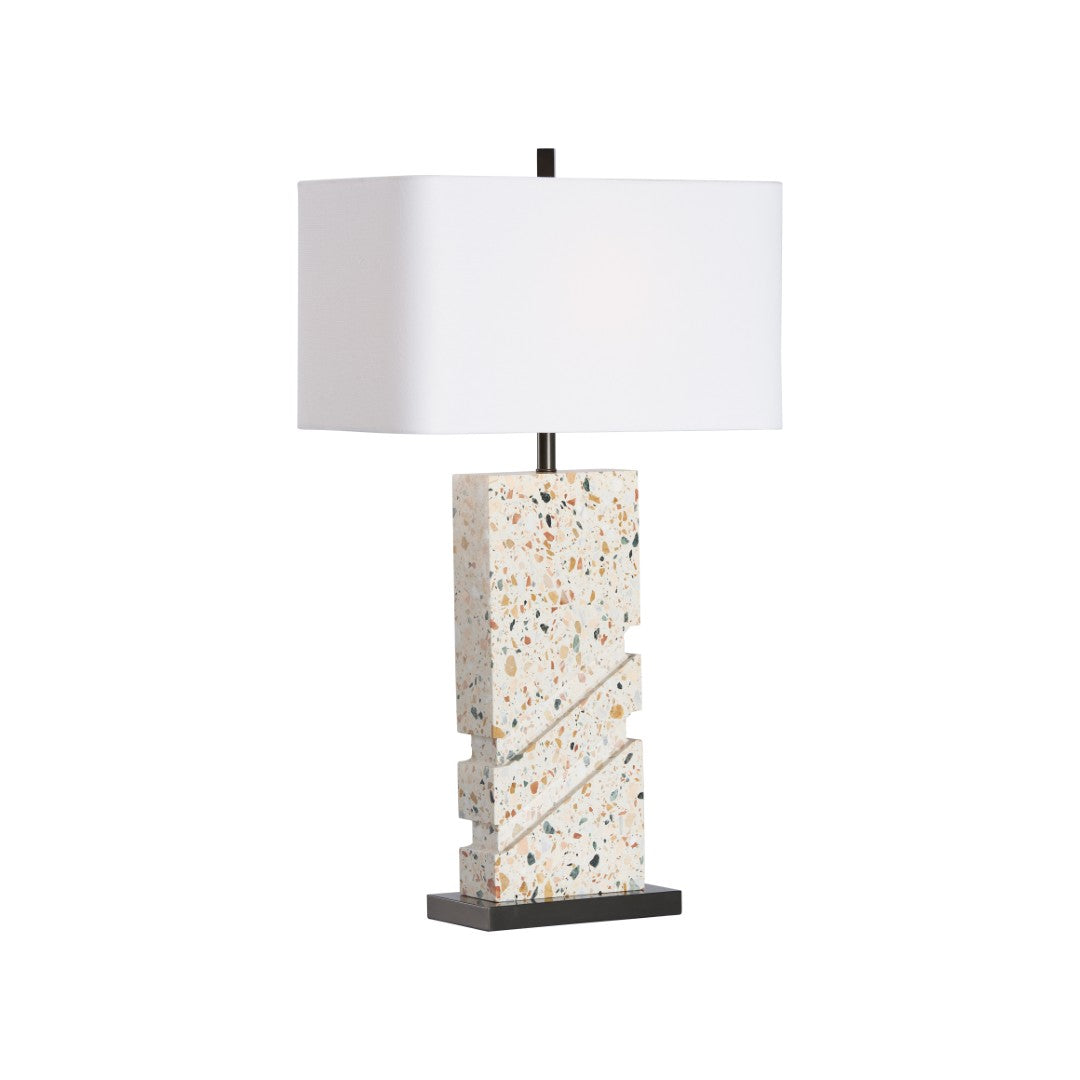 Make a bold, artful statement with the Chandra Lamp — a modern table lamp that pairs sculptural terrazzo with clean geometric lines to elevate any room. Its textured terrazzo base, angular faceting, and slim bronze platform create a refined contrast beneath a crisp rectangular shade, offering both decorative interest and practical illumination for living rooms, bedrooms, or offices.