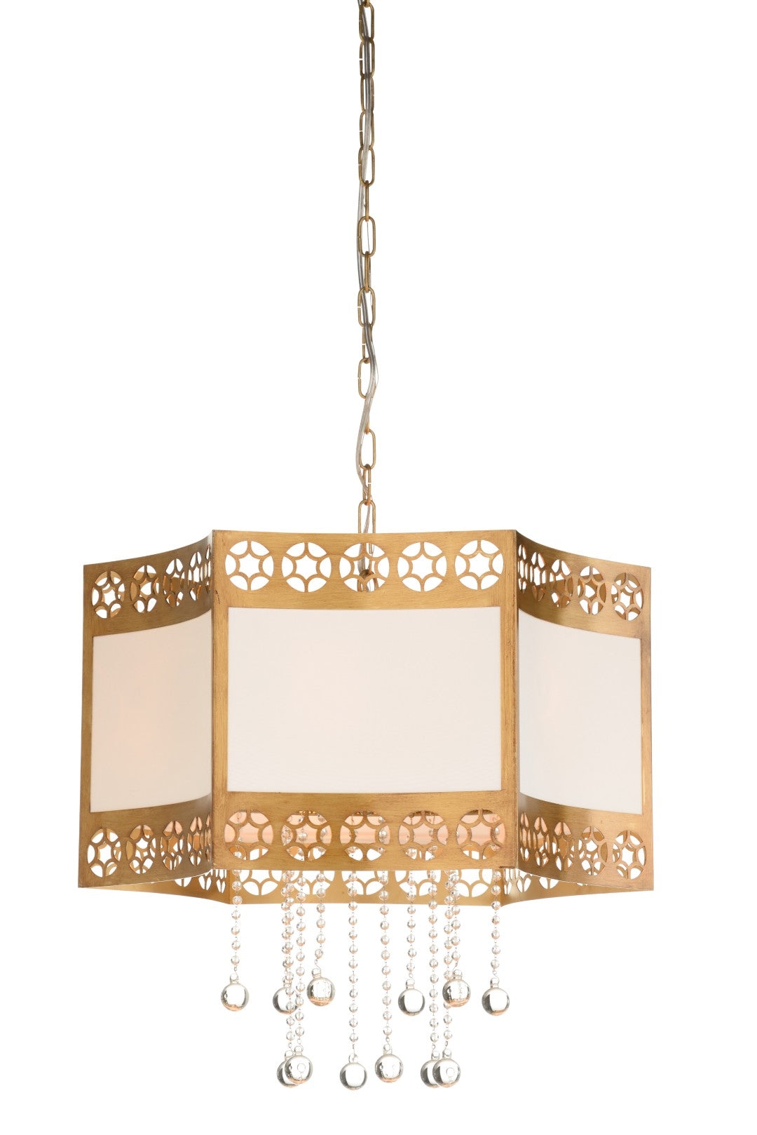 Inspired by an elegant jewelry motif, this handcrafted Italian chandelier from the Cheryl Luckett collection brings refined warmth and modern glamour to dining rooms, foyers, or living spaces. Its hexagonal silhouette, fabric-paneled shade and clear crystal accents diffuse and reflect light for a layered, lustrous glow that reads equally at home in contemporary and transitional interiors.