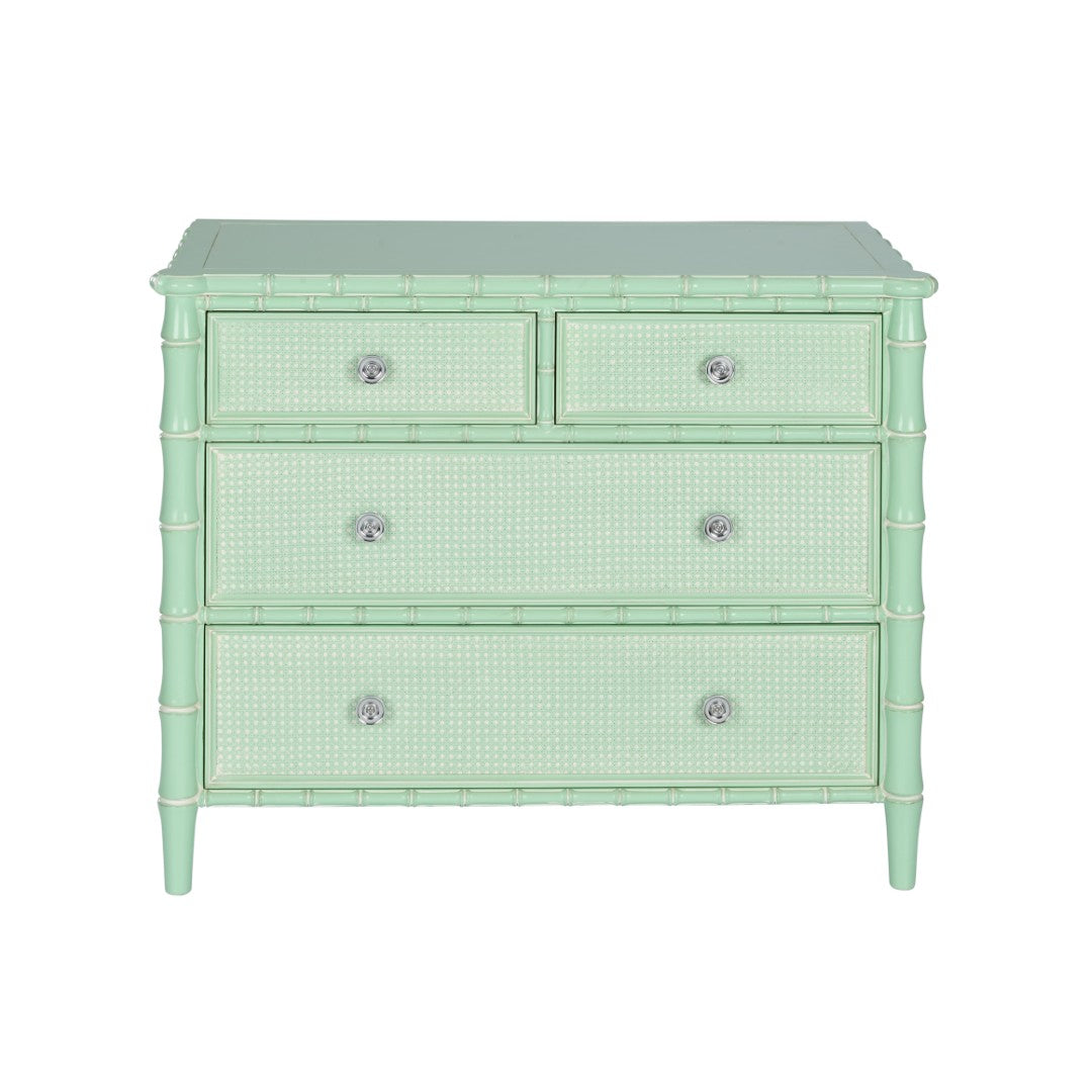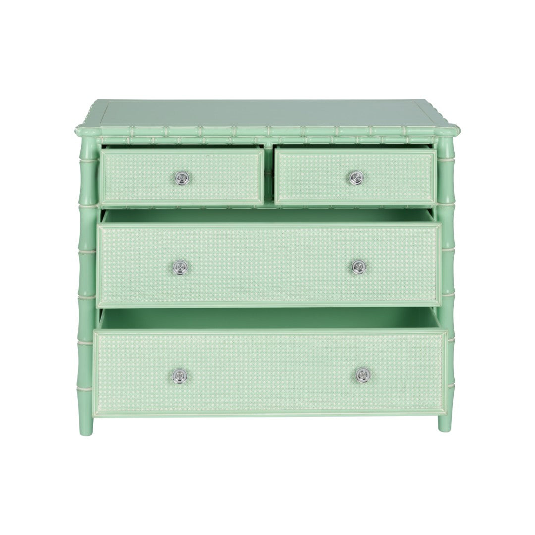 Brighten your coastal living space with this elegant four-drawer chest, designed to evoke breezy seaside charm with refined materials and thoughtful details. The Gutshall chest pairs a bamboo-inspired frame and woven caning drawer fronts with satin nickel hardware for a sophisticated, beach-house look that works equally well as an entryway accent or a focal piece in a waterfront living room. Note: not intended for clothing storage.