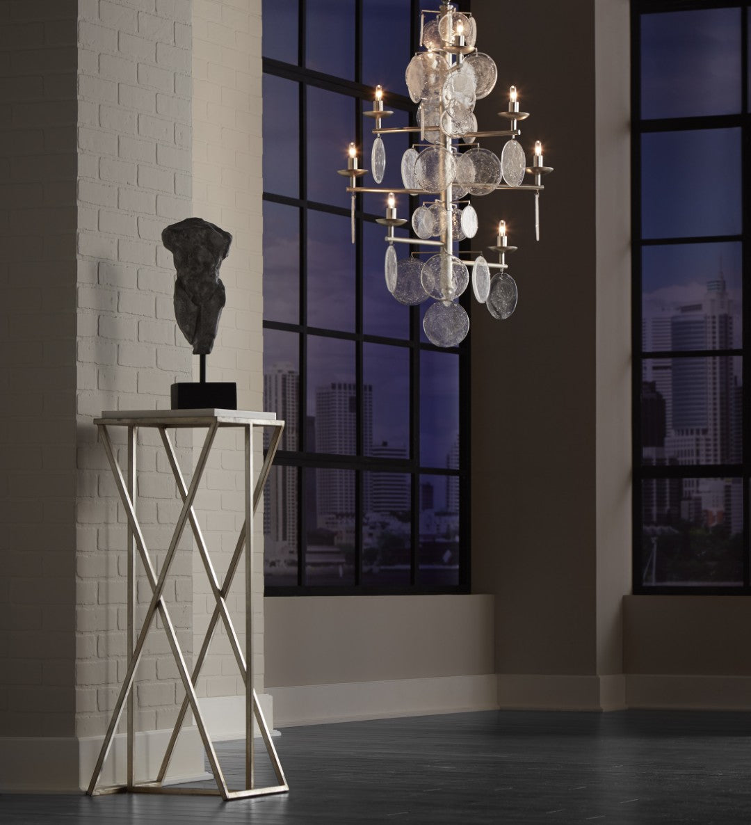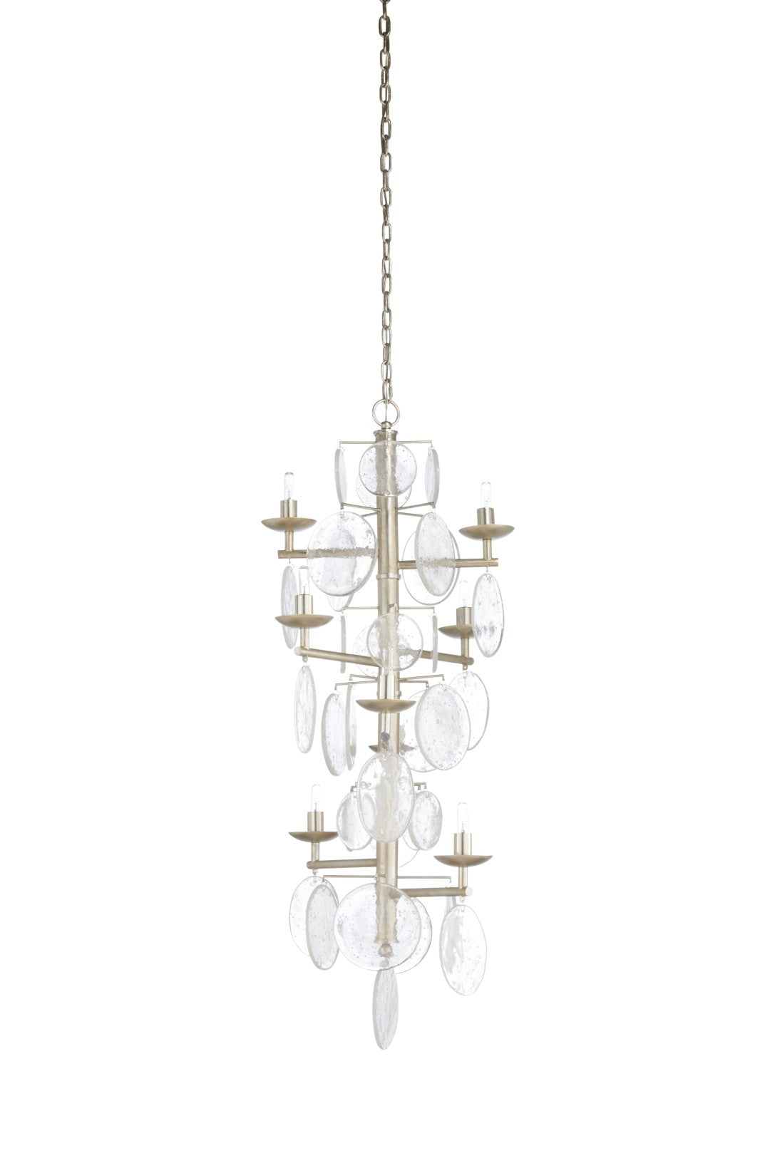 Elevate your space with the Liza Chandelier — a vintage-inspired centerpiece that blends classic elegance with subtle modern flair. Hand-finished in silver leaf over iron and accented with cast glass hanging discs, this chandelier creates a luminous focal point that complements traditional and contemporary interiors alike. Ideal for dining rooms, entryways, or living areas where you want impactful style and refined detail.