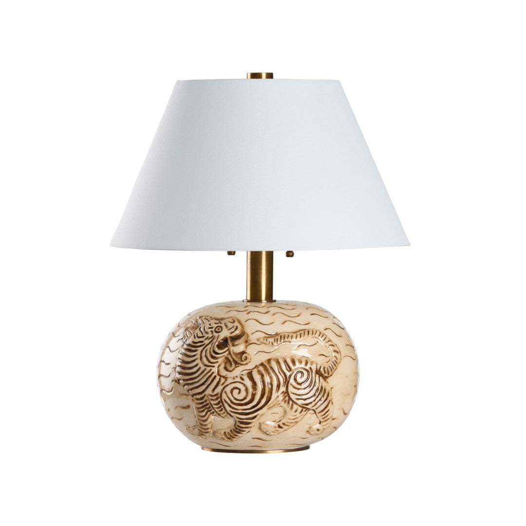 Bring striking, worldly character to your decor with the Tibetan Tiger Lamp — a sculptural accent that blends traditional Tibetan motifs with contemporary finishing. The hand-glazed ceramic body features a boldly rendered tiger design, complemented by antique brass details and a soft white tapered shade that casts warm, inviting light. Ideal for living rooms, bedrooms, or entryways, this lamp serves as both functional lighting and a conversation-starting piece of art.