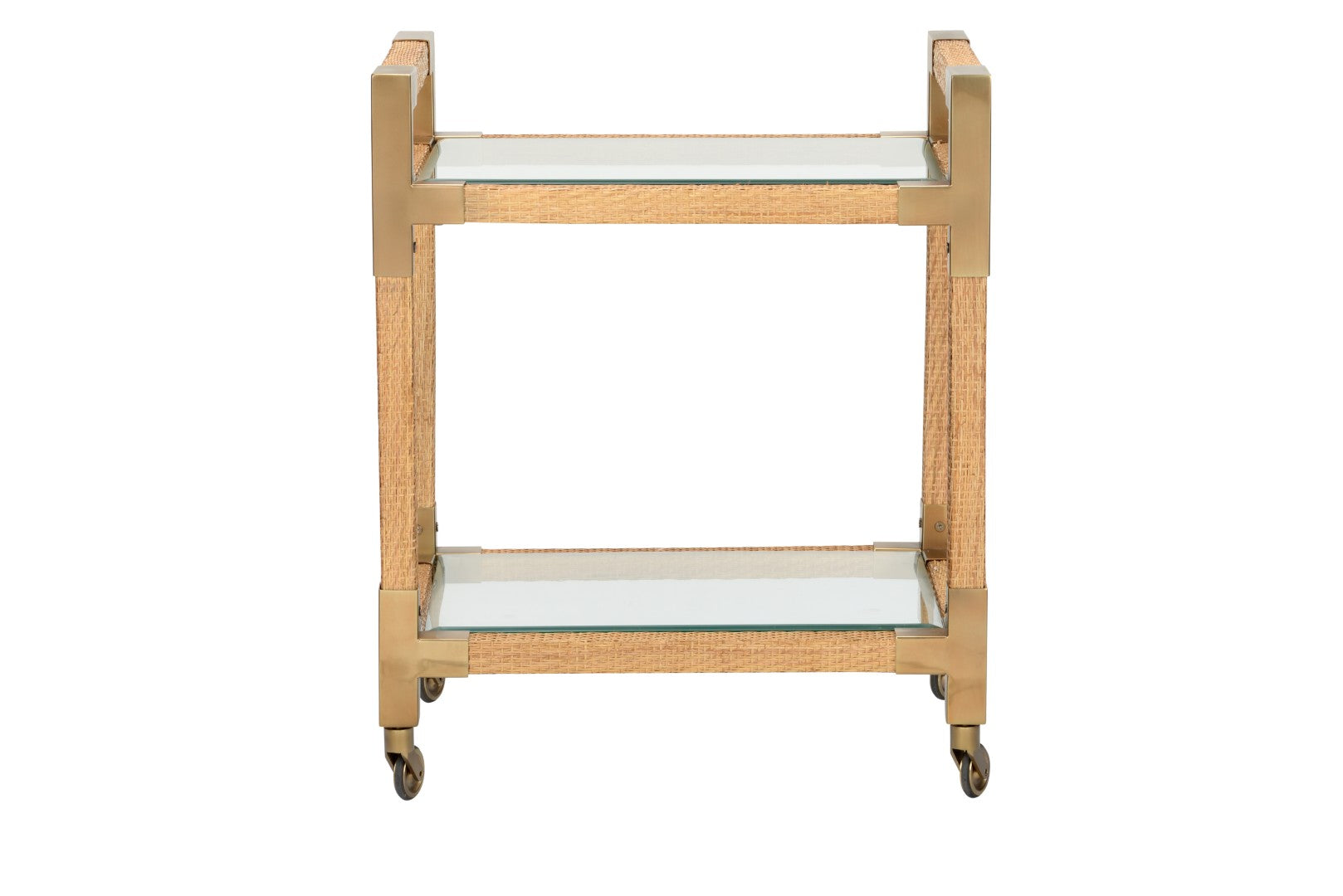 Bring effortless entertaining anywhere in your home with this versatile bar cart that blends coastal-modern style and practical mobility. Natural woven cane and bronze-finish corner brackets create a warm, sophisticated look while two glass shelves and smooth casters make serving and display simple.
