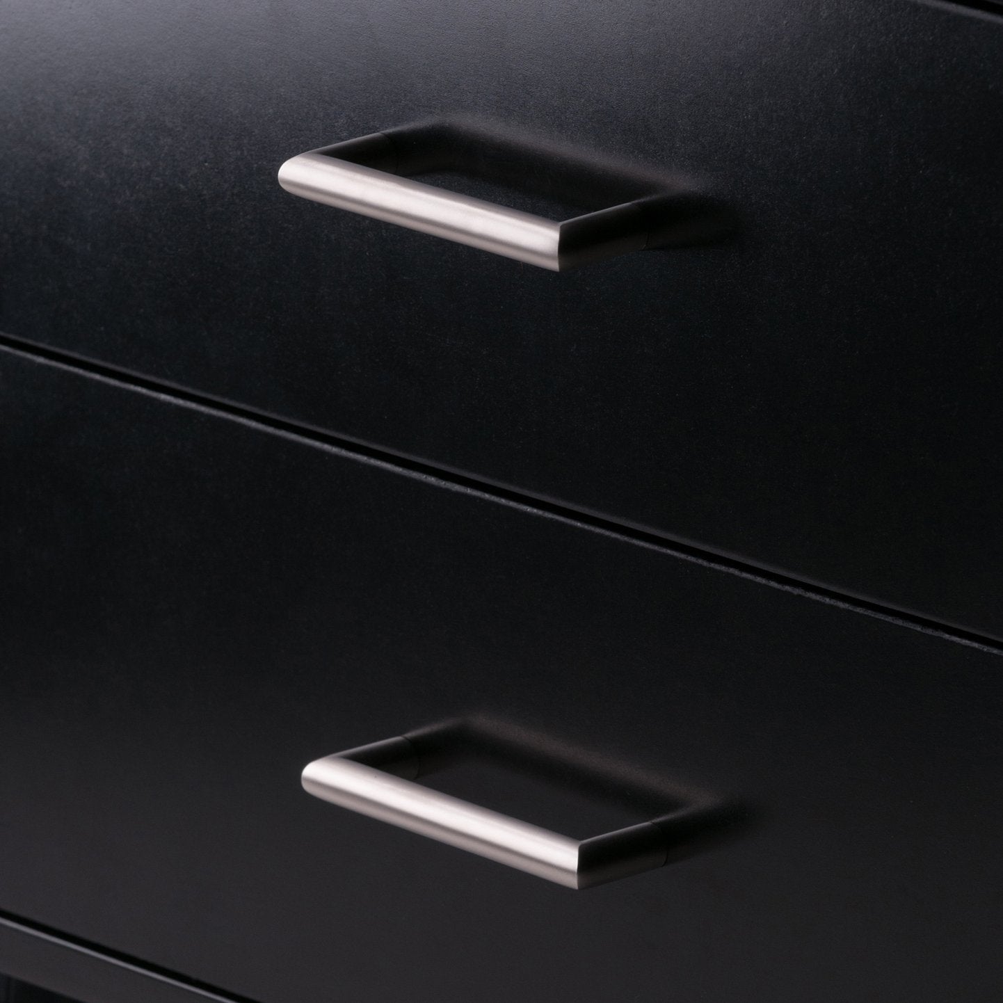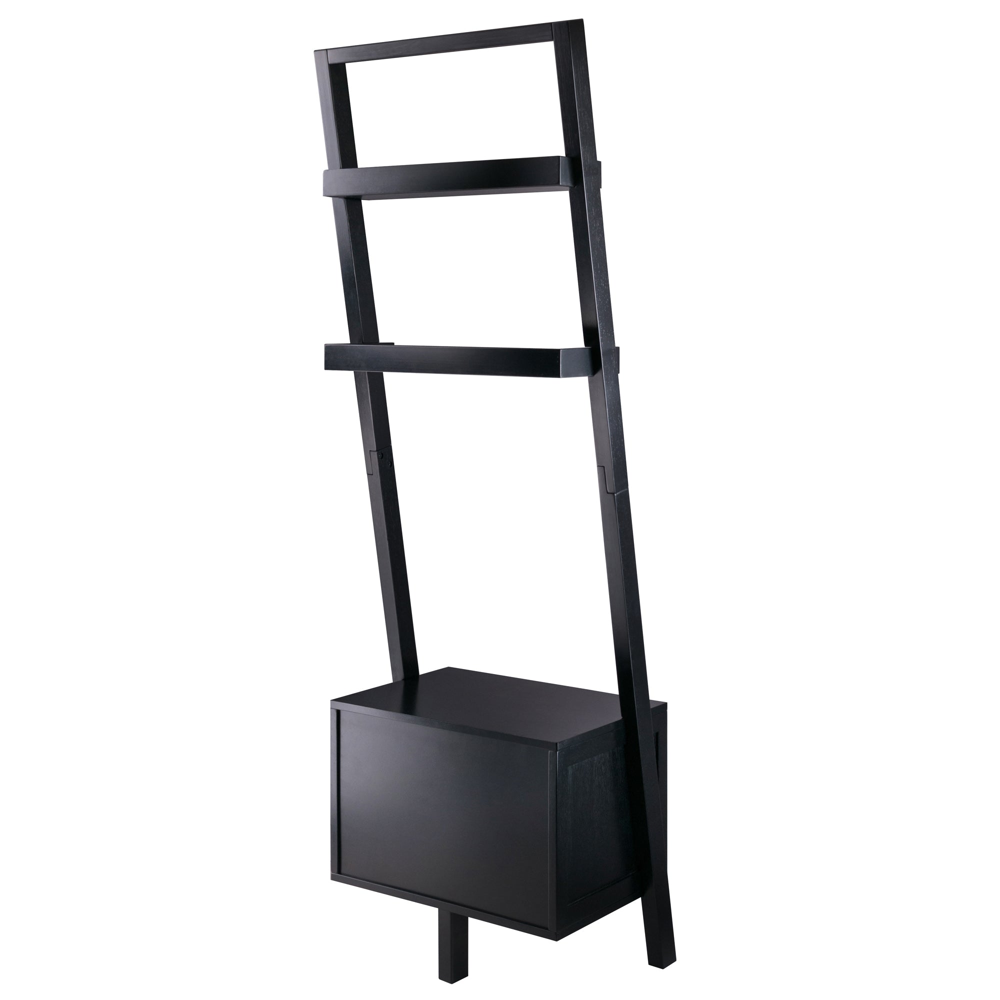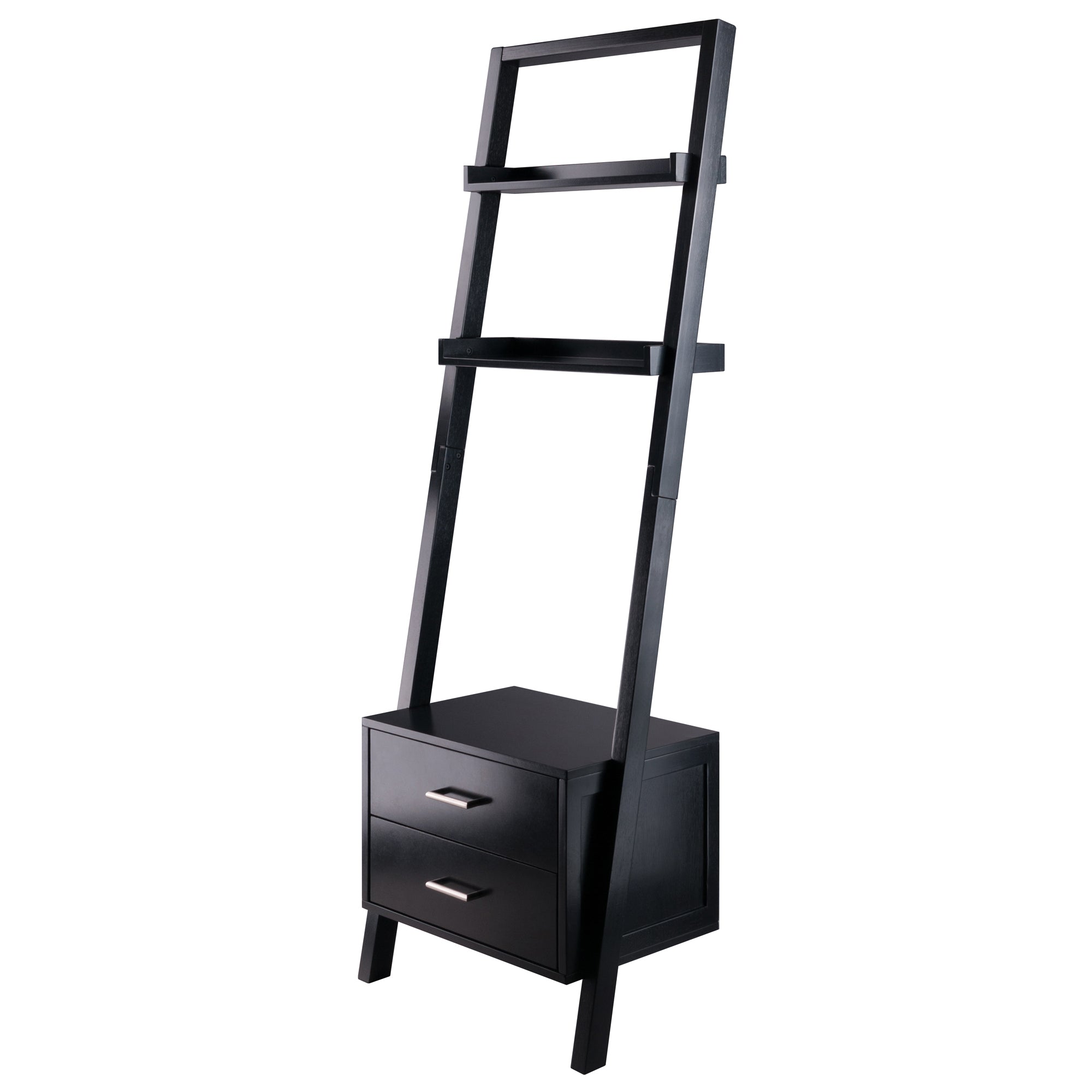 Finished in a sleek Black, the Bellamy Leaning Shelf with Drawers offers space-saving storage with a contemporary slanting silhouette. It has 2 tiered shelves for books, photos or collectibles and 2 large drawers for additional storage. Ideal for apartments and smaller rooms. Made of Solid and Composite Wood for long-lasting integrity. Tip resistant hardware is included.