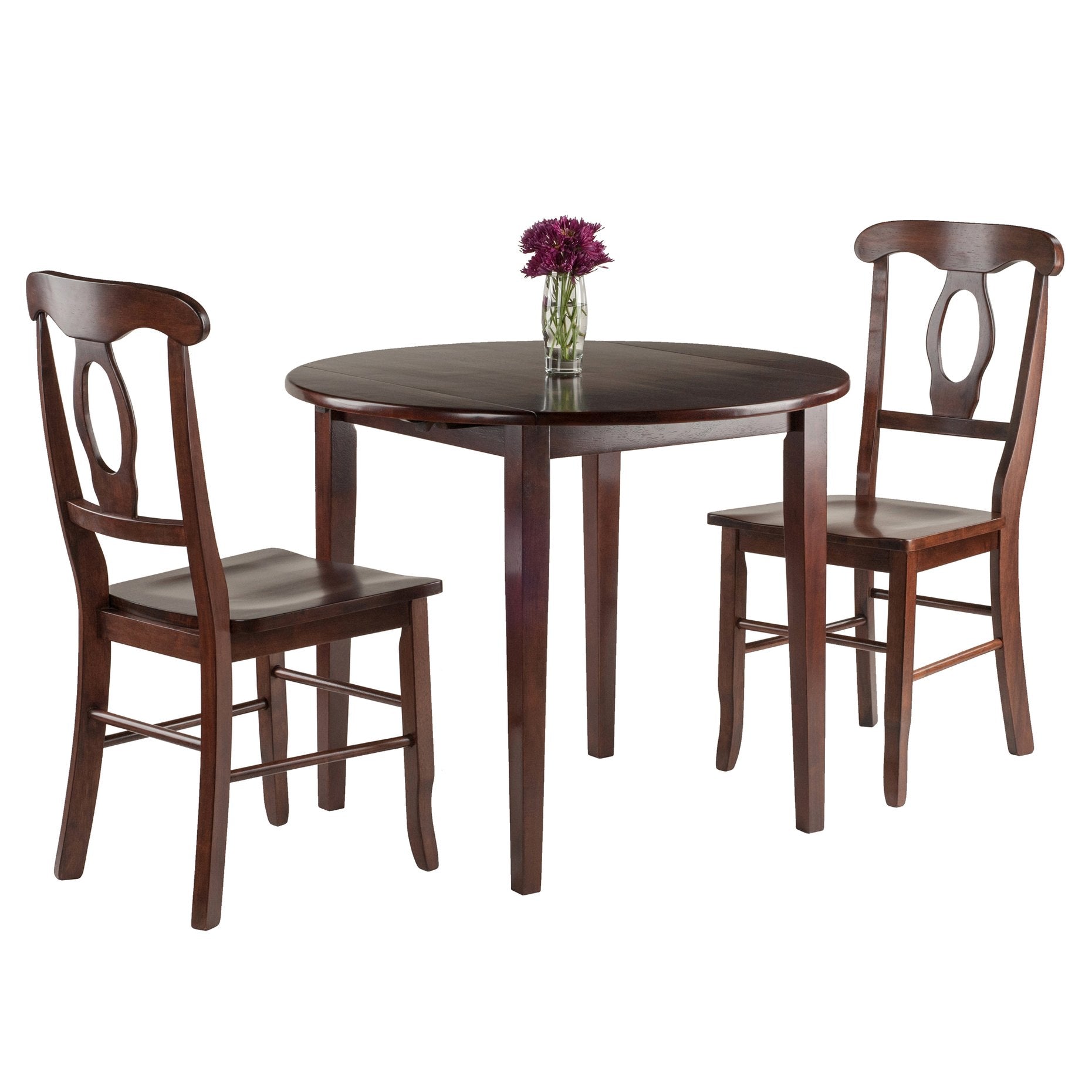 Simplicity and versatility define this 3-piece Clayton Round Drop Leaf Table Set. The table has two drop leaves for added surface space. With two Renaissance chairs, the set brings a touch of French country farmhouse to your dining area or kitchen. It's also an ideal addition to the family room or for use as an extra workspace. Lower one or both leaves to create the size that's right for you. The chairs feature an elegant keyhole back design and the contoured seats provide comfortable seating. Constructed of solid and composite wood and are fininshed in a rich Walnut