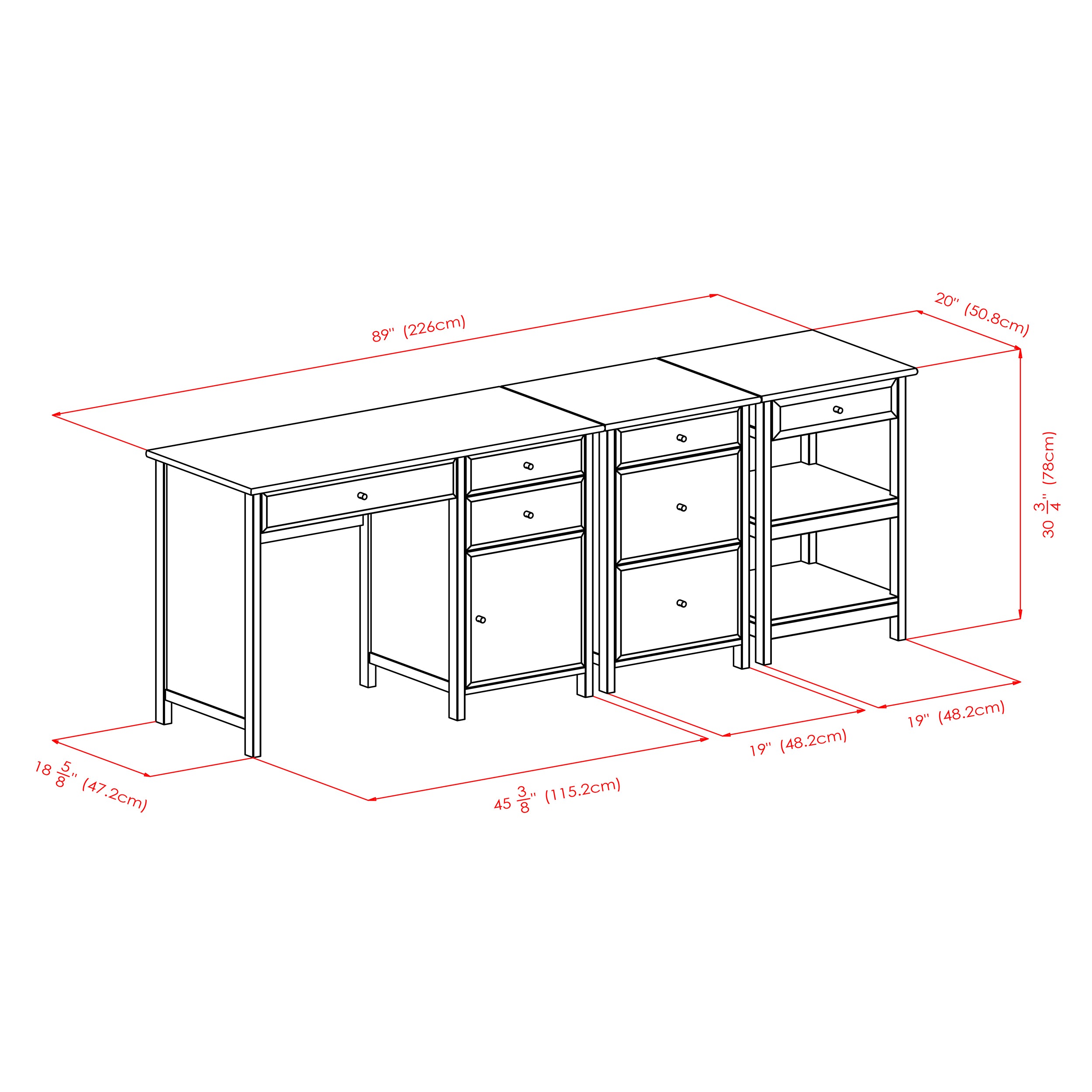 - Provides a complete home office with 7 drawers, a cabinet, and 2 open shelves
