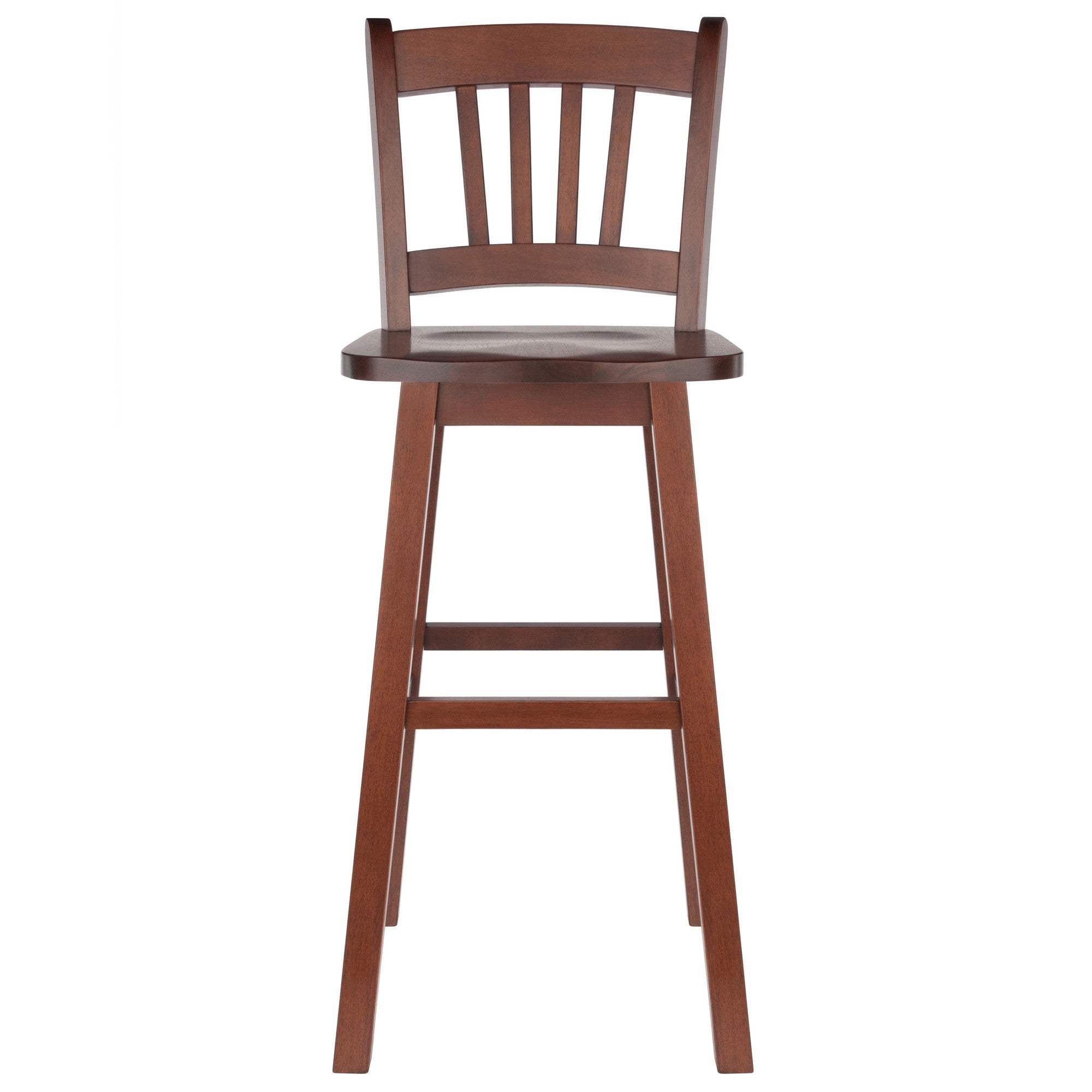 Classic design and Solid Wood are the hallmarks of the 29"H Fina Swivel Seat Bar Stool. The gentle arc of the slat back, sturdy squared legs with cross-supports to use as footrests, and a contoured seat that swivels 360 degrees add the finishing touches. A perfect seating choice for your kitchen, breakfast nook, or living room. Finished in a rich Walnut, with weight capacity up to 220 lbs.