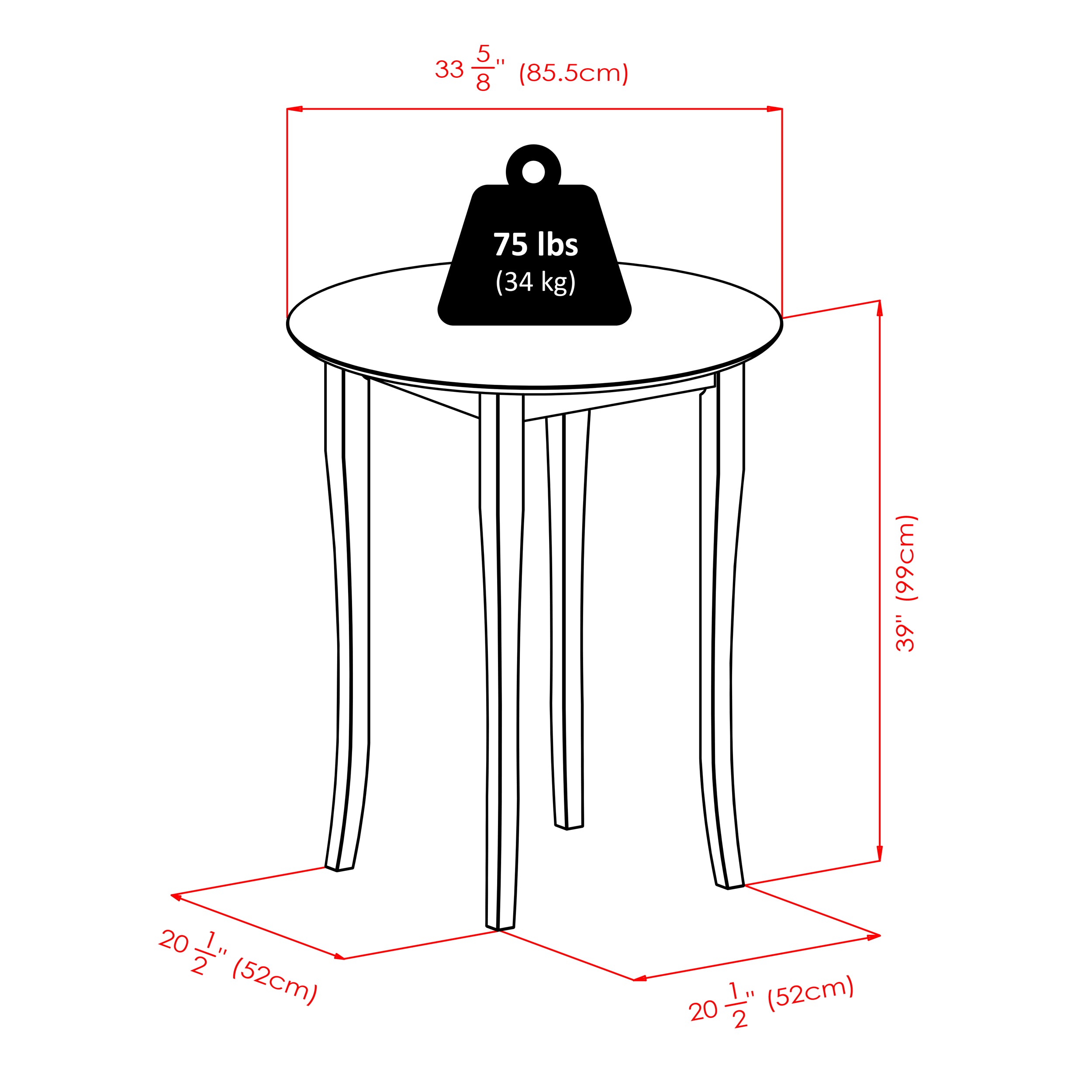 - The round table will accommodate up to four chairs. Table set up size is 33.66"W x 33.66"D x 38.98"H.