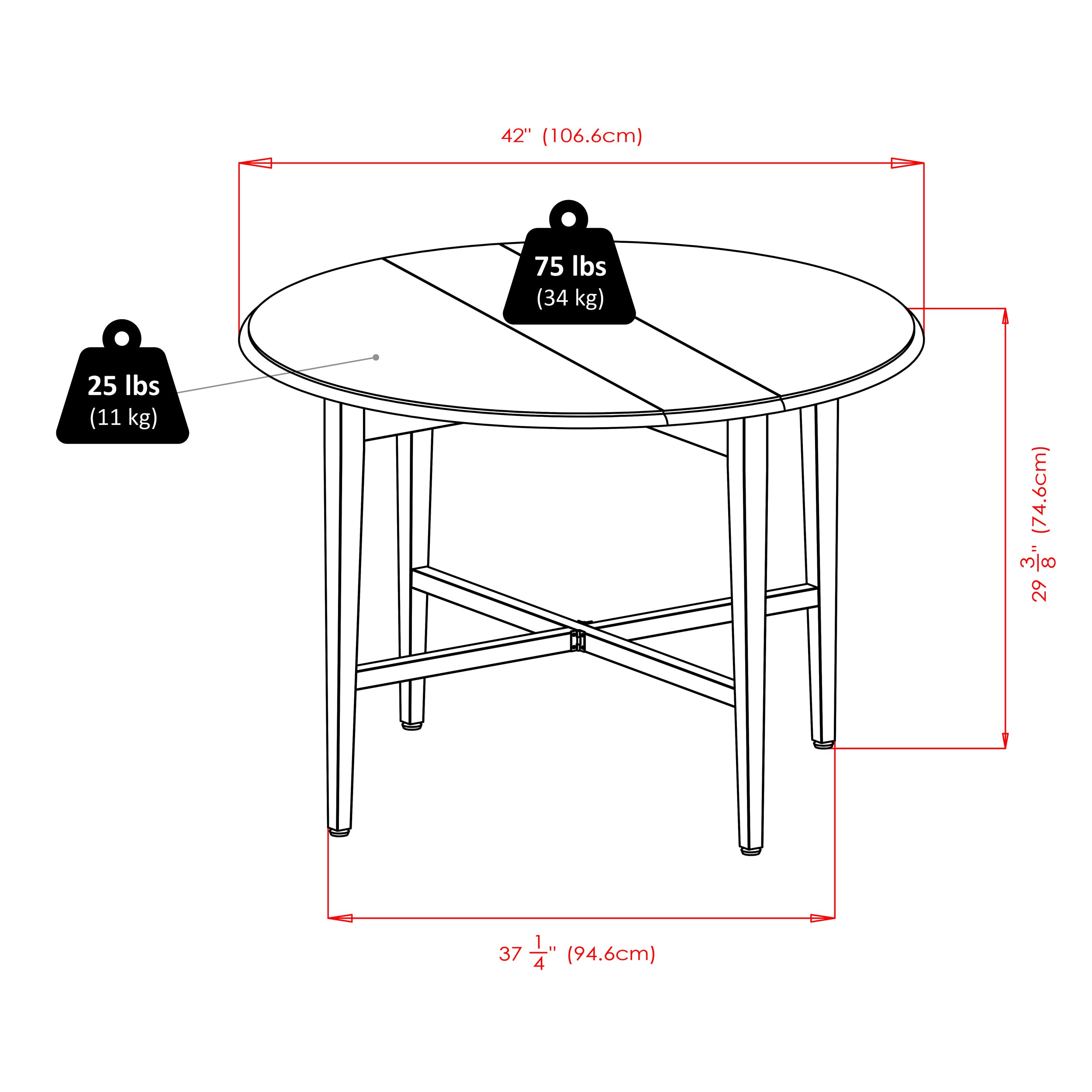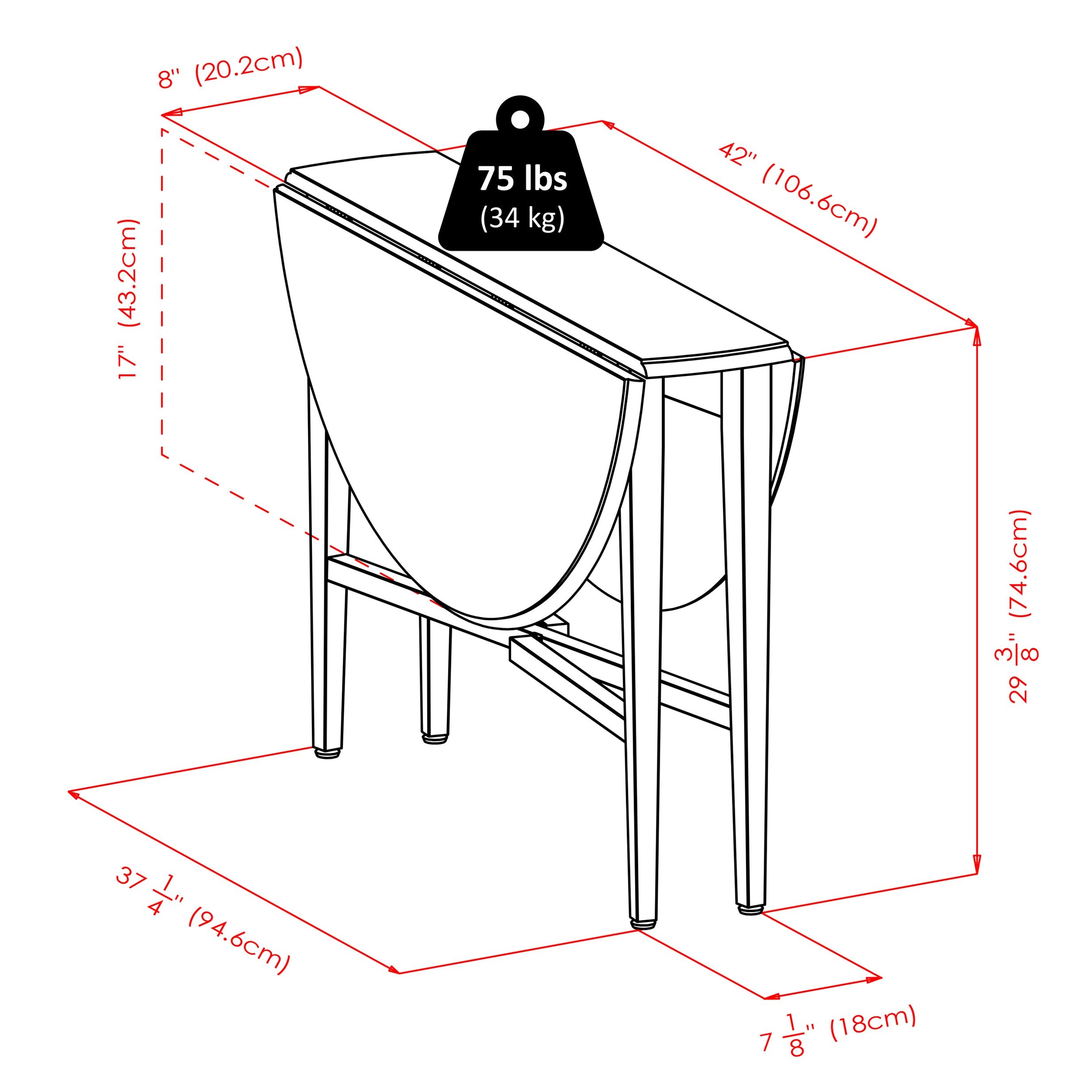- Overall Fully Open table size is 42" Round x 29.50 High. Each Drop Leaf size is 42"W x 17"D.