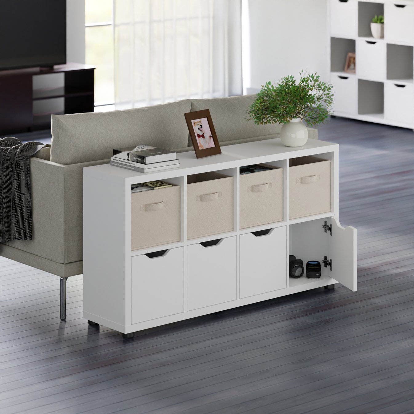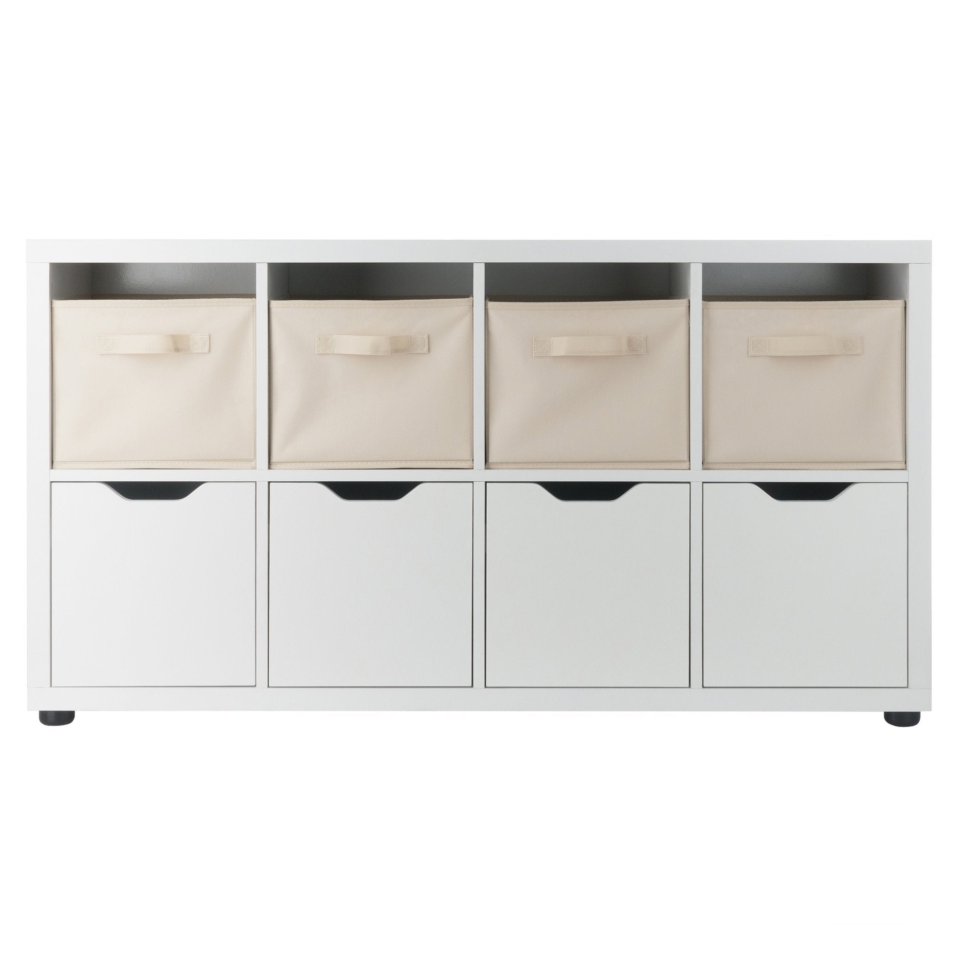 The Julian 2x4 Storage 5-Piece Cabinet Set by Winsome Wood is the answer to any and all organizational needs. With a total of 9 spacious compartments, the cabinet is ideal for a mudroom, garage, craft area, family room or kids' bedrooms. Use all the compartments for storage, or combine them with display in the open cubbies. The unit comes with a set of 4 foldable baskets in a complementary beige color, providing yet more way to keep clutter out of sight. Made of sturdy composite wood, the cabinet has a clean, white finish and comes with attachable rubber feet to prevent floor scratches.
