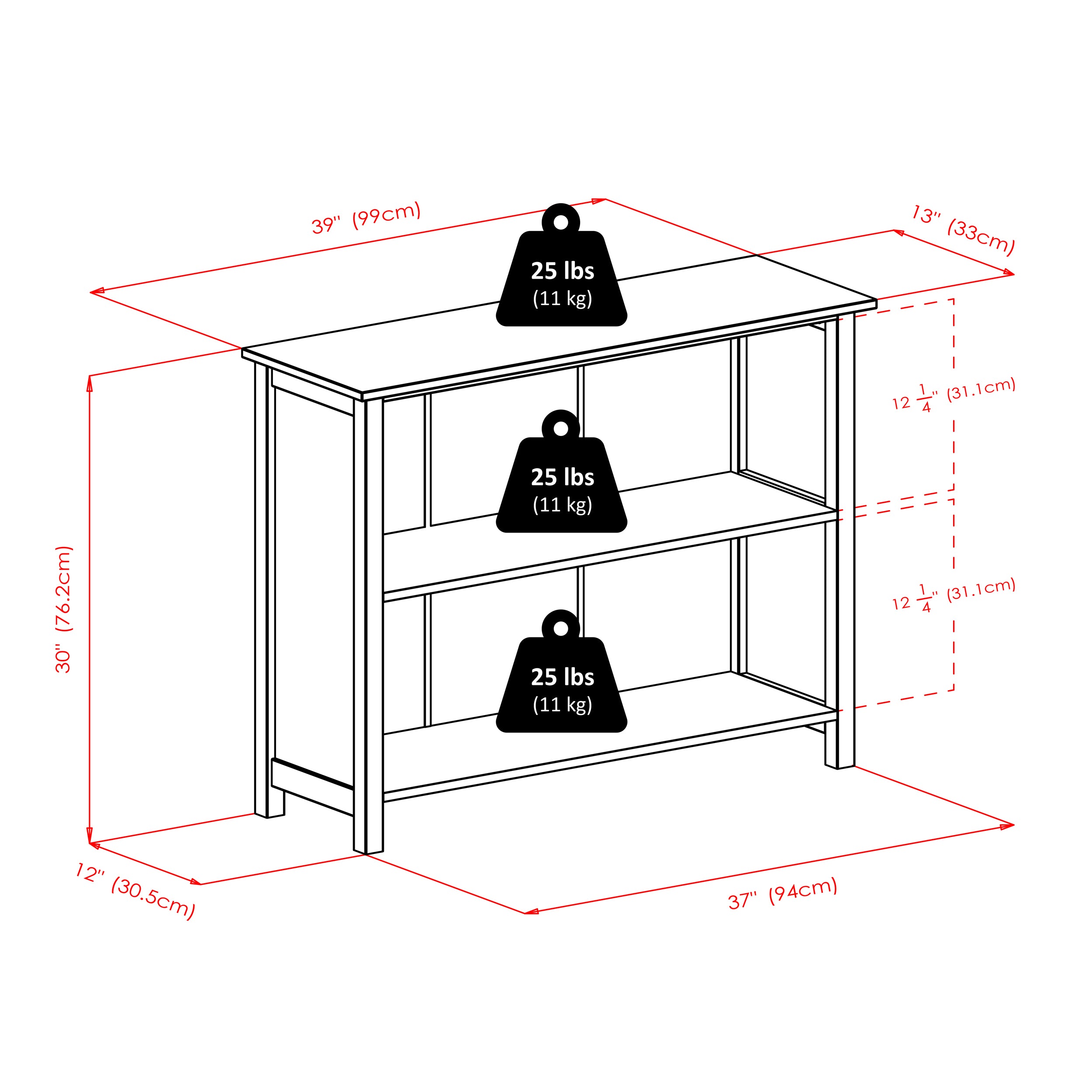 - Wide 3-Tier Shelf assembled dimension is 39"W x 13"D x 30"H. Shelf top surface is 39"W x 13"D.