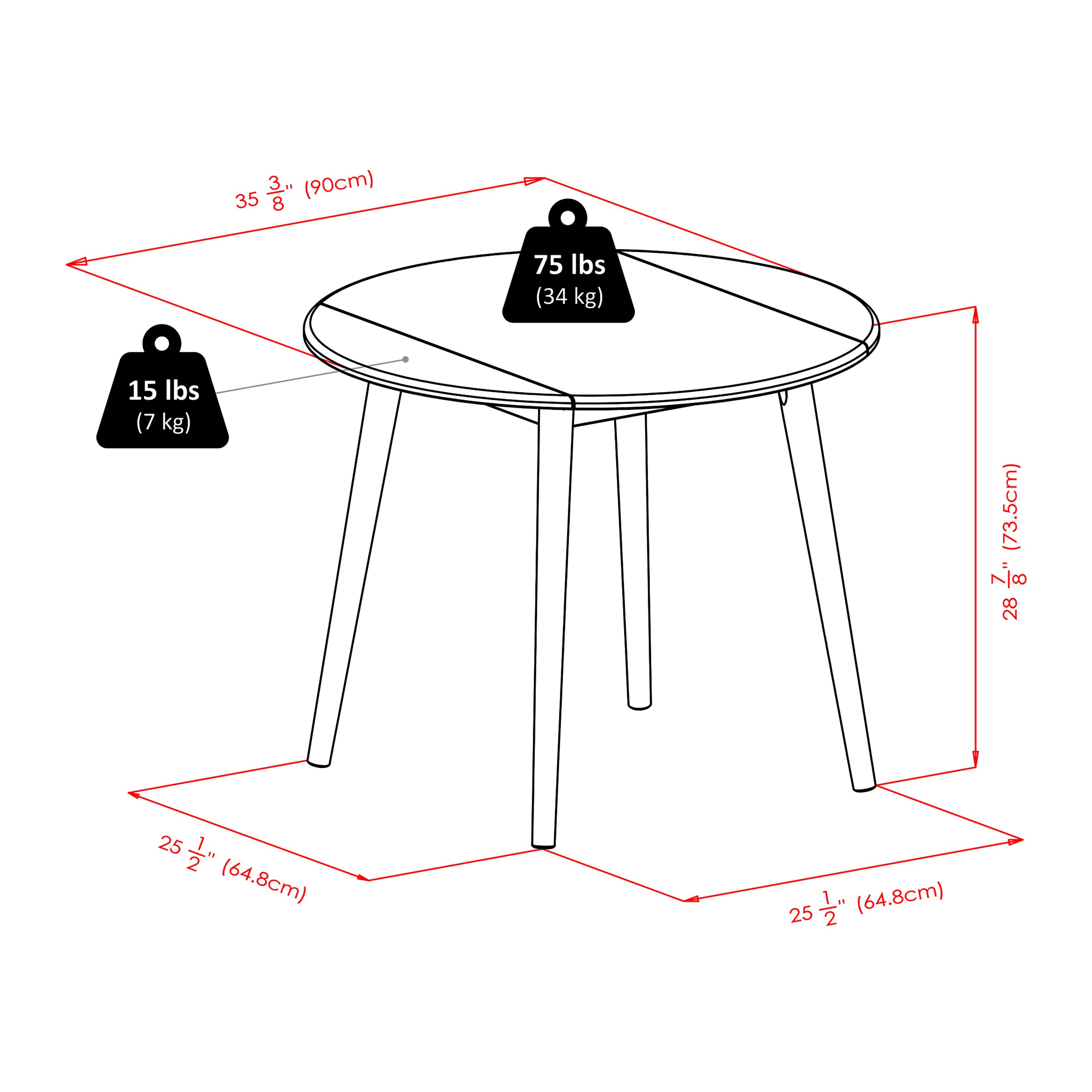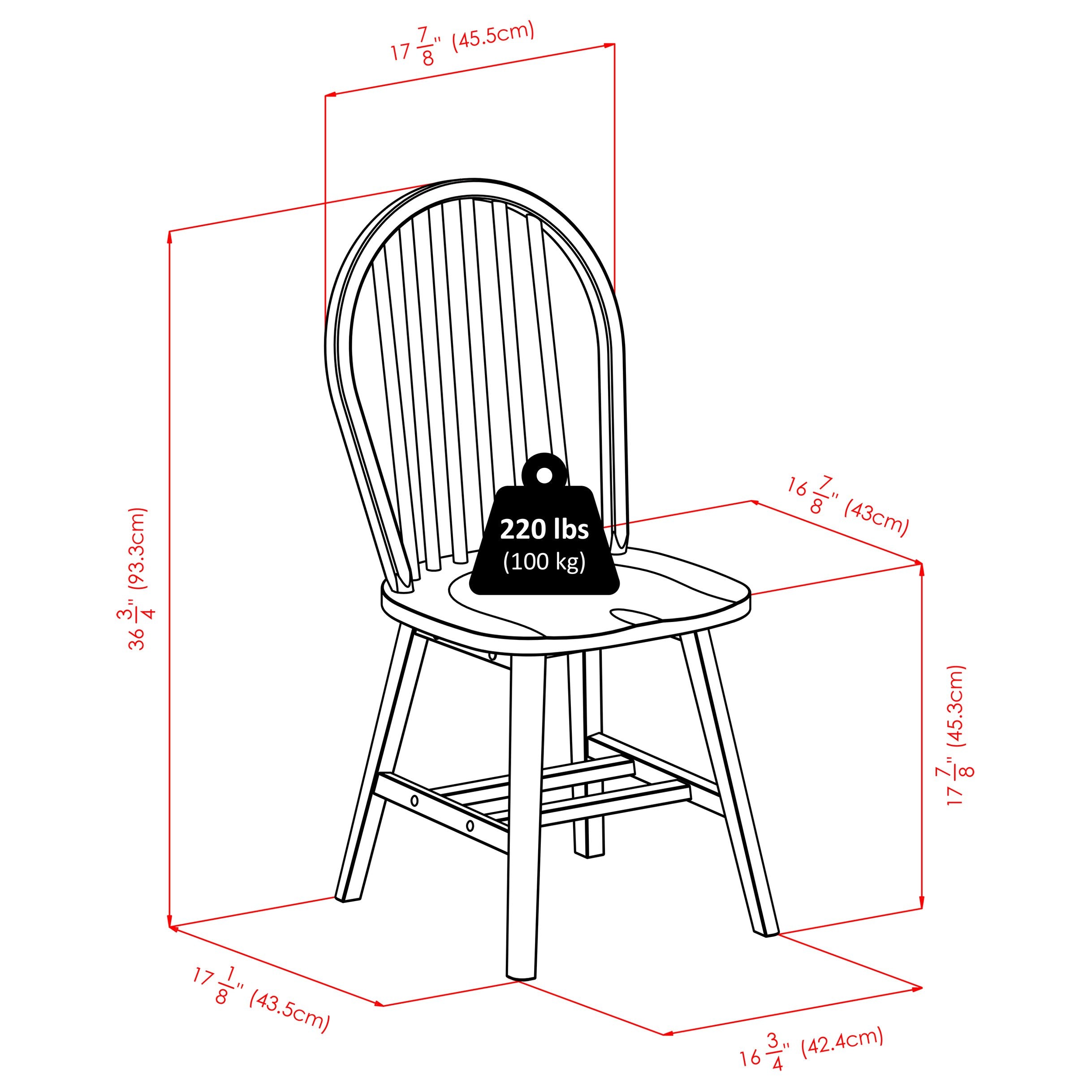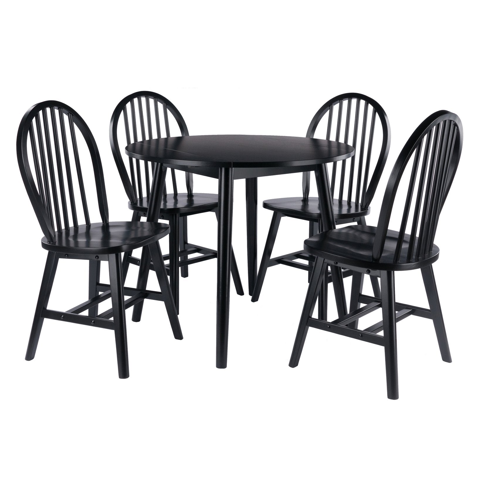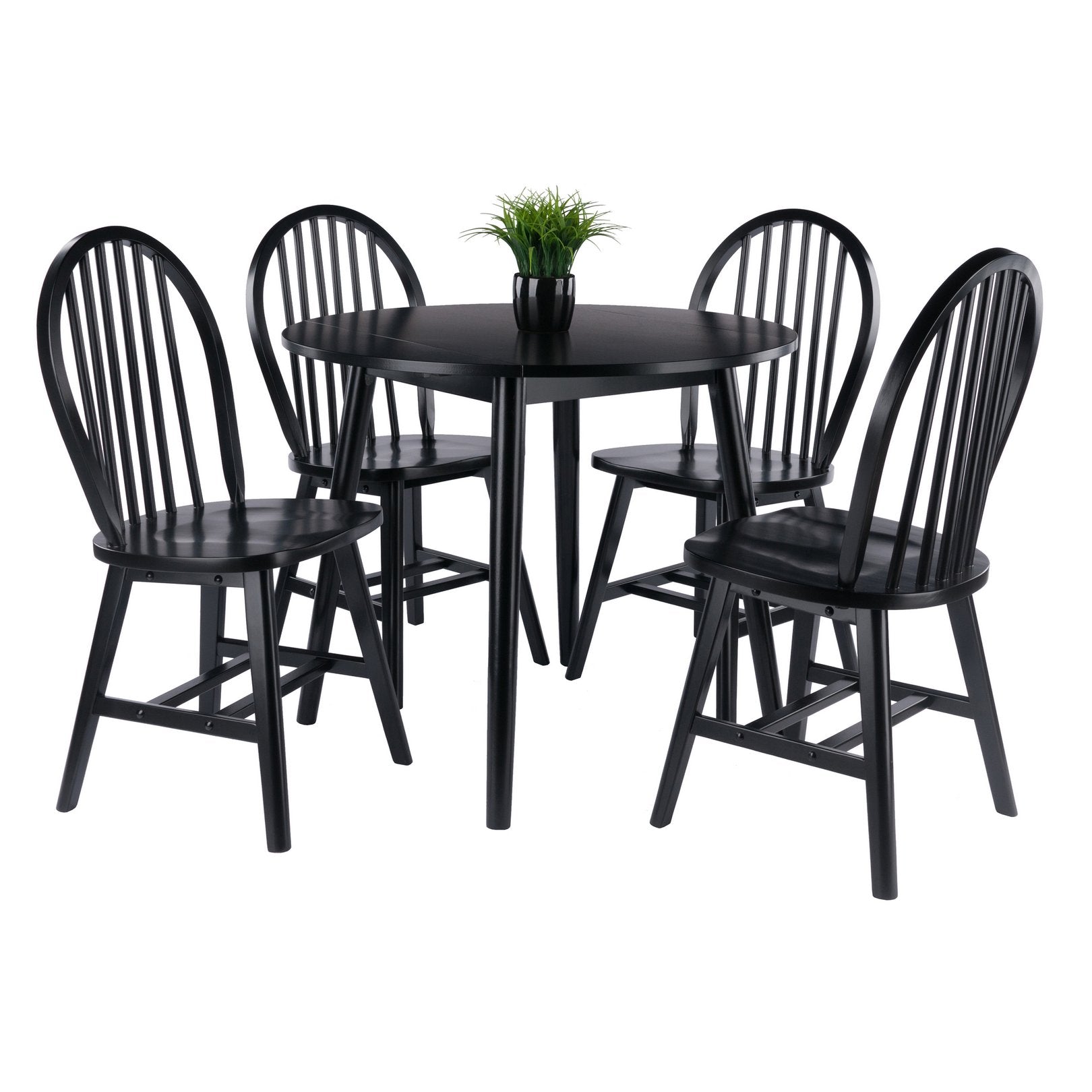 Bring charm and a compact footprint to your dining area with the Moreno 5-Piece Round Drop Leaf Table with Windsor Chairs. Featuring two drop leaves, the table expands to 36" in diameter, perfect for seating up to 4 for a casual brunch or intimate dinner. With the leaves folded, use the table as a sideboard for extra storage or display. Made of Solid Wood, the chairs have comfortable, contoured seats and sturdy, double cross-bar leg support. The set is finished in a lustrous Black.