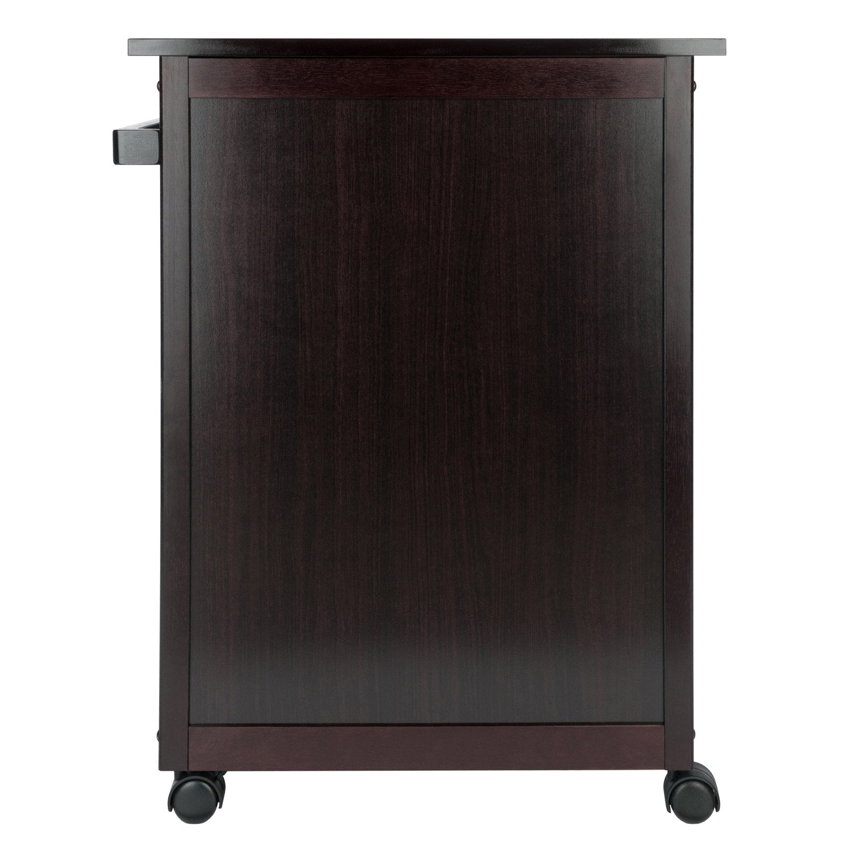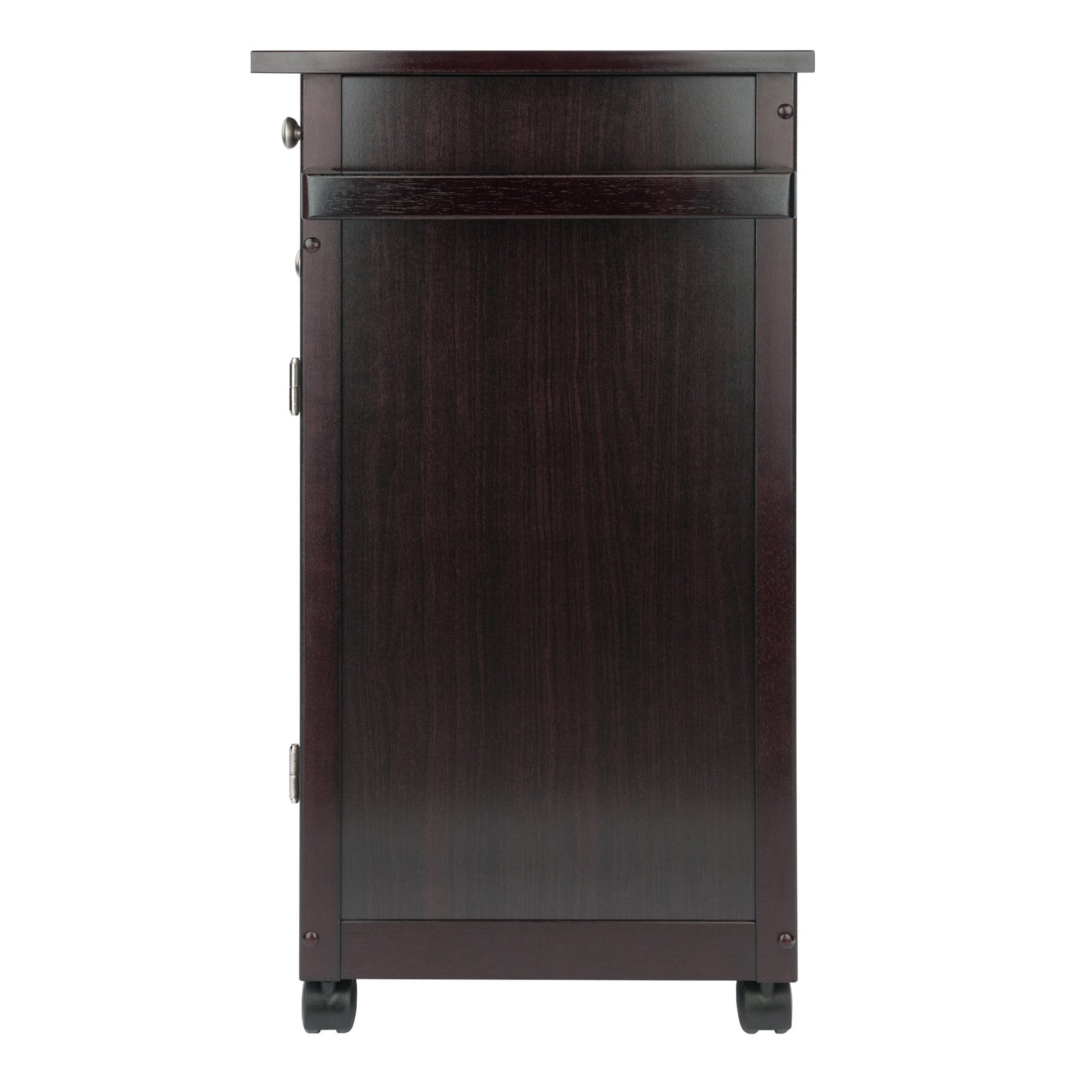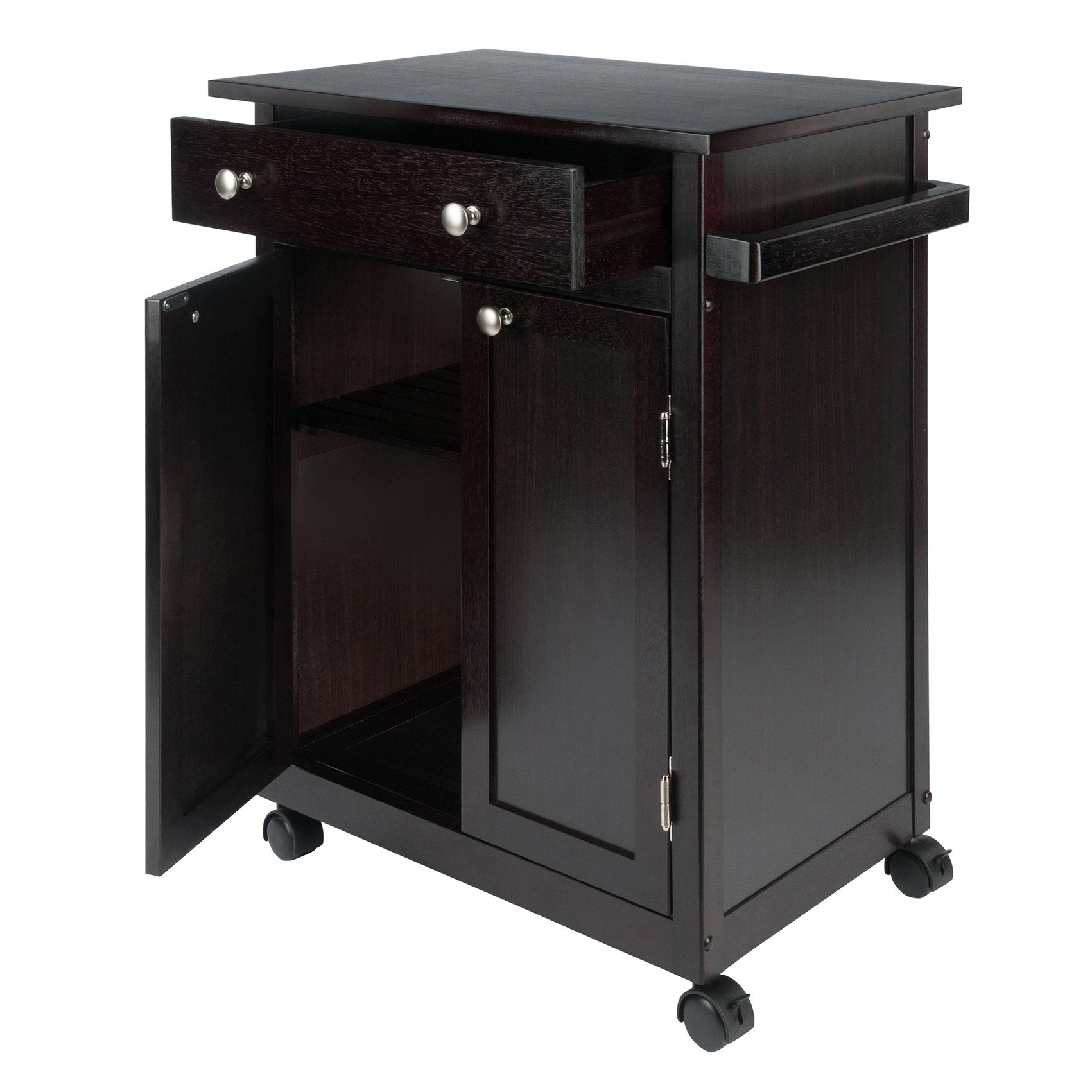 Savannah Kitchen cart has one large drawer, double doors opens to a cabinet with one fix slated shelf and bottom shelf for storage. Accent with metal knobs. Perfect extra working space in your kitchen. Easy to move around with four casters.