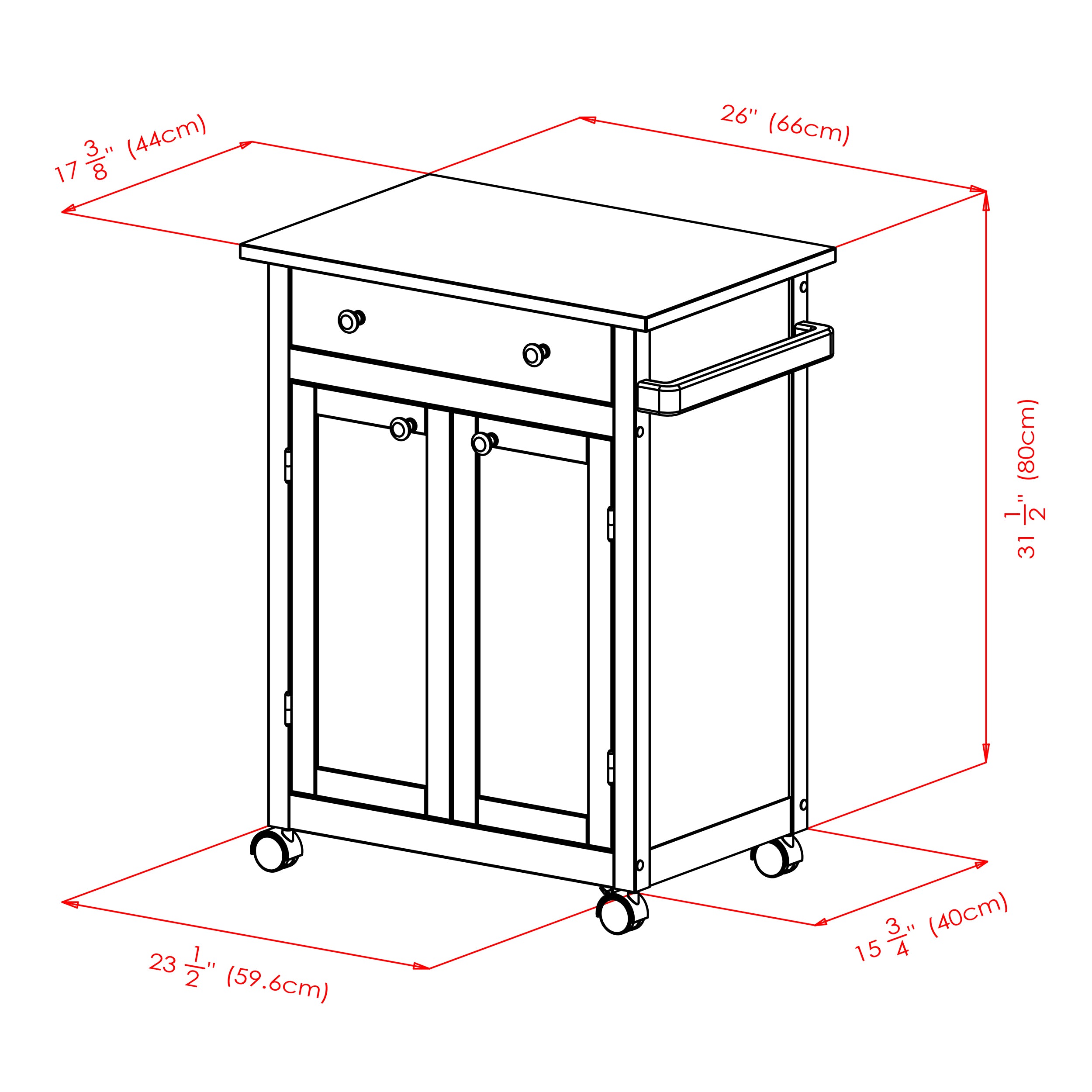 - Cart Top surface is 25.98"W x 17.32"D. Overall cart size is 27"W x 17.7"D x 34"H.